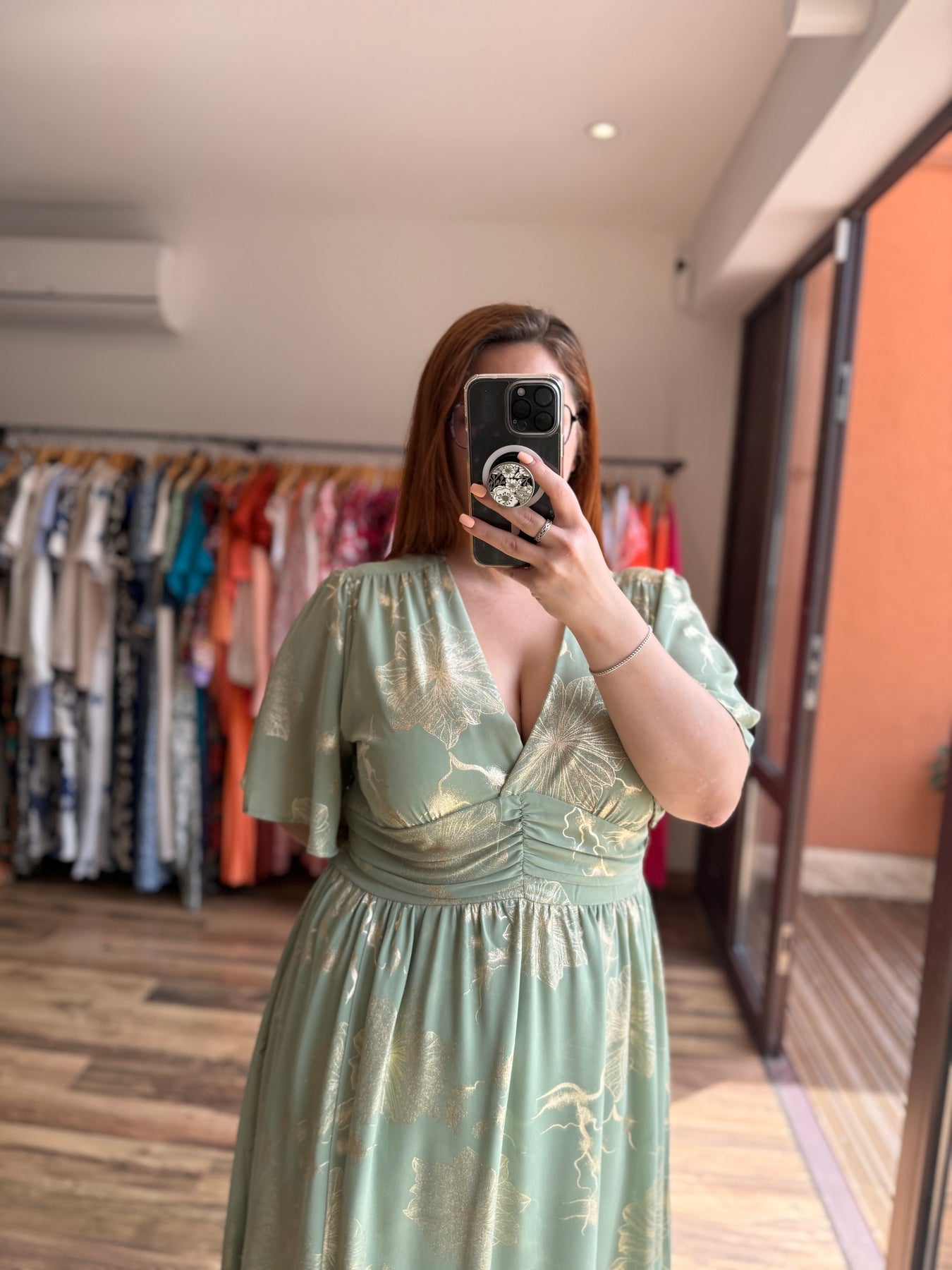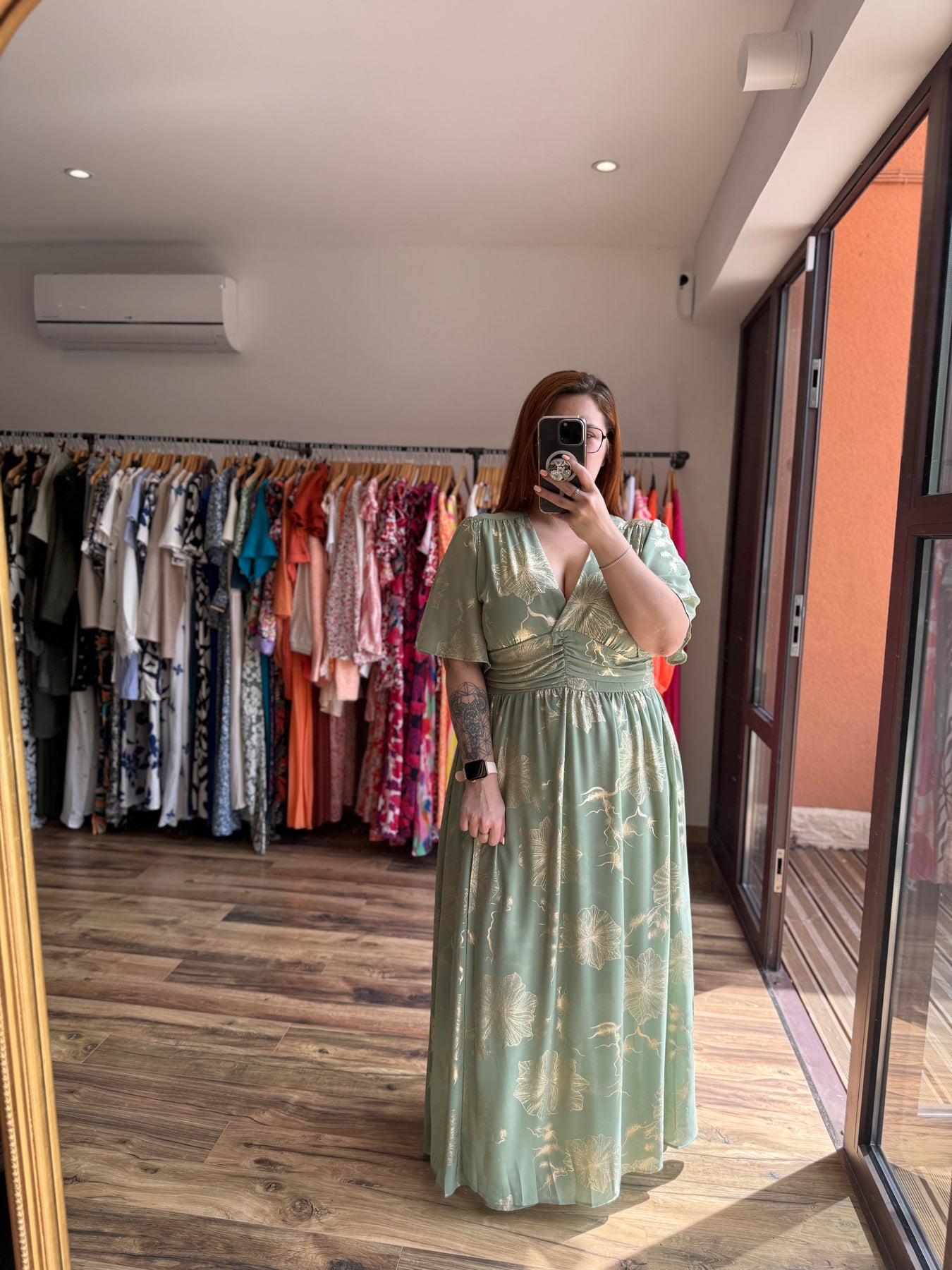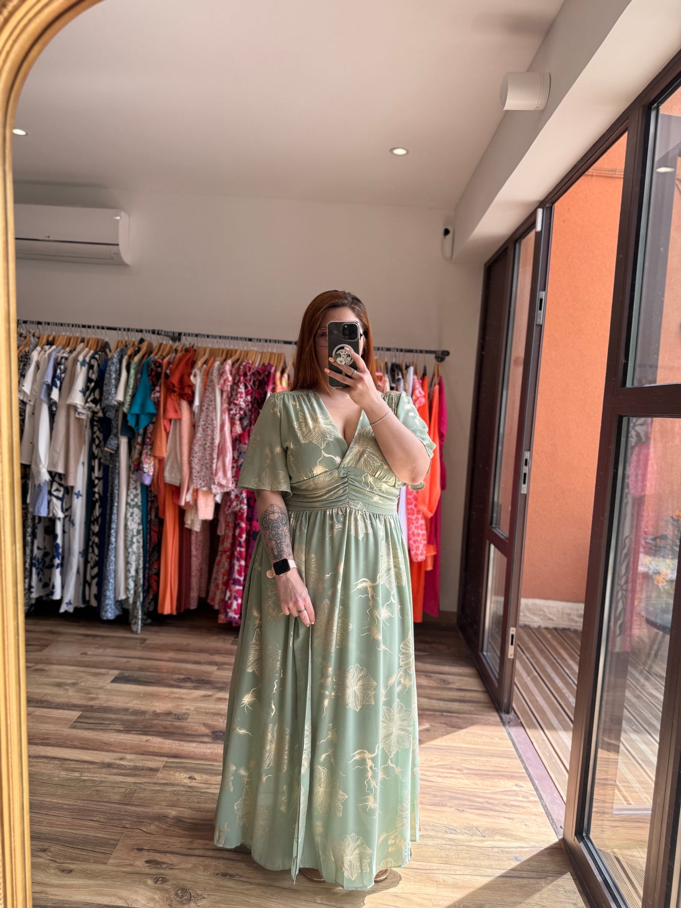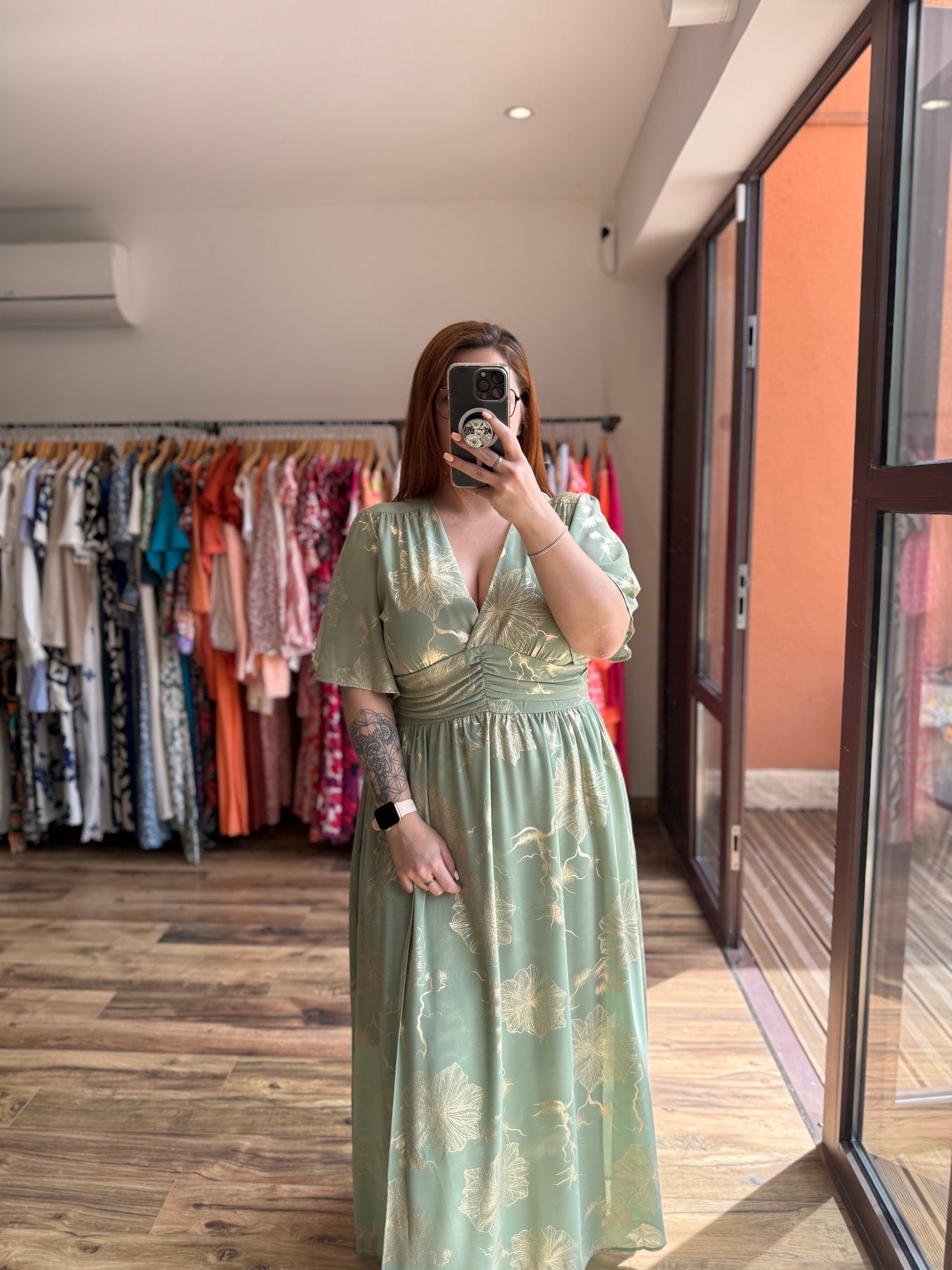 Robe longue Salema curvy – Vert sauge & reflets dorés délicats (tailles 40 au 48)