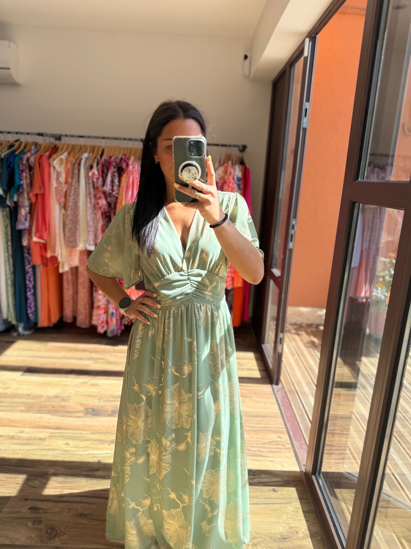 • Robe longue fluide vert sauge avec motifs floraux dorés
