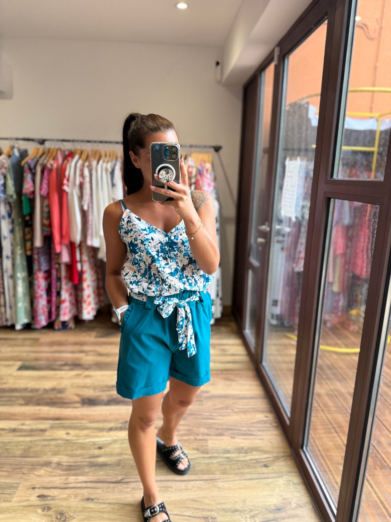 Un short aussi confortable qu’élégant 🌿 Avec sa ceinture fleurie et sa coupe fluide, il met en valeur la silhouette tout en restant très agréable à porter. On le mixe avec le top “Malaga” pour un look estival frais et tendance 💙