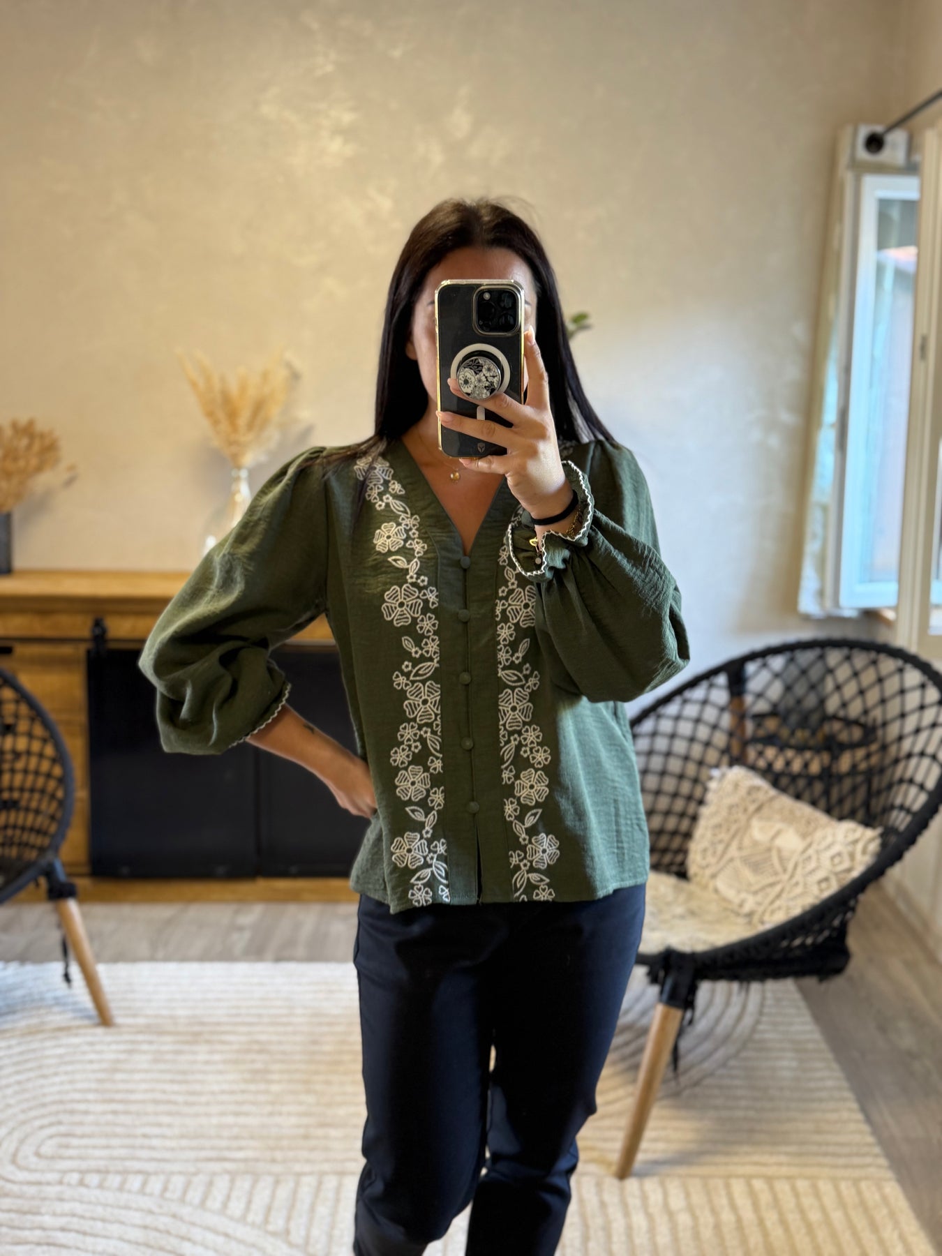 La chemise Marion combine allure bohème et élégance avec ses broderies délicates 🌸. Fluide et agréable à porter, elle s’associe aussi bien à un jean casual qu’à un pantalon habillé. Ici portée avec le pantalon Tino noir, elle crée un look chic et raffiné, parfait pour le quotidien comme pour une sortie.