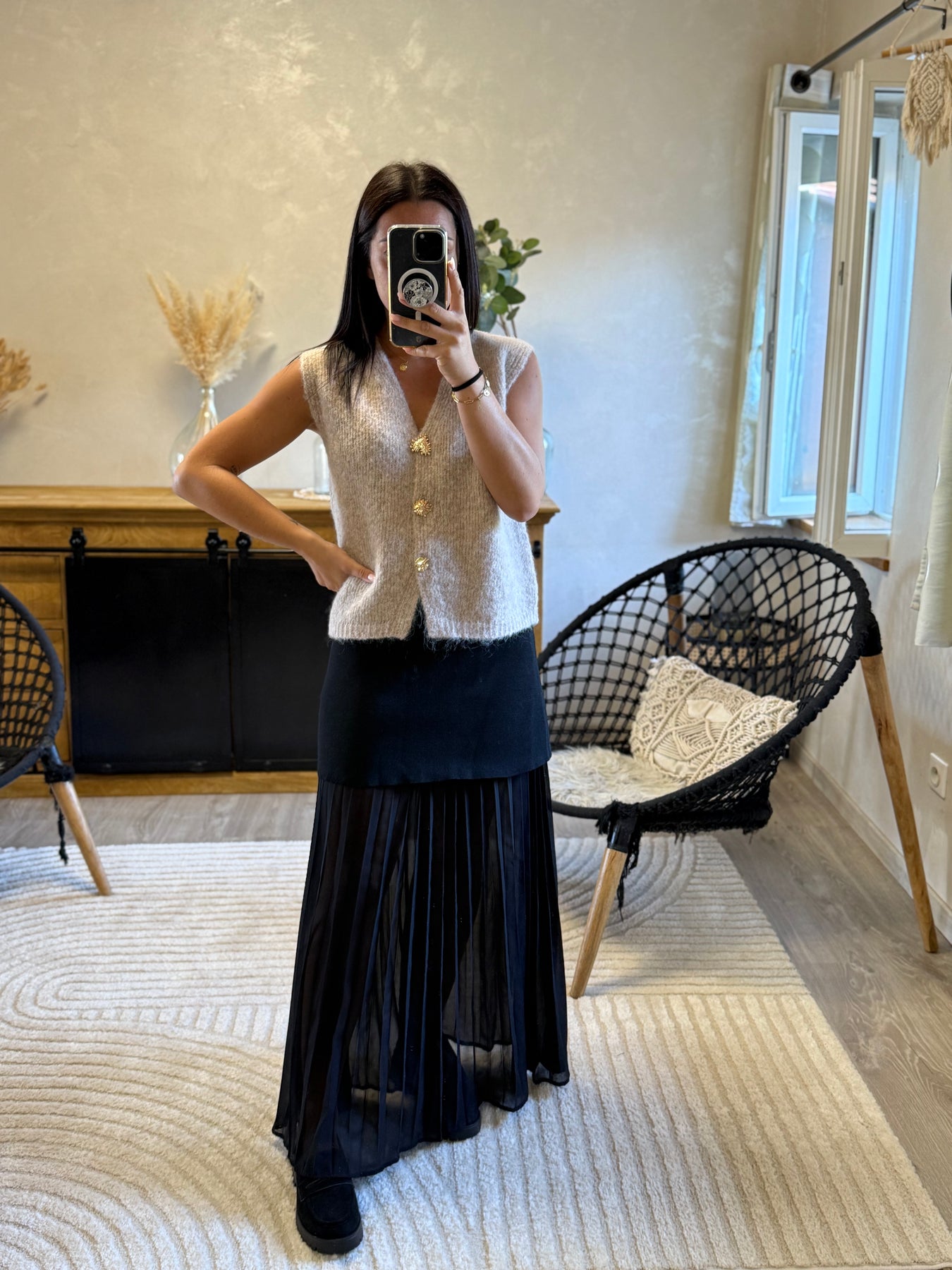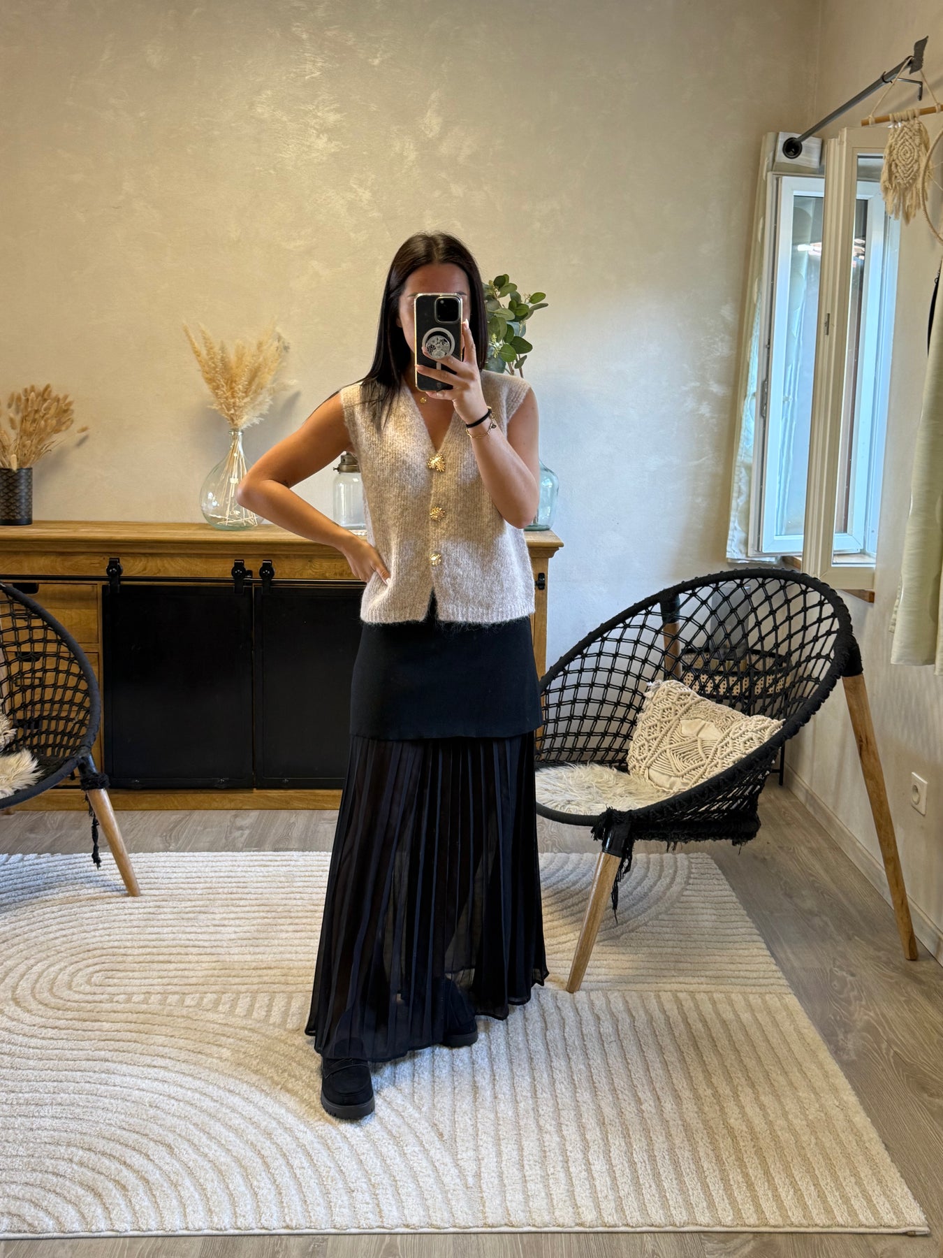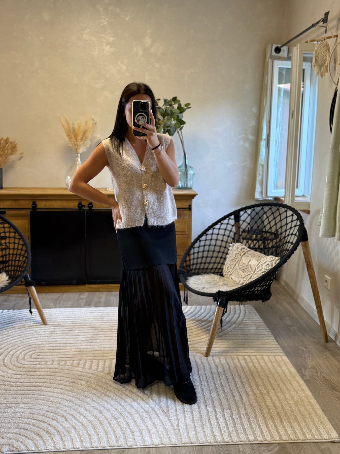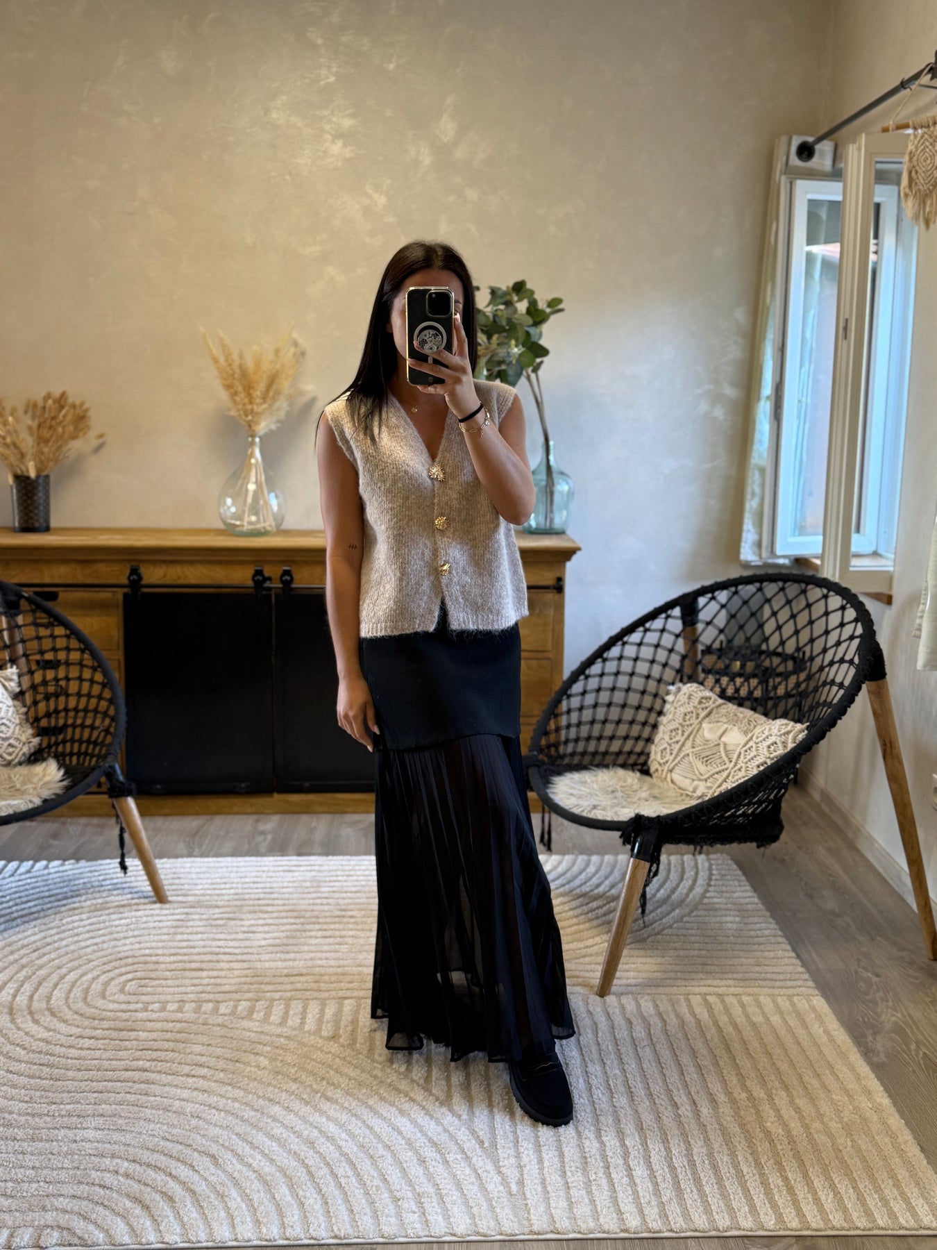 Le gilet Maga est la pièce chic et cosy parfaite pour réchauffer tes looks. Ses jolis boutons bijoux apportent une touche élégante, idéale pour le porter seul ou superposé sur une chemise ou une robe. Ici associé à la jupe Barkley, il compose un look moderne et féminin 💫.