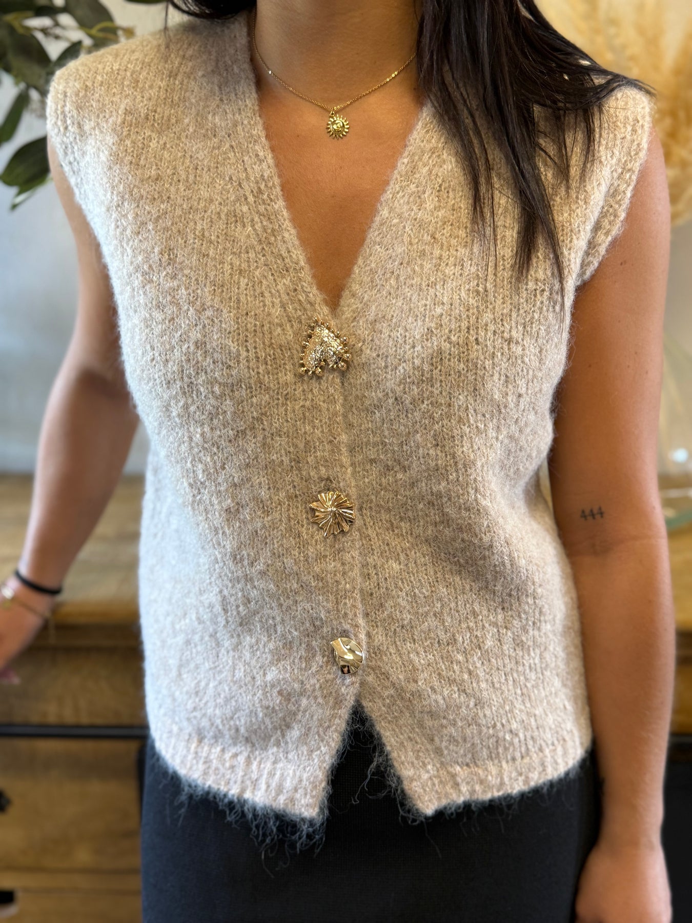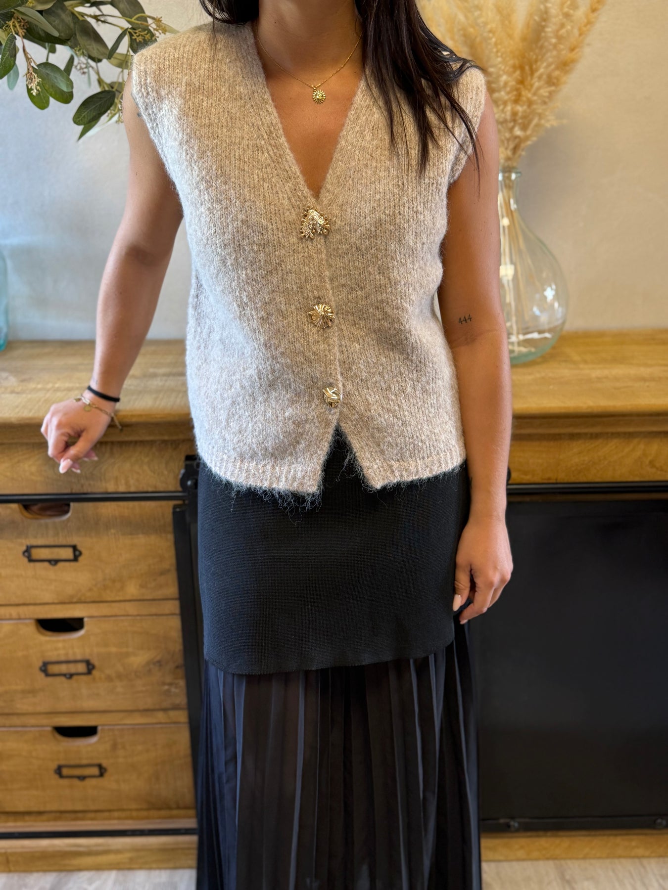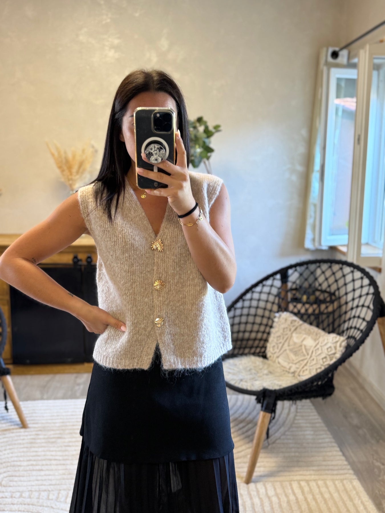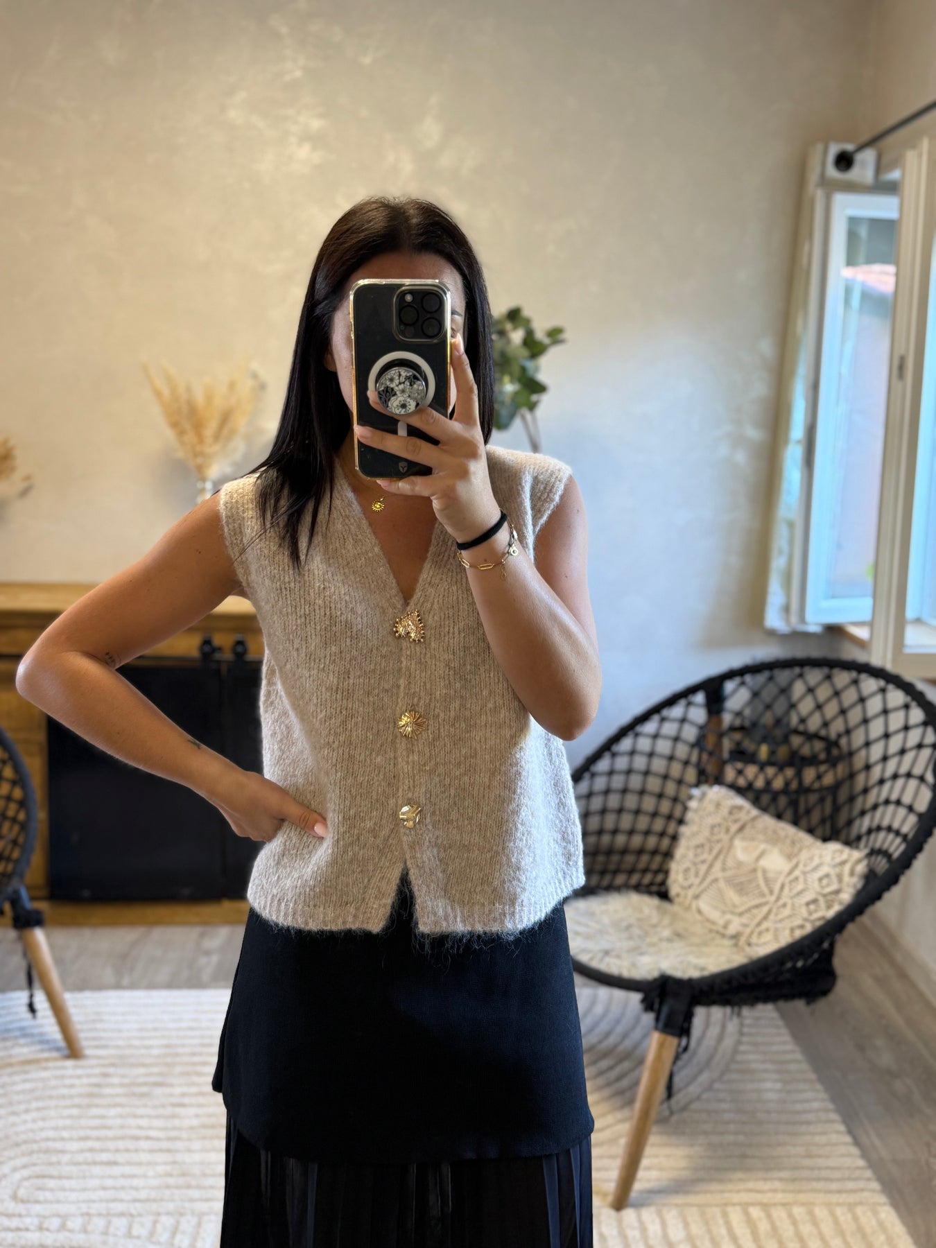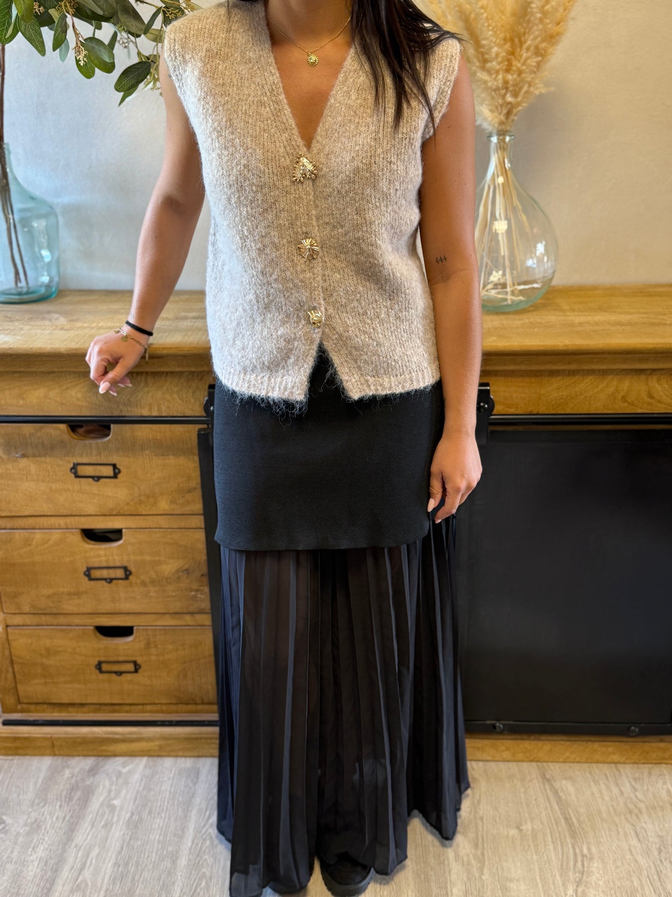 Le gilet Maga est la pièce chic et cosy parfaite pour réchauffer tes looks. Ses jolis boutons bijoux apportent une touche élégante, idéale pour le porter seul ou superposé sur une chemise ou une robe. Ici associé à la jupe Barkley, il compose un look moderne et féminin 💫.