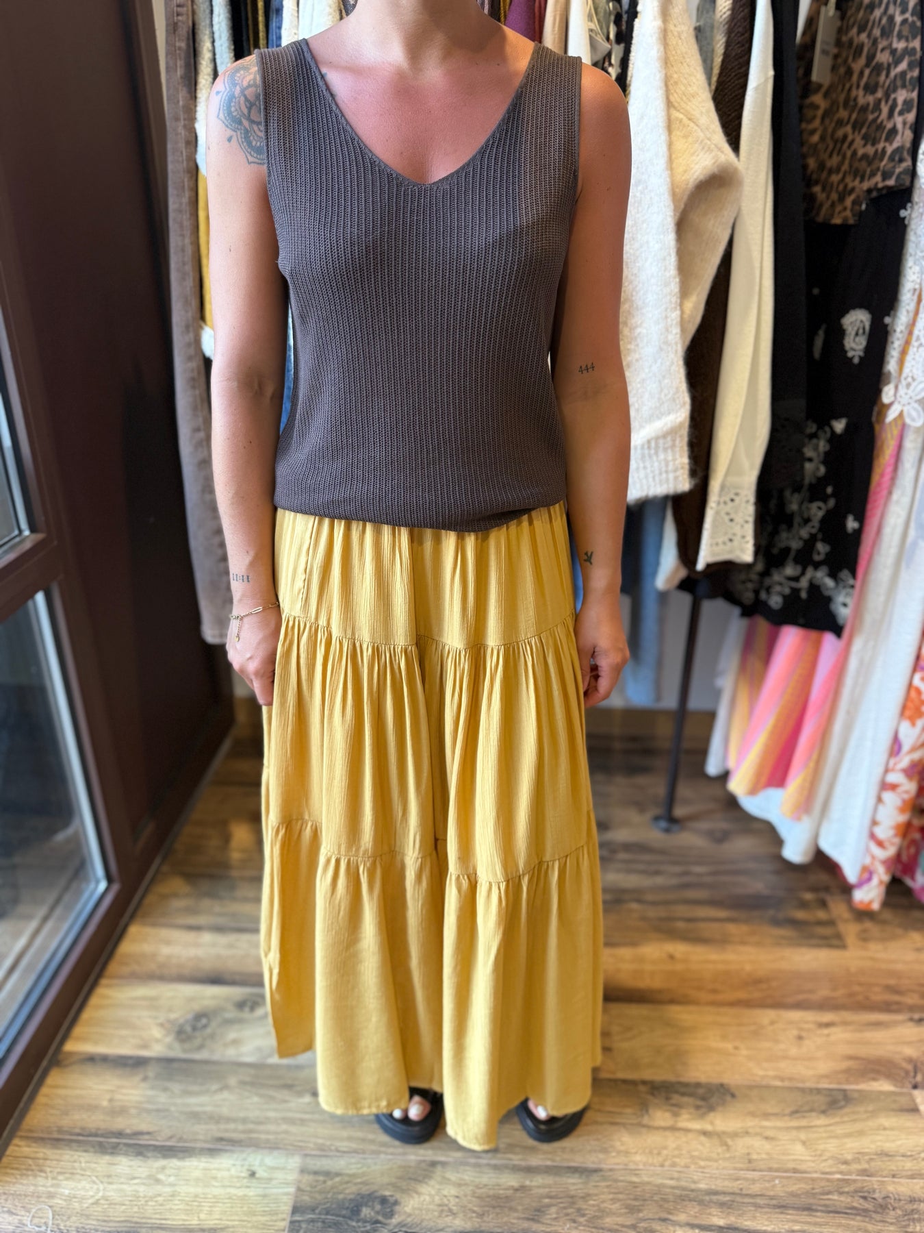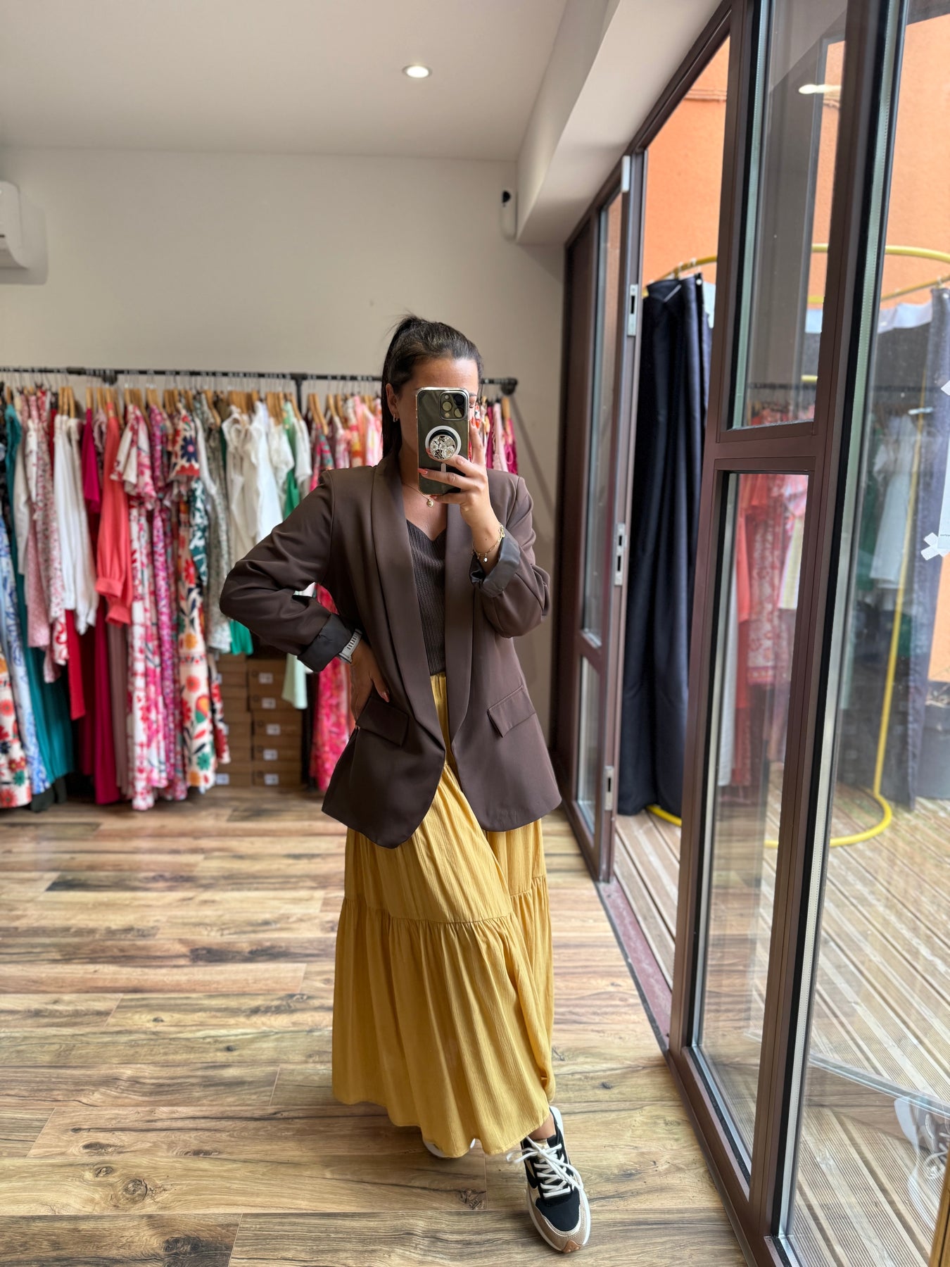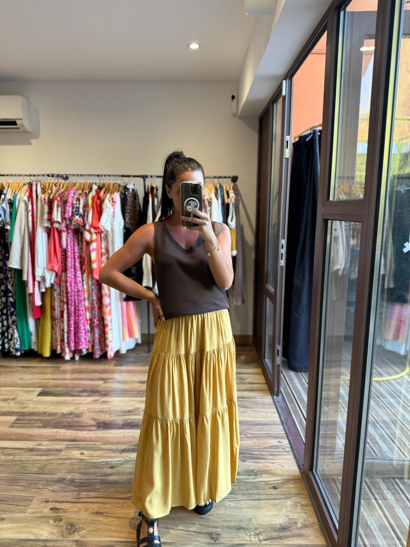 Avec sa couleur lumineuse et sa coupe fluide, la jupe longue moutarde est la pièce parfaite pour rayonner en toutes saisons. On l’aime autant avec un petit débardeur (ici portée avec le top Odile marron) pour un look estival qu’avec une maille douce à l’automne. Ultra polyvalente, elle se porte en ville comme en vacances 🌞.