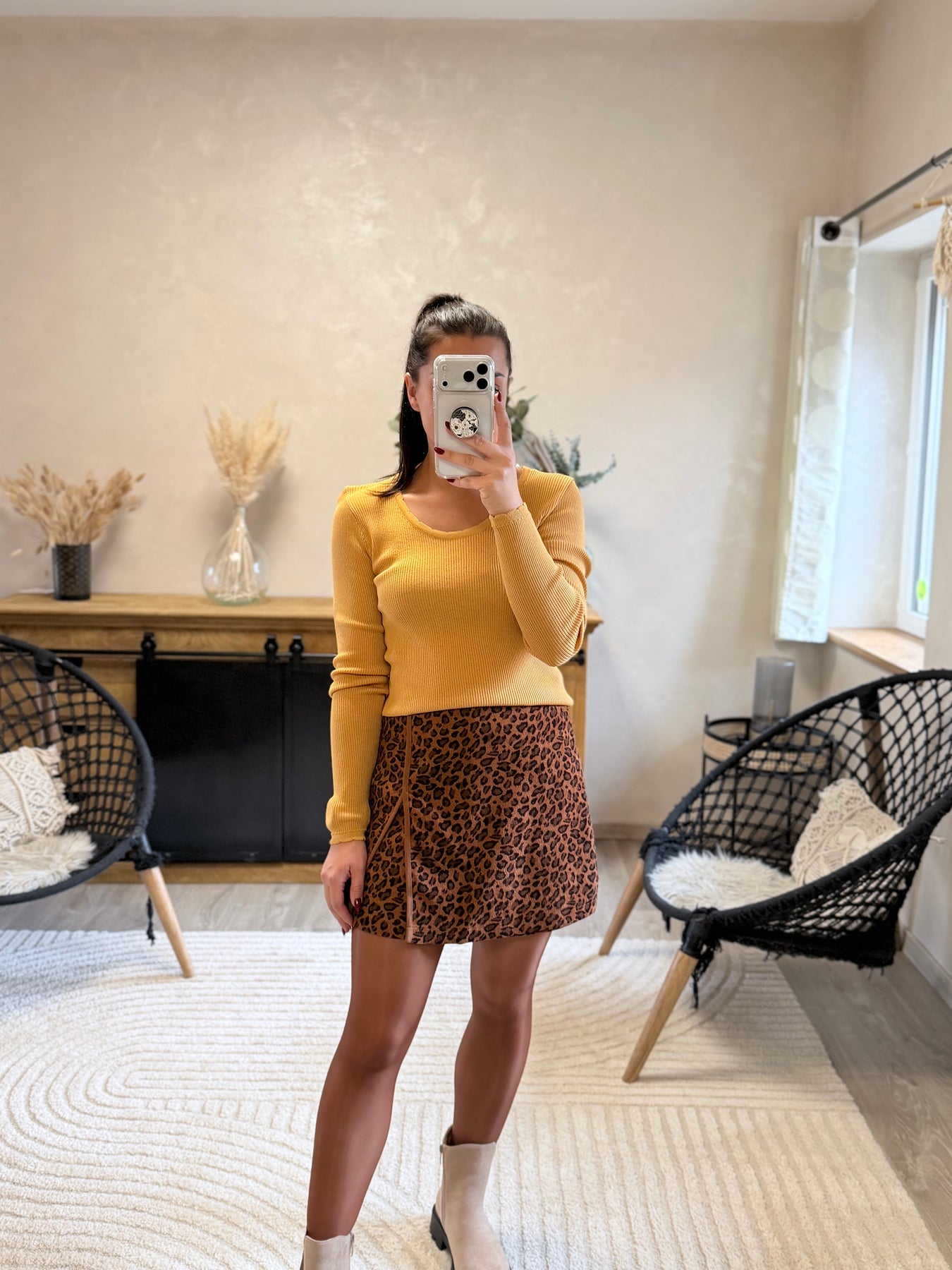 Look porté avec un top côtelé moutarde et des boots beiges, puis avec un pull sans manches noir à zip pour une version plus automnale.