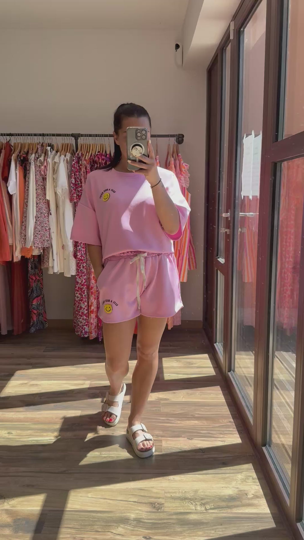 Cet ensemble est une vraie dose de bonne humeur ! Ultra doux et confortable, il est parfait pour vos journées cocooning ou vos balades détendues. Portez-le avec des sneakers blanches ou des sandales pour un look casual plein de pep’s. Avec son smiley joyeux, il illumine votre journée et celle de votre entourage ! 🌸😊