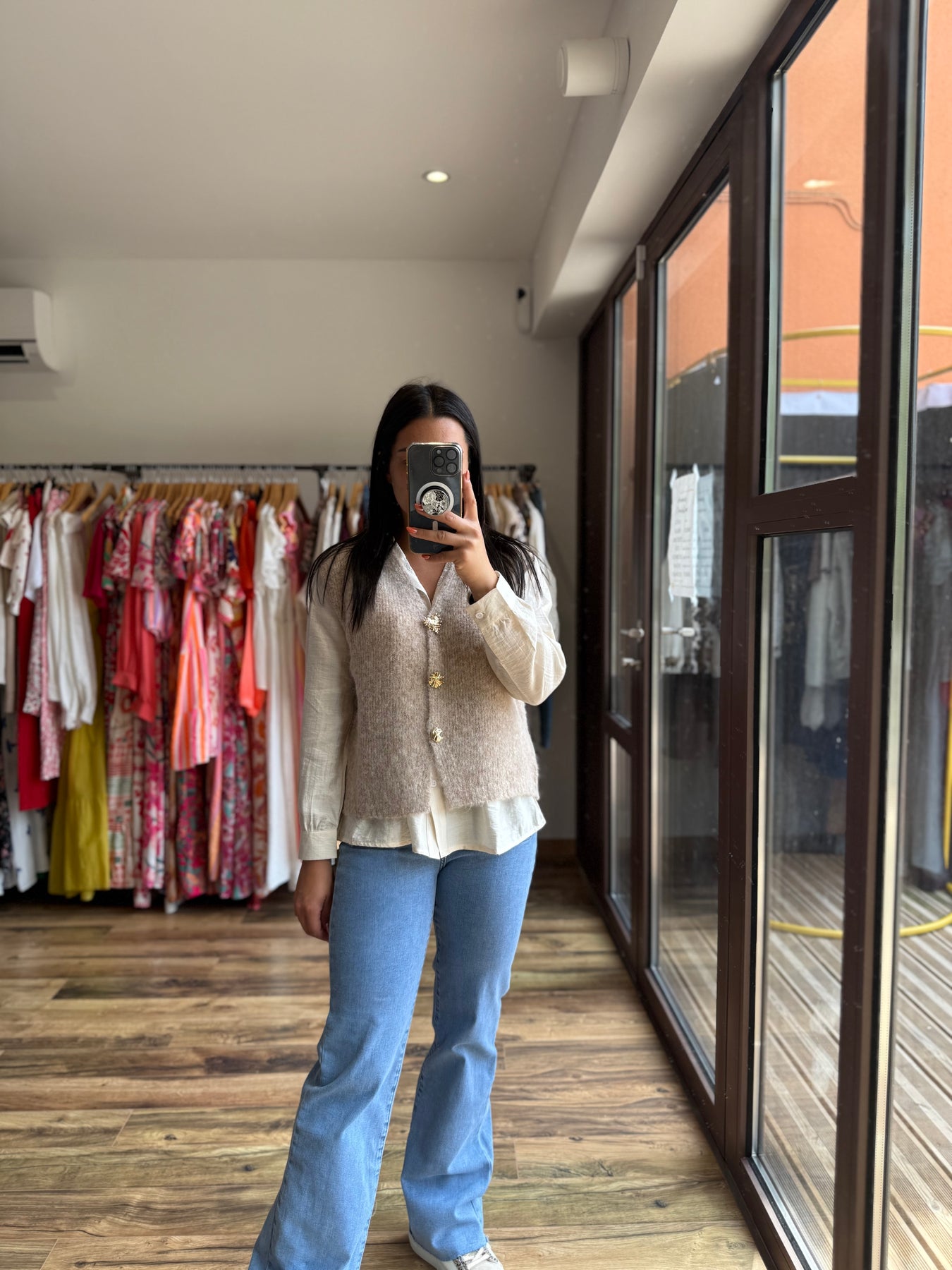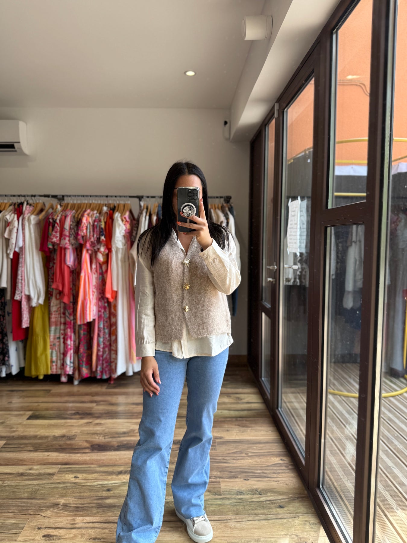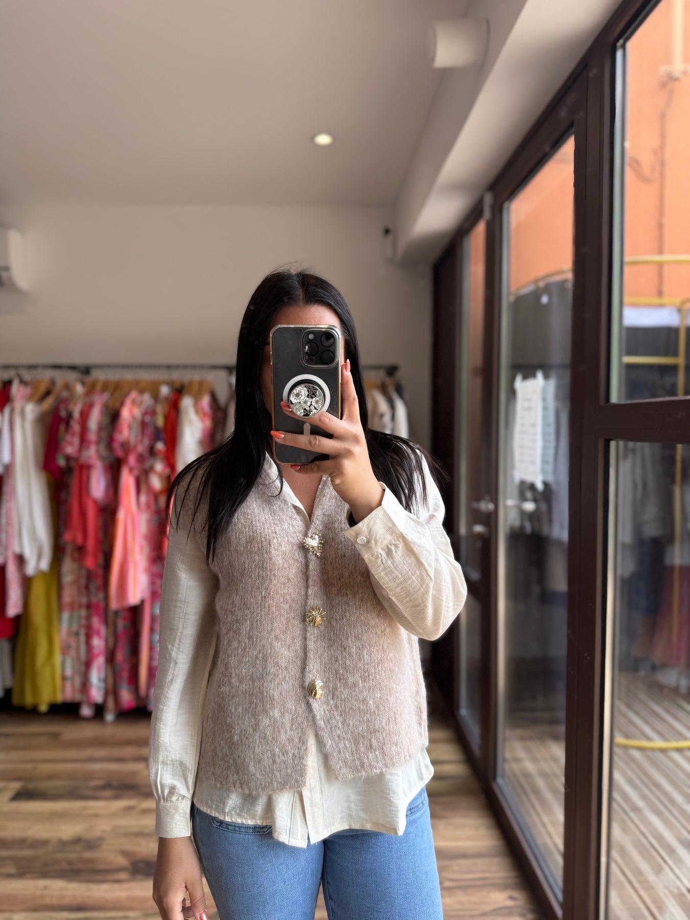 Le gilet “Ortence” est la pièce parfaite pour twister un look basique avec élégance. On craque pour ses boutons bijoux dorés qui apportent une touche précieuse et originale. Facile à superposer sur une chemise fluide, un top basique ou même une robe, il donne une allure chic et bohème en toute saison.