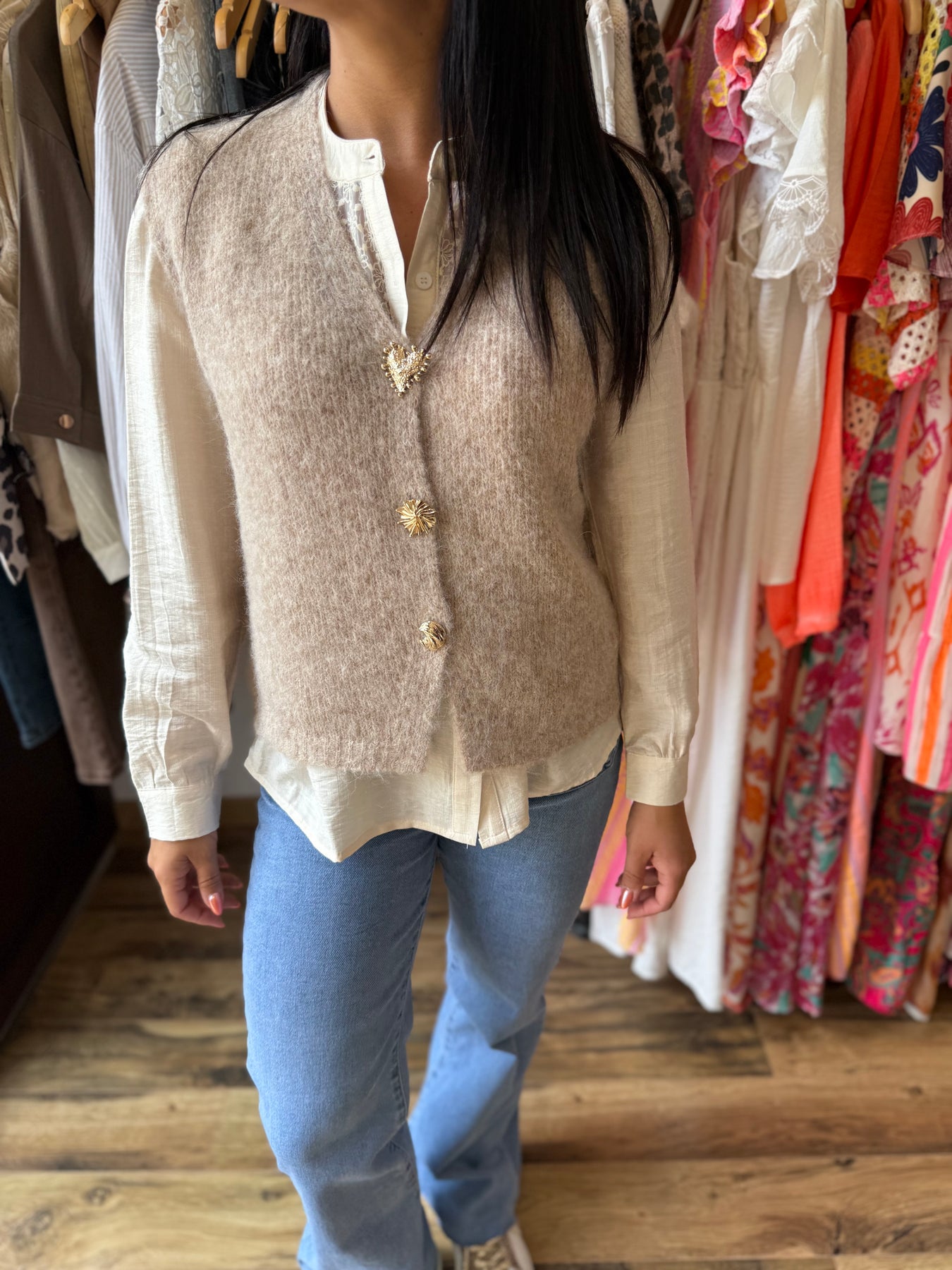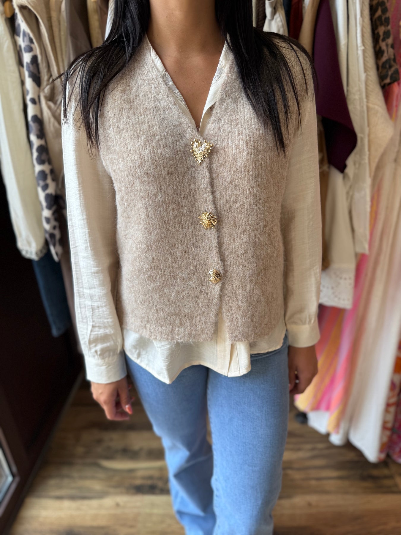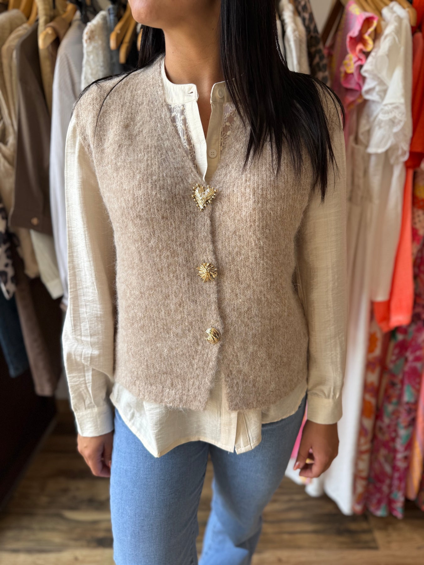 Le gilet “Ortence” est la pièce parfaite pour twister un look basique avec élégance. On craque pour ses boutons bijoux dorés qui apportent une touche précieuse et originale. Facile à superposer sur une chemise fluide, un top basique ou même une robe, il donne une allure chic et bohème en toute saison.