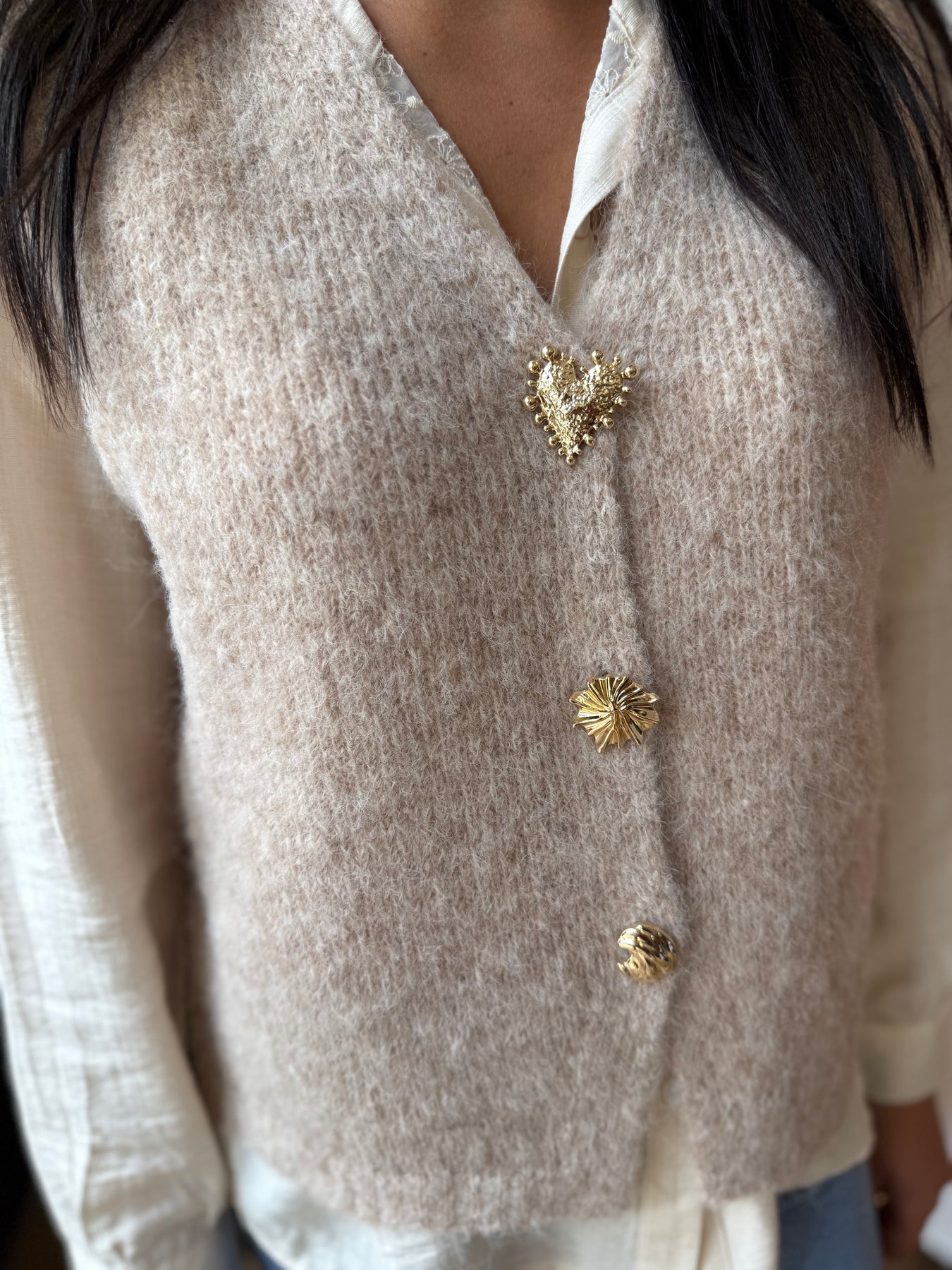 - Boutons bijoux dorés en relief (cœur, soleil, motif texturé)