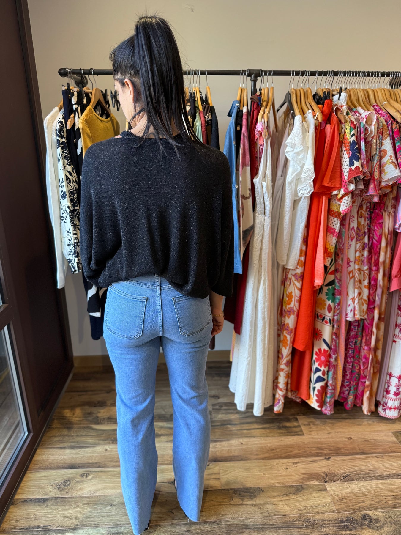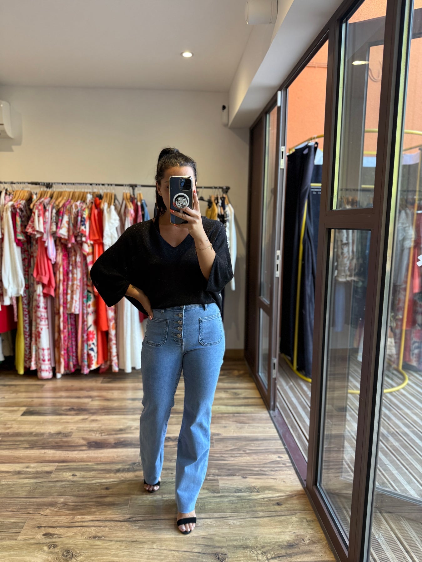 Alicia (1m57, taille 36) porte le jean “Wild Leg” avec le top “Janelle” noir.
