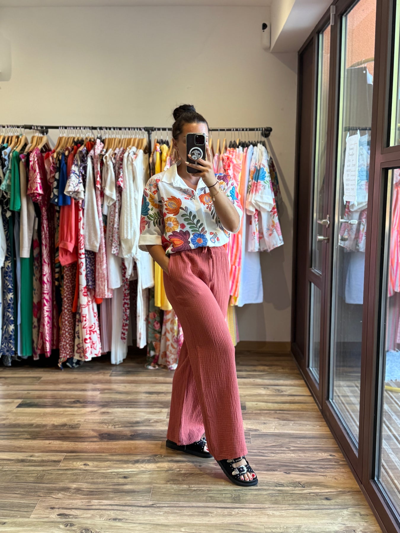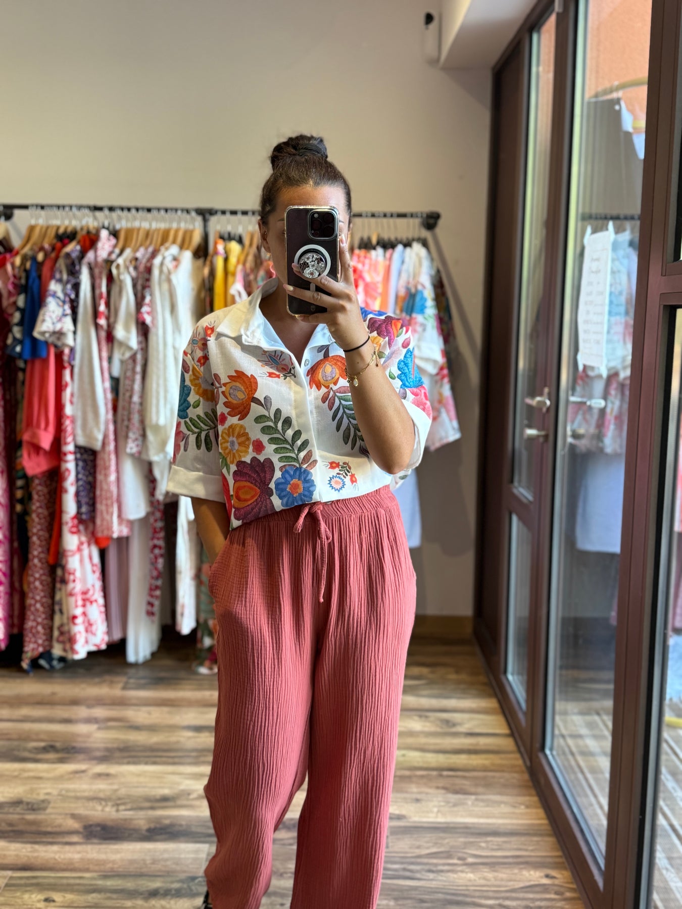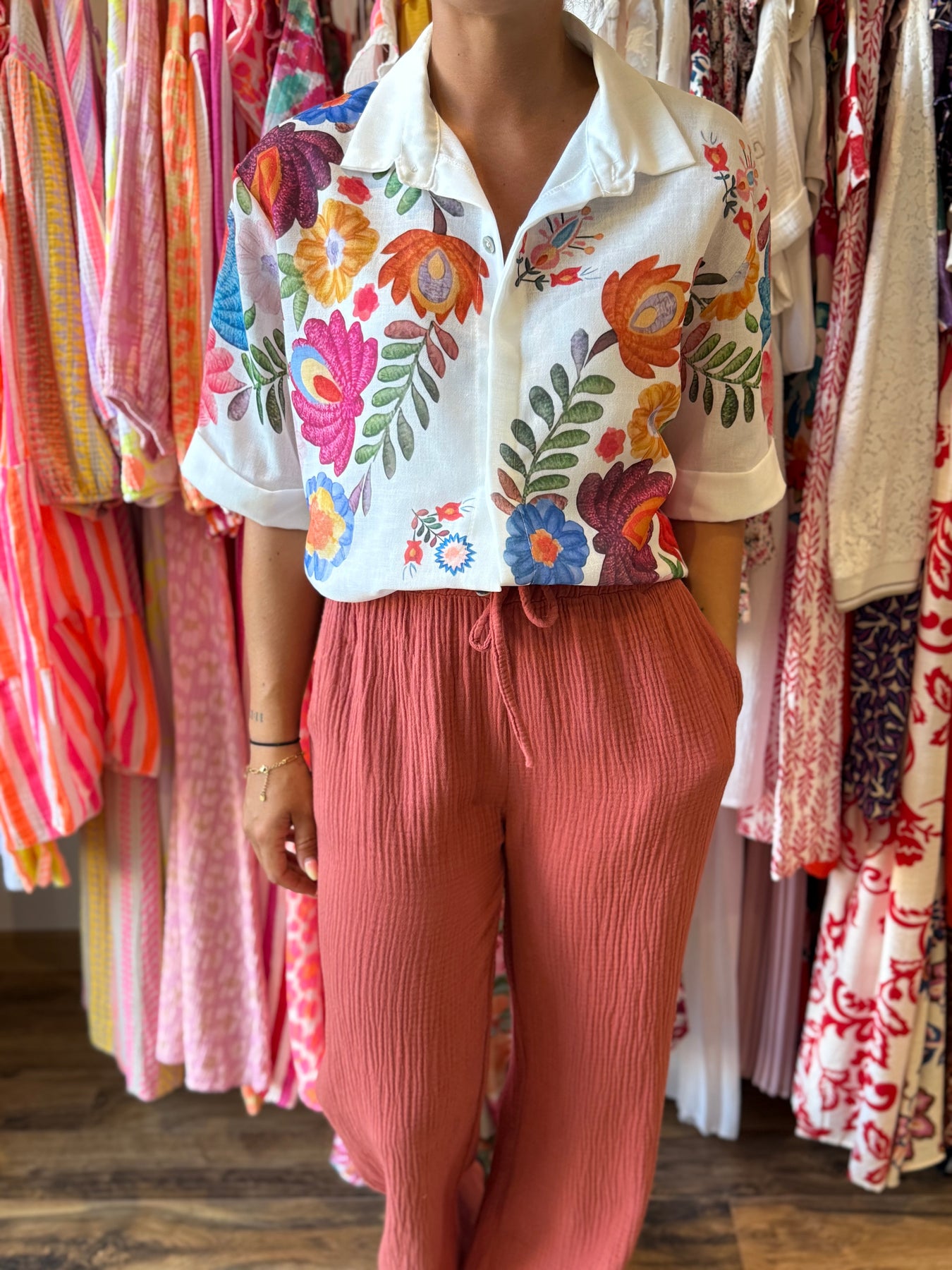 👗 Alicia mesure 1m57 et le porte ici avec la chemise “Hector” pour un look bohème coloré et chic.