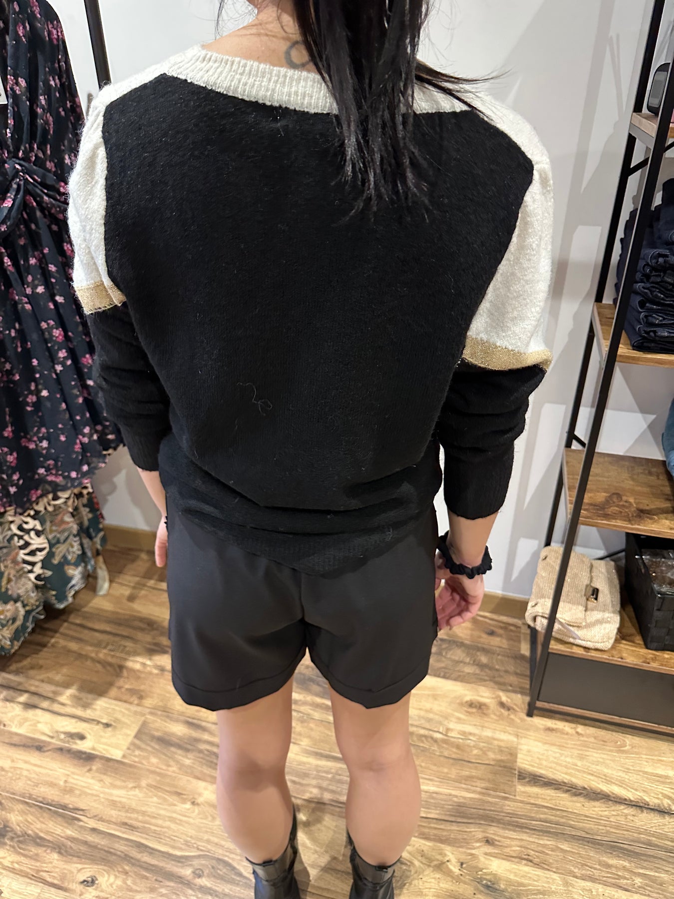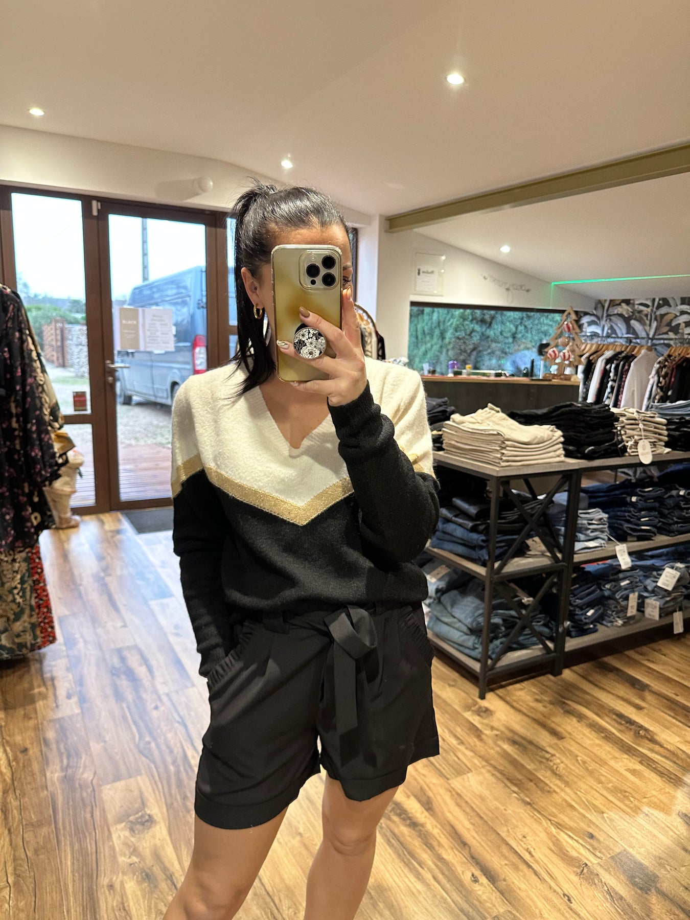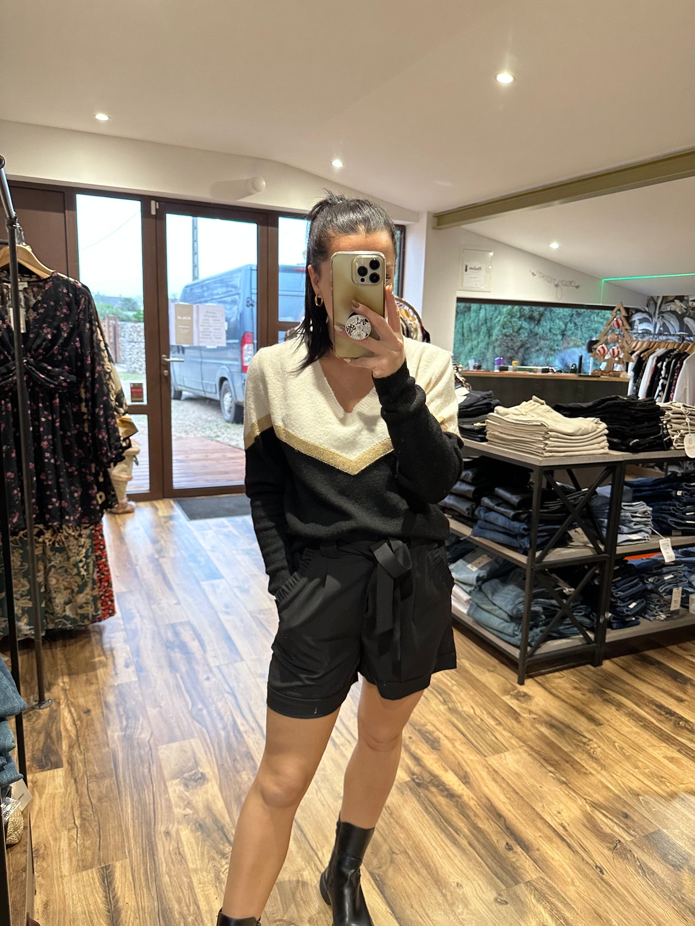 Alicia mesure 1m57 et met du 36 elle porte le pull avec le short Yalle noir
