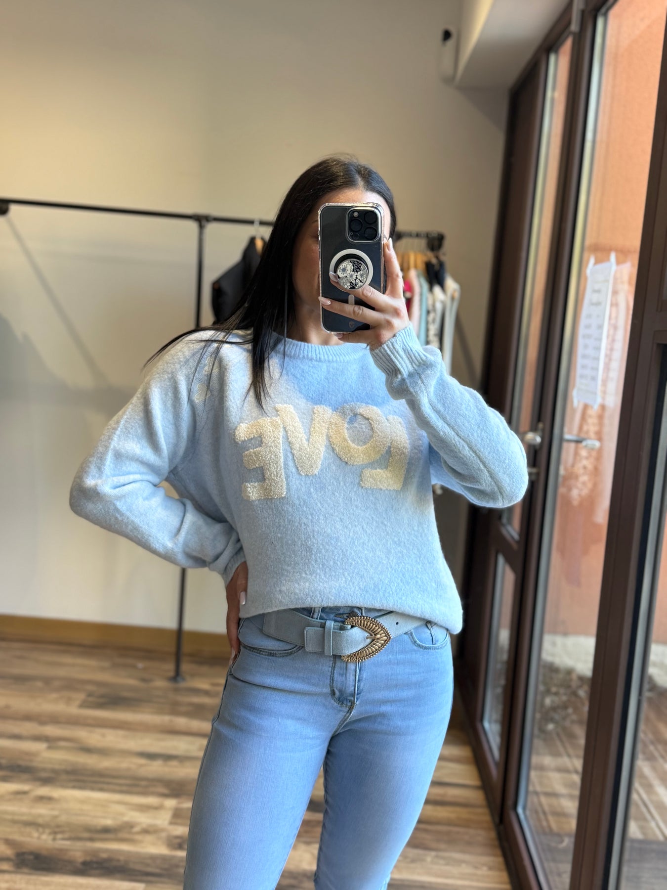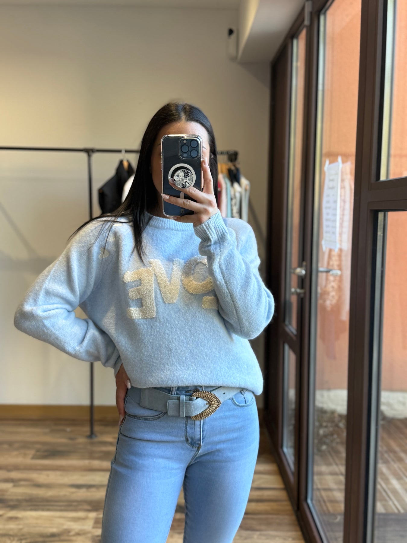 Alicia mesure 1m57 et met du 36 elle porte le pull avec jean Mandyse et la ceinture bleu