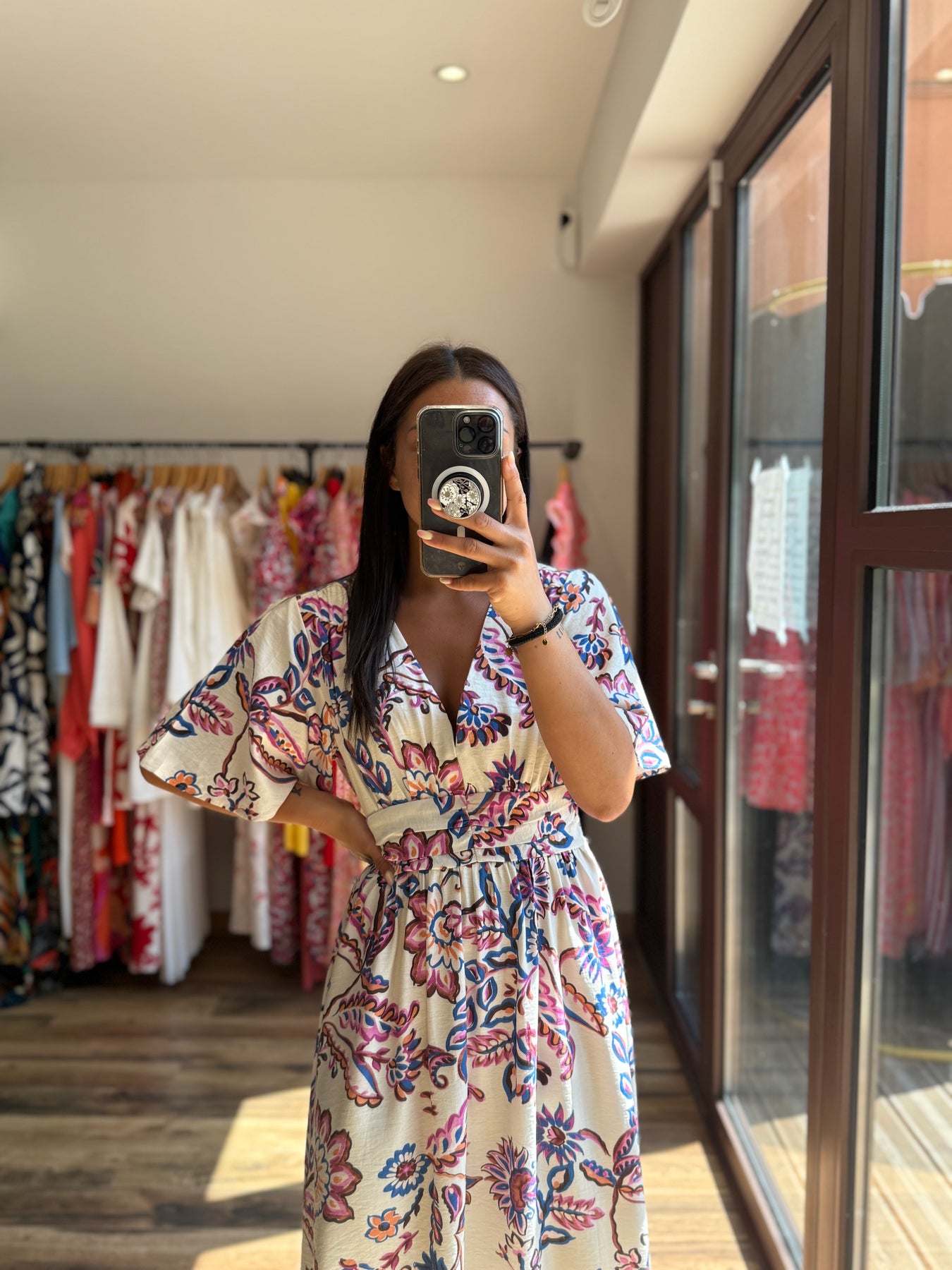La robe “Xia” est un vrai coup de cœur pour les beaux jours : une matière douce et fluide, un imprimé qui respire le soleil et une coupe qui sublime toutes les morphologies. Parfaite pour une sortie en terrasse, une balade au marché ou un événement chic. À porter avec des sandales compensées ou des baskets pour casser le côté bohème !