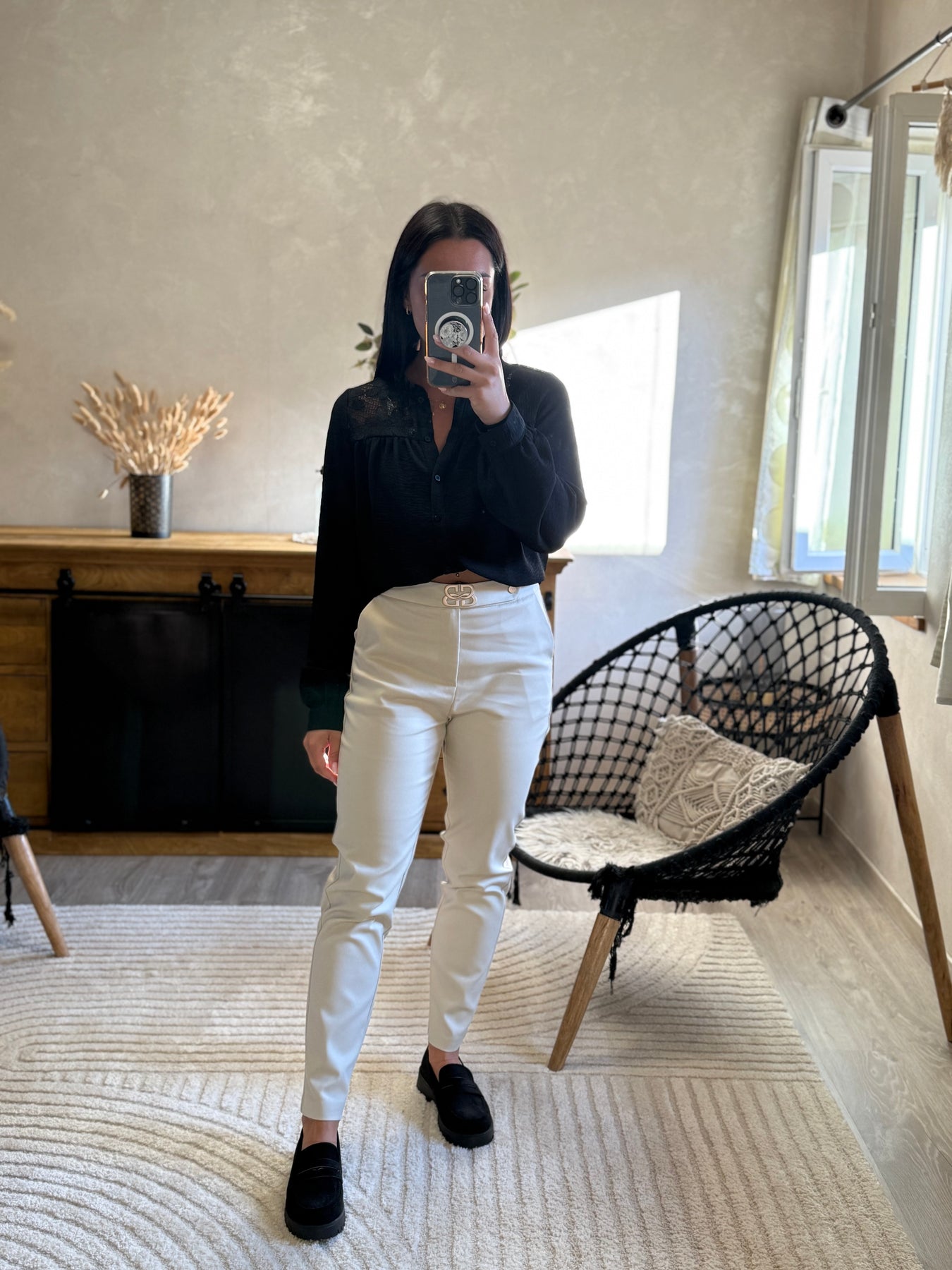 La chemise Sony est un basique revisité : élégante, féminine et facile à porter ✨. Son jeu de dentelle aux épaules apporte de la délicatesse à une tenue sobre. On l’associe à un pantalon habillé pour un look de bureau chic, ou à un jean pour une allure décontractée mais raffinée.