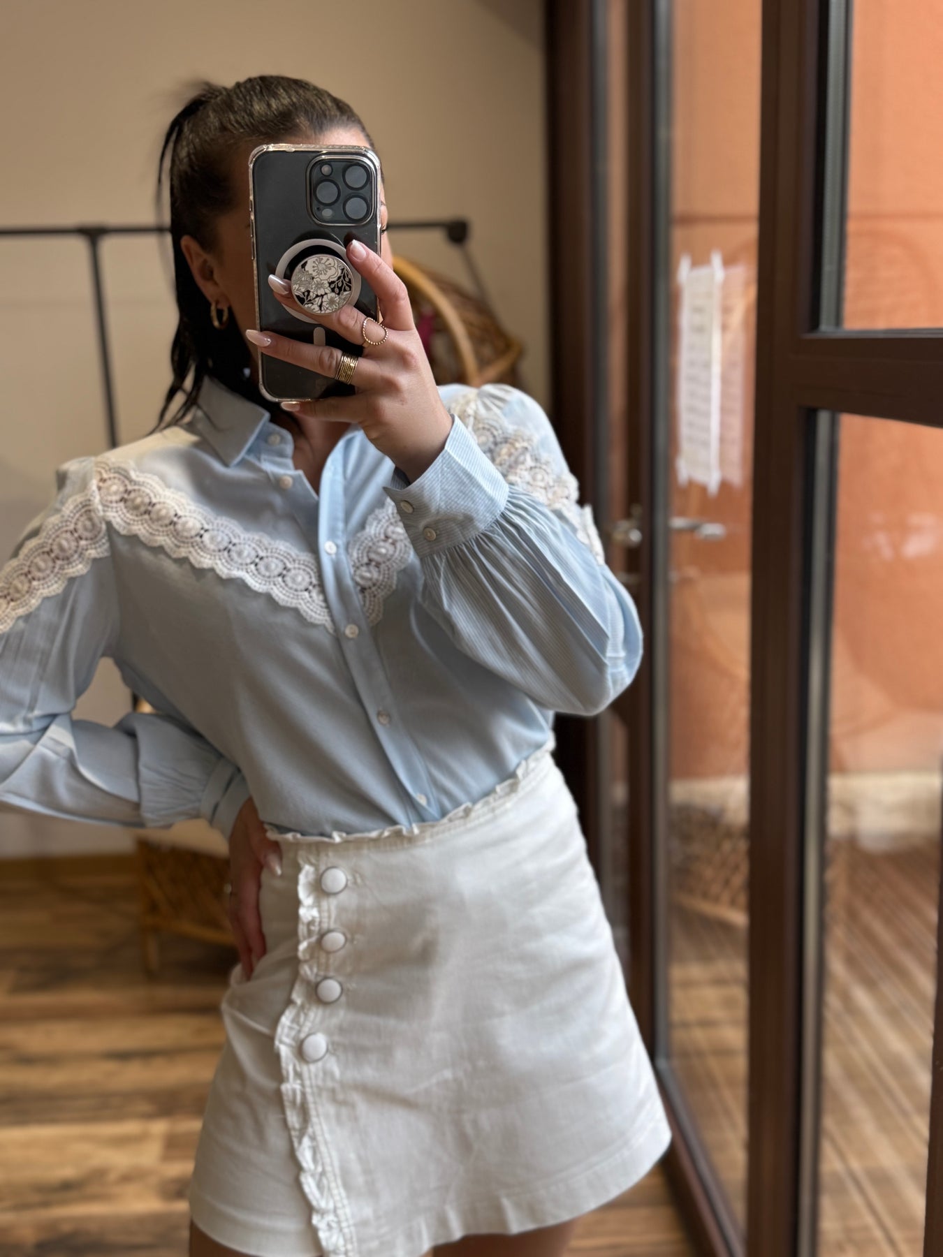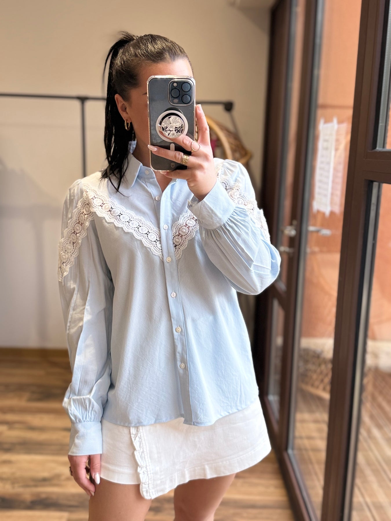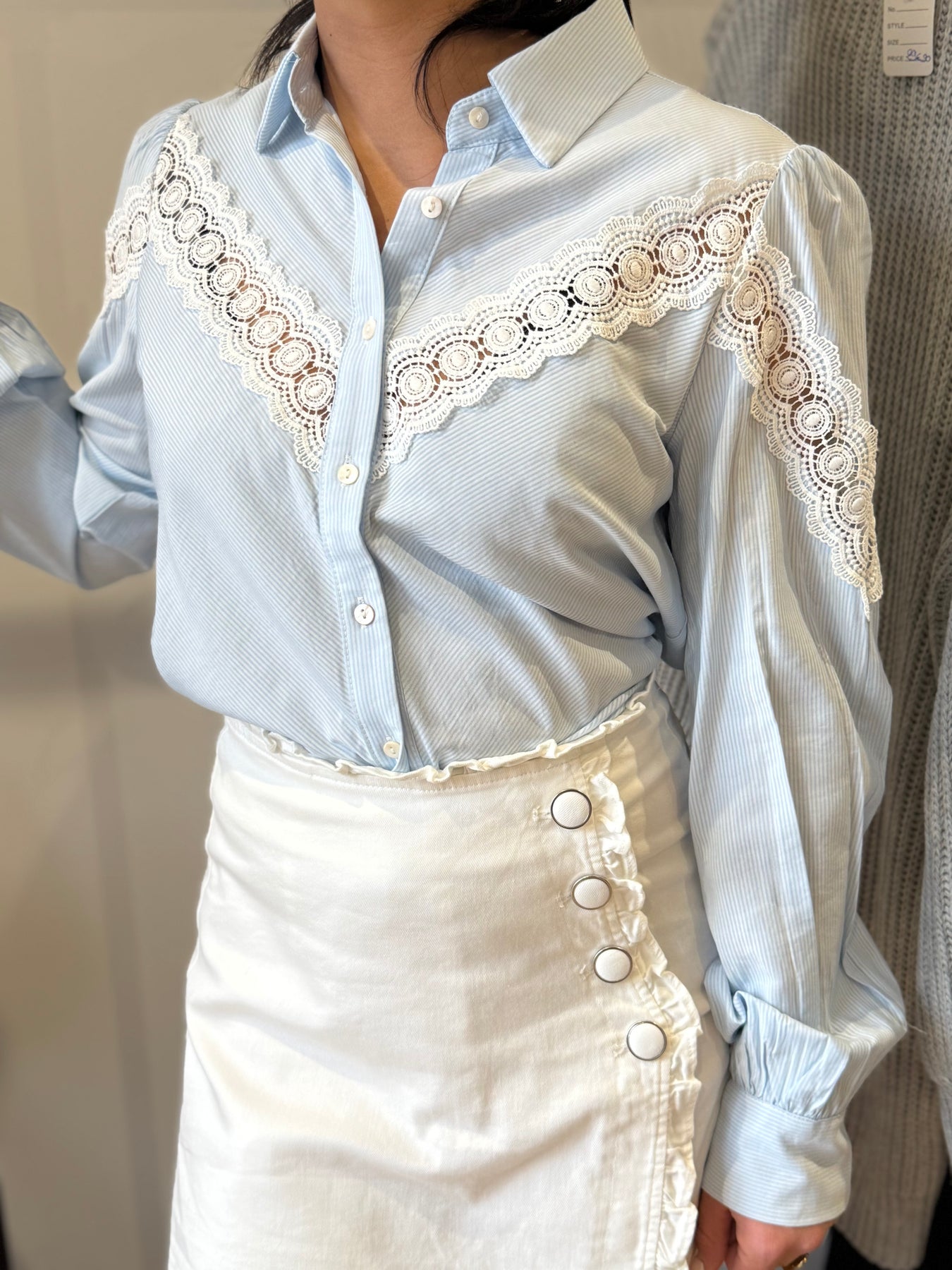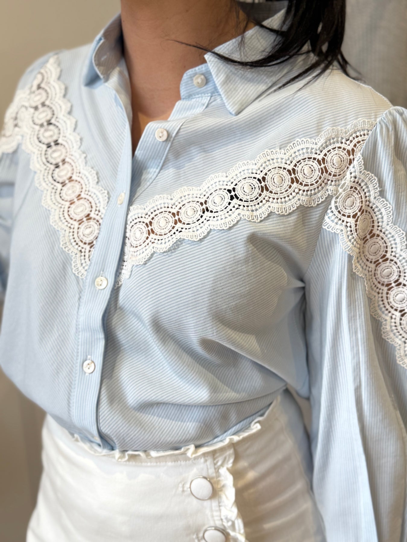 Broderie sur le haut de la chemise jusqu’au épaules
