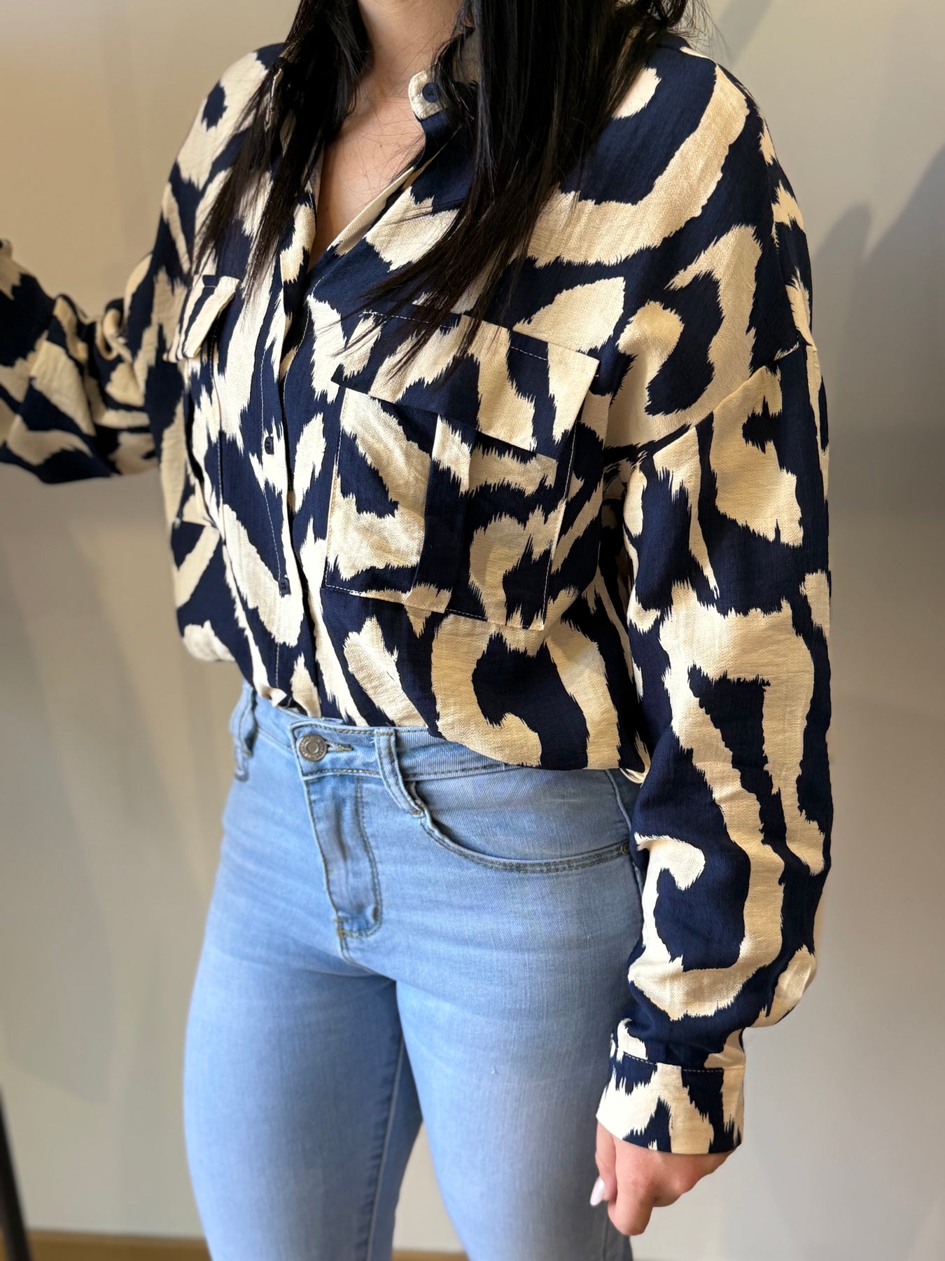 Alicia mesure 1m57 et met du 36 elle porte la chemise avec le jean Mandyse