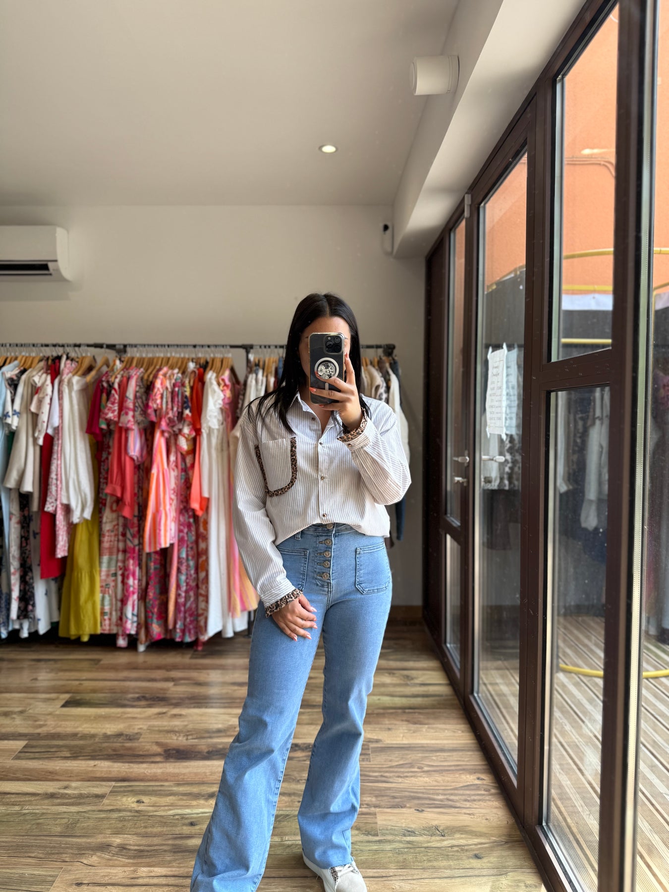 Alicia (1m57, taille 36) porte la chemise “Esra” avec un jean flare bleu clair.