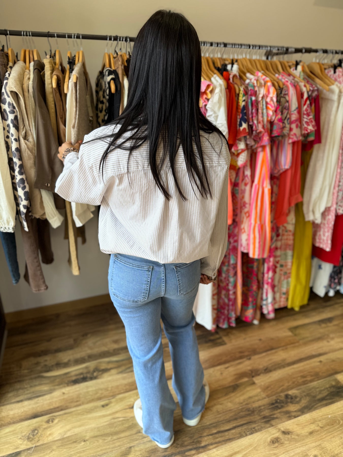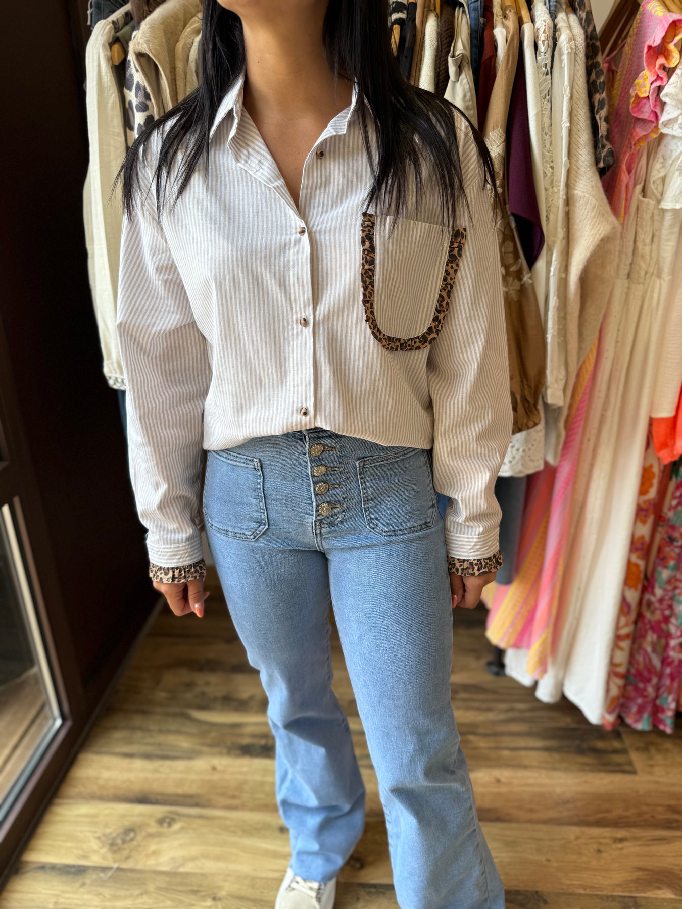 Une chemise casual qui se distingue par ses détails 🐆. Le mélange subtil entre les rayures sobres et la touche léopard donne un style unique et tendance. Facile à associer avec un jean pour un look décontracté ou un pantalon chic pour plus d’élégance.