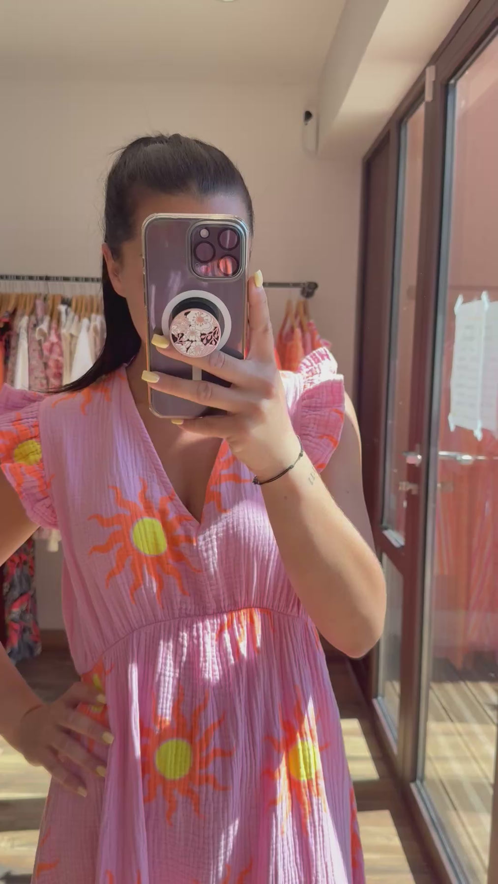 ✨ Cette robe est une véritable déclaration de bonne humeur ! Avec son imprimé soleil fluo qui capte le regard et sa coupe fluide, elle est idéale pour illuminer vos journées d’été. Portez-la pour un brunch entre copines, une balade au marché ou même pour vos vacances sous les palmiers. Ajoutez un panier en osier et des bijoux dorés pour compléter le look boho-chic.