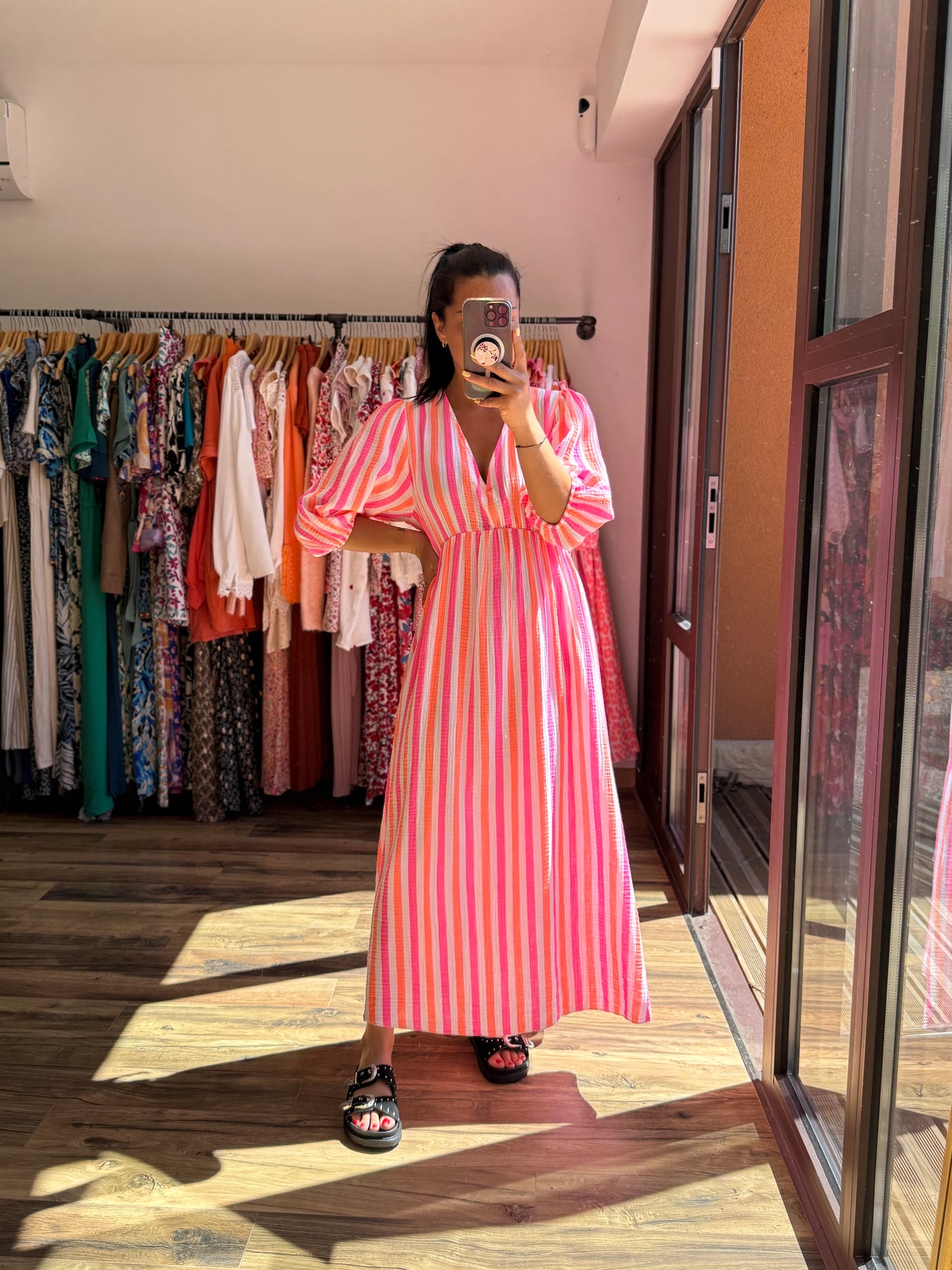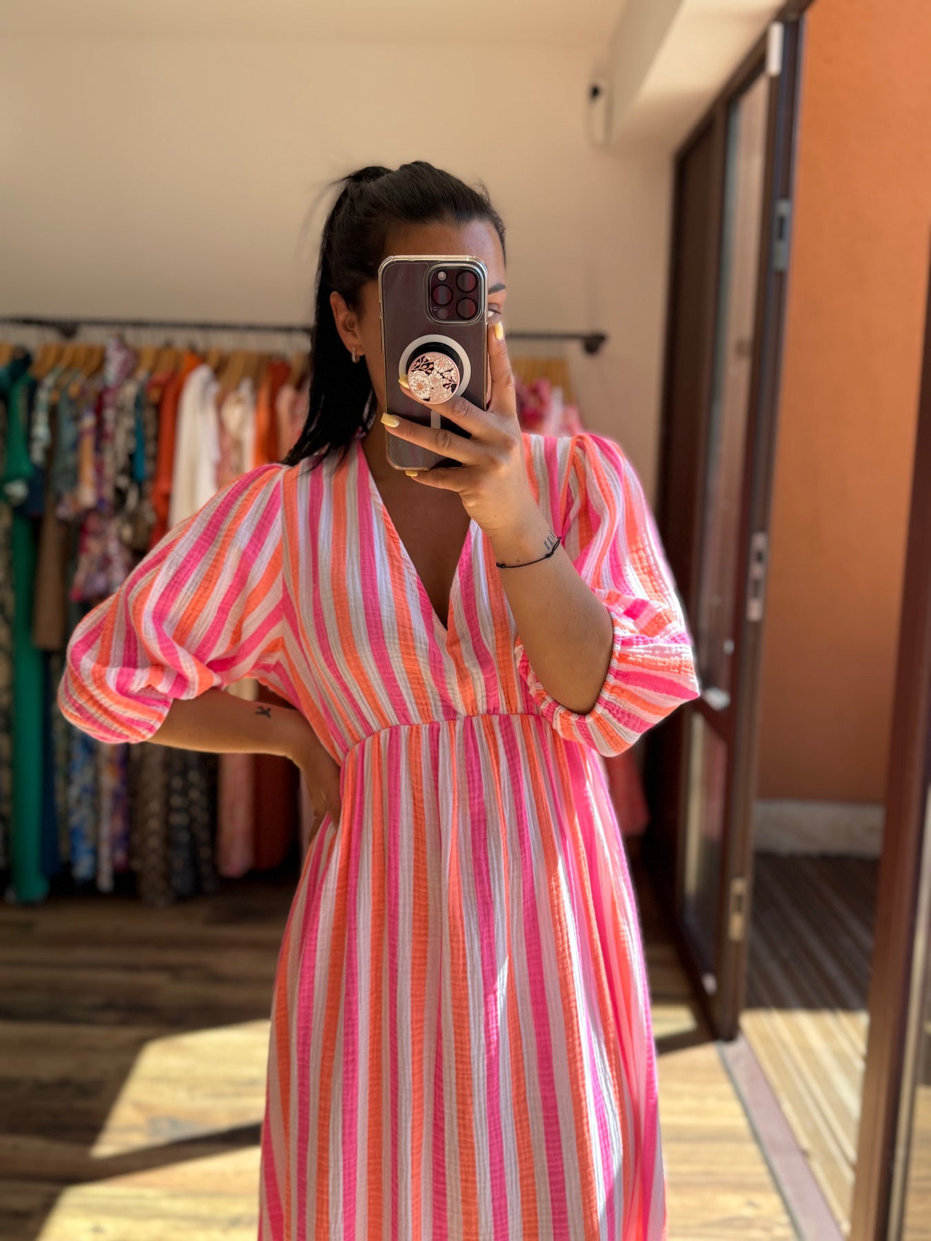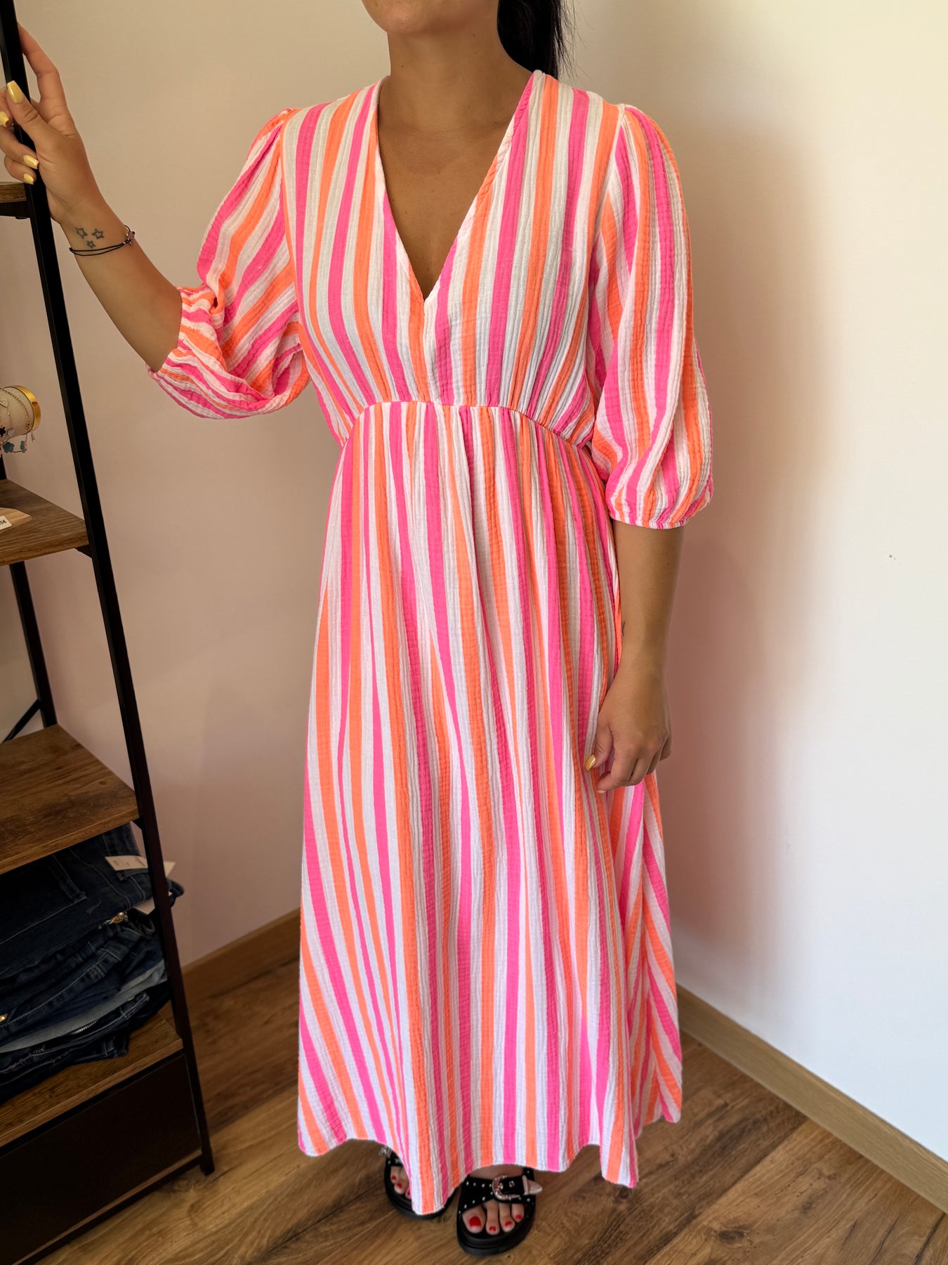 Avec ses couleurs vibrantes et sa coupe flatteuse, la robe Oria est la pièce phare de l’été. Elle assure un look bohème chic et plein de pep’s, parfait pour une escapade ensoleillée ou un apéro au bord de l’eau. À porter avec des spartiates, un chapeau et le sourire aux lèvres !