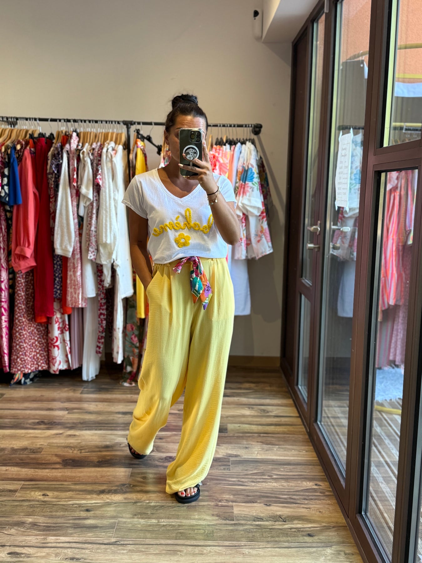 2️⃣ Mannequin Alicia : 1m57, porte le tee-shirt “Bohème” avec le pantalon “Eliam” jaune.