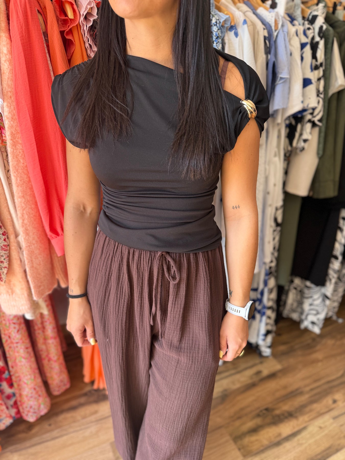• Tee-shirt noir asymétrique avec détail anneau doré à l’épaule