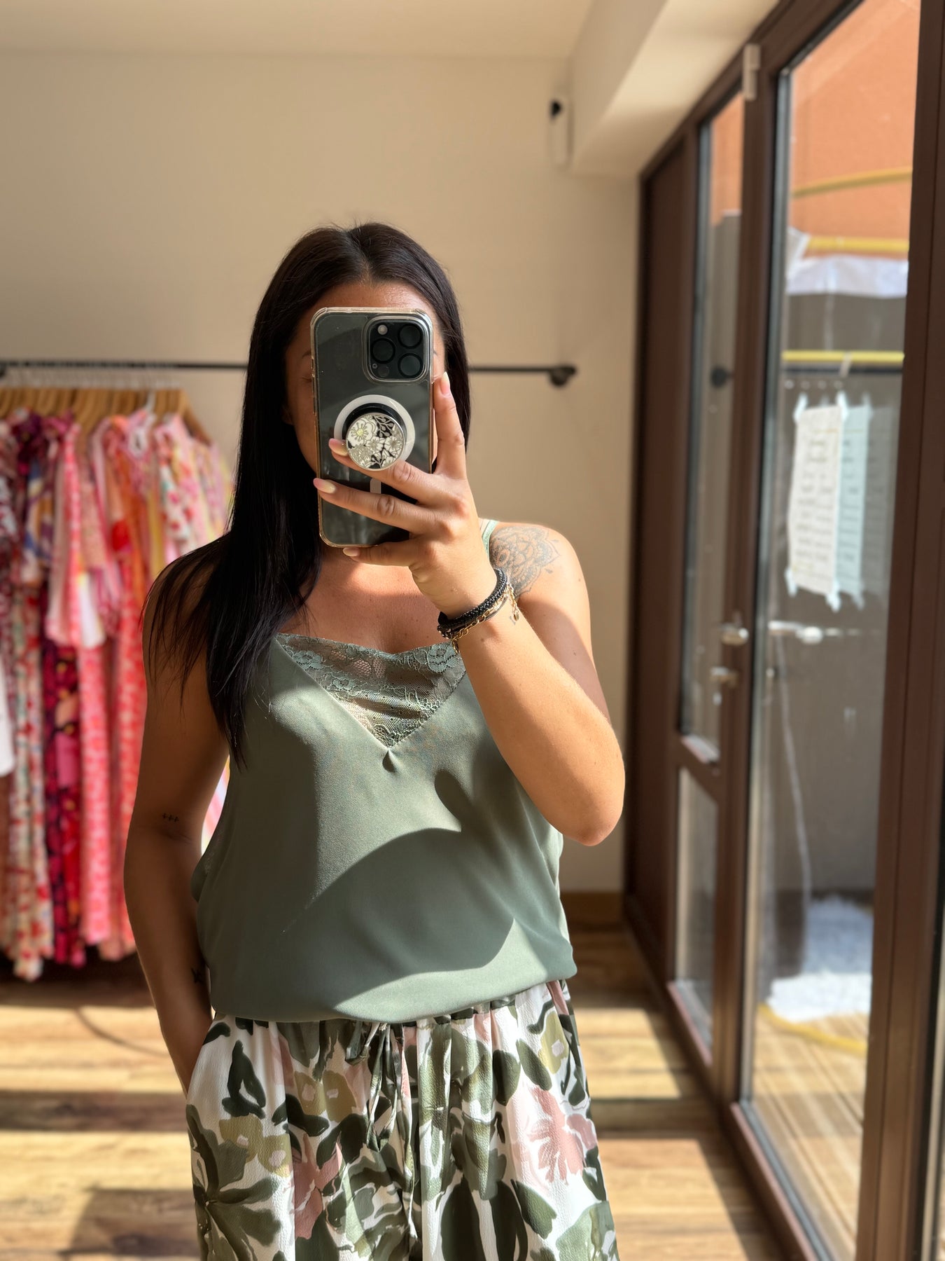 Un top fluide et léger qui fait toute la différence avec sa dentelle discrète. Il se glisse aussi bien sous un blazer chic que dans un pantalon imprimé comme ici pour un look estival tout en douceur. Un indispensable du dressing féminin.