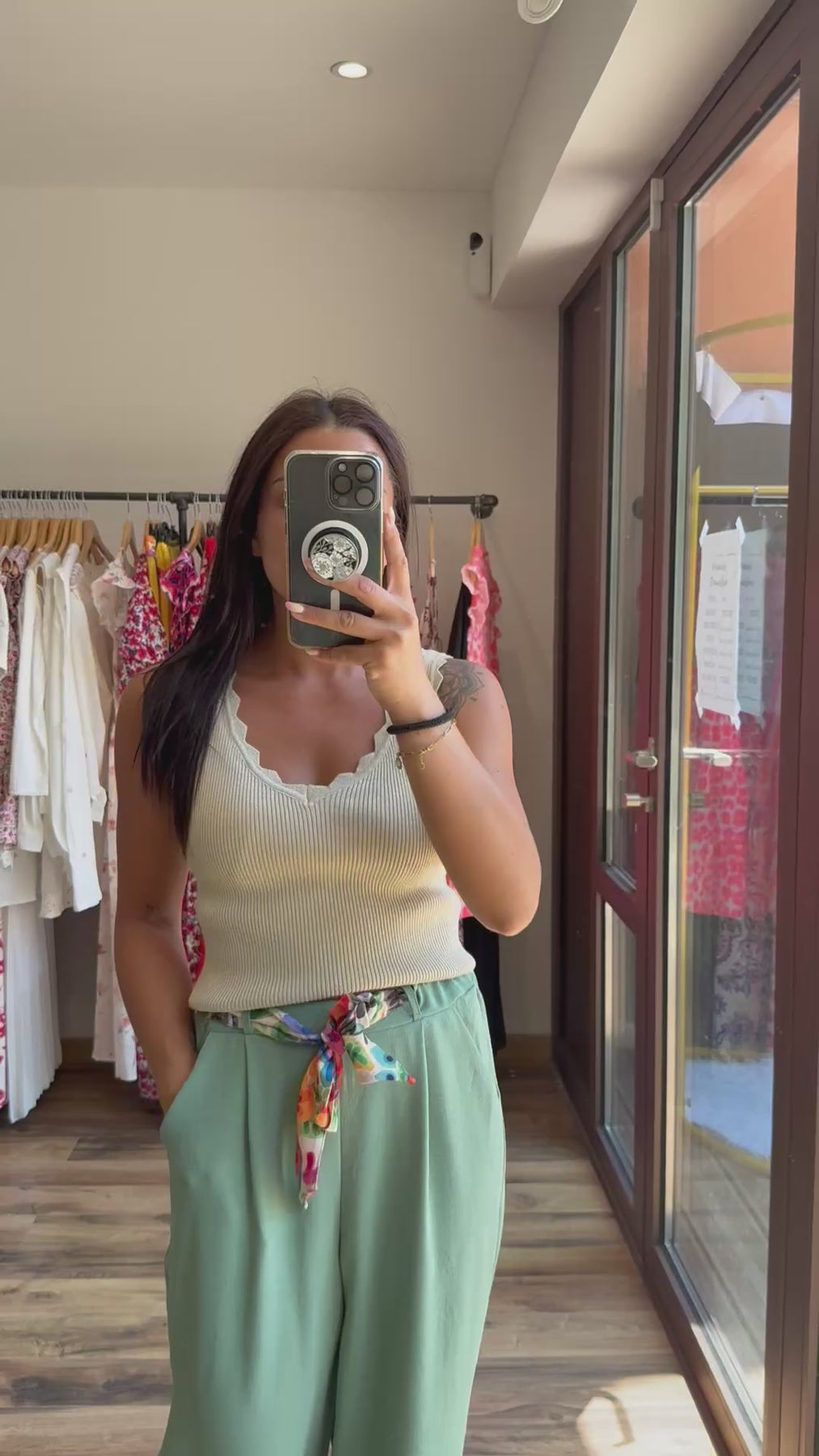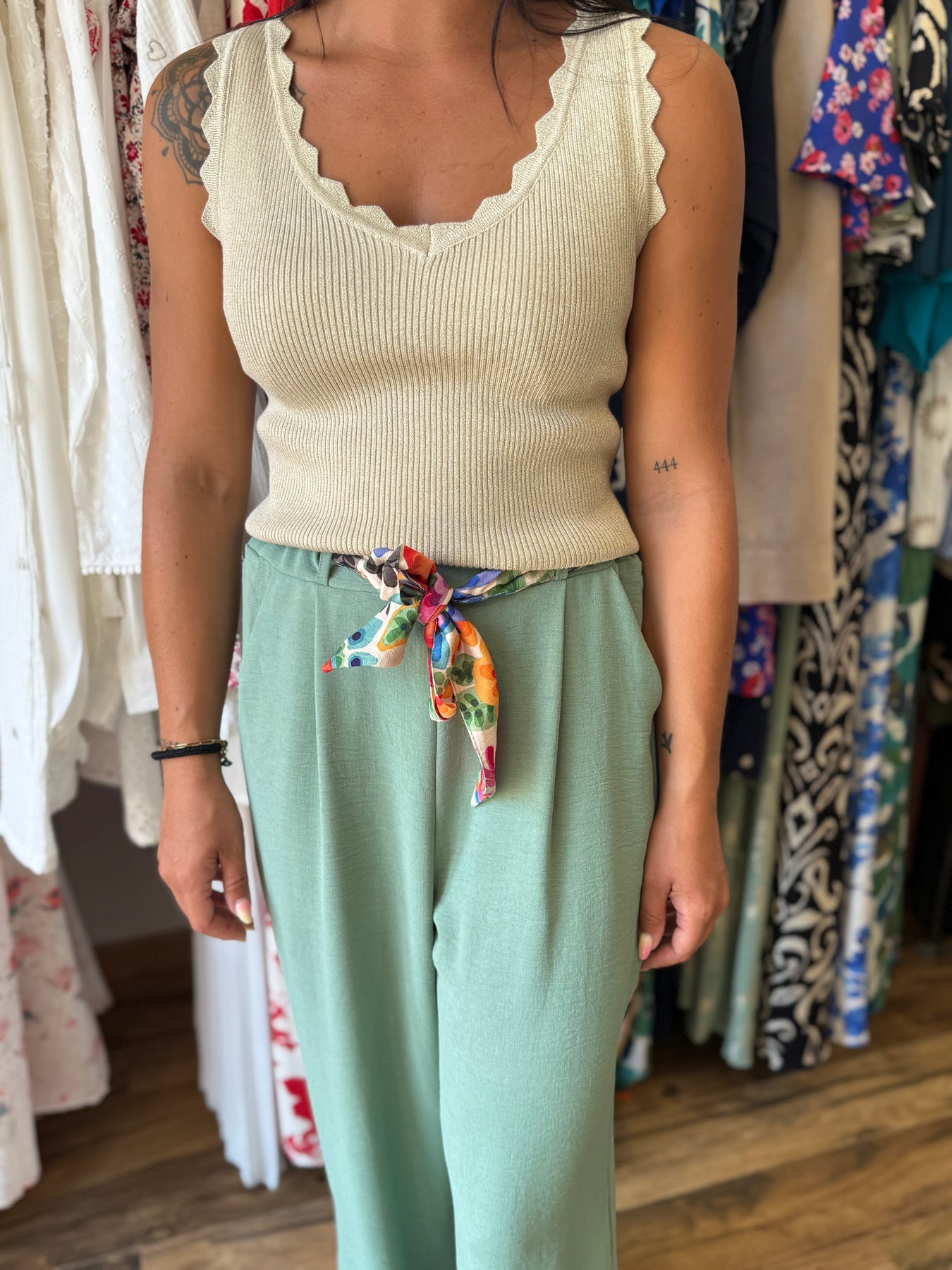 📸 Look porté avec le pantalon “Eliam” vert d’eau et les sandales “Lorina”