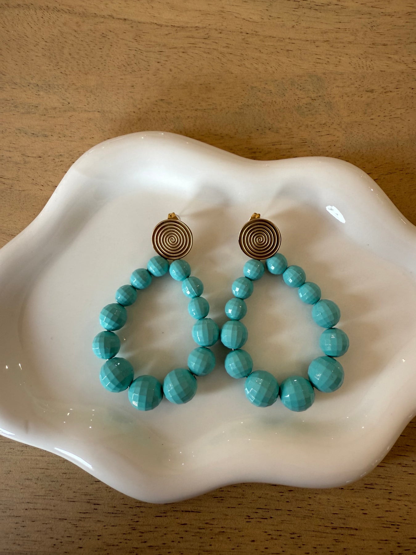 Un vrai coup de pep’s pour vos looks ☀️ Ces boucles d’oreilles “Jade” attirent l’œil avec leurs perles turquoise ultra lumineuses et leur clou doré graphique. On les imagine aussi bien avec une robe blanche qu’un look total jean 💫