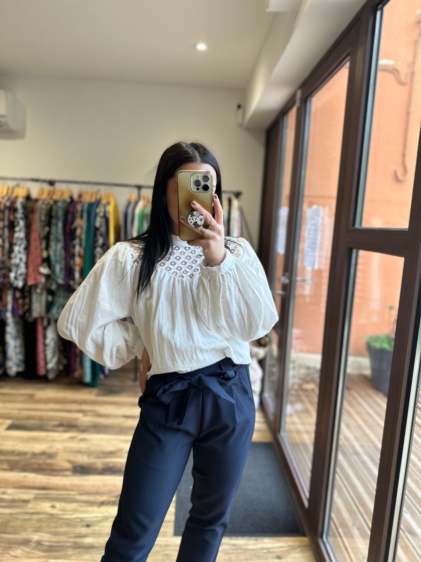Alicia mesure 1m57 et met du 36 elle porte la blouse avec le pantalon Vesna marine