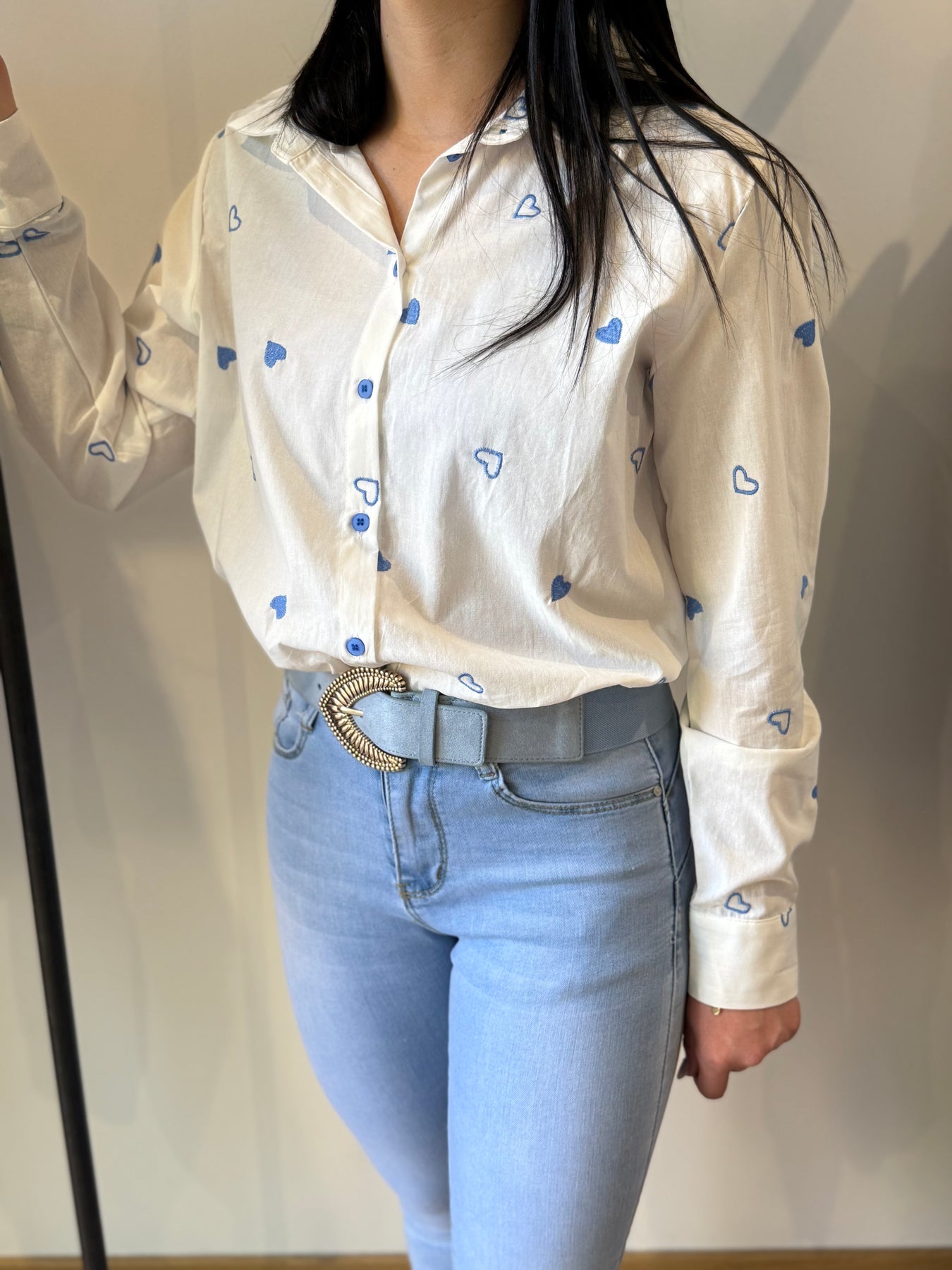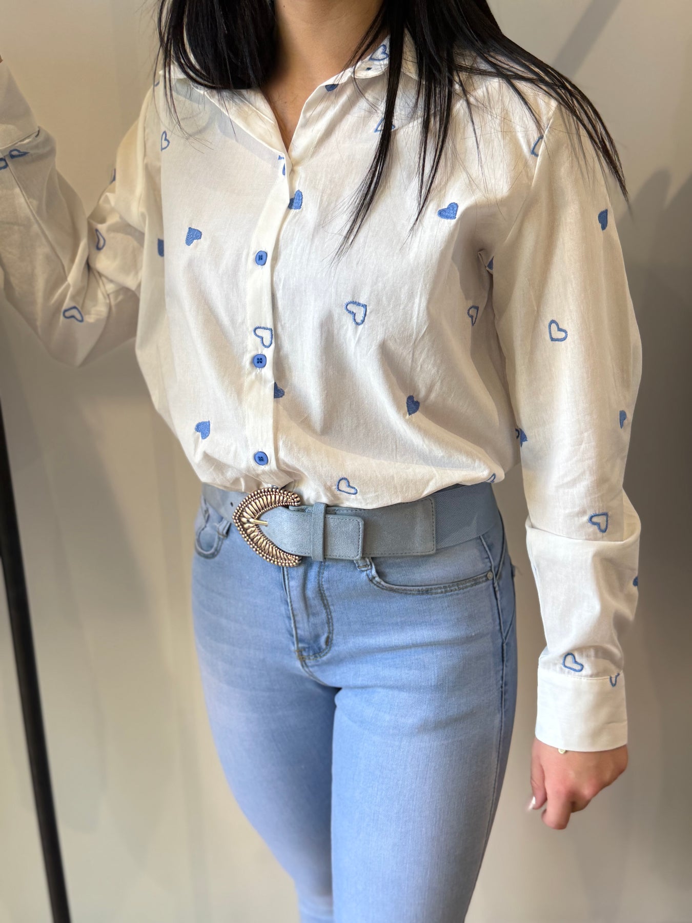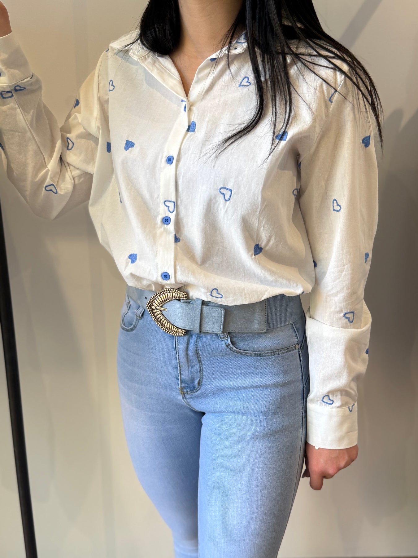 Alicia mesure 1m57 et met du 36 elle porte la chemise avec le jean Mandyse et la ceinture bleu