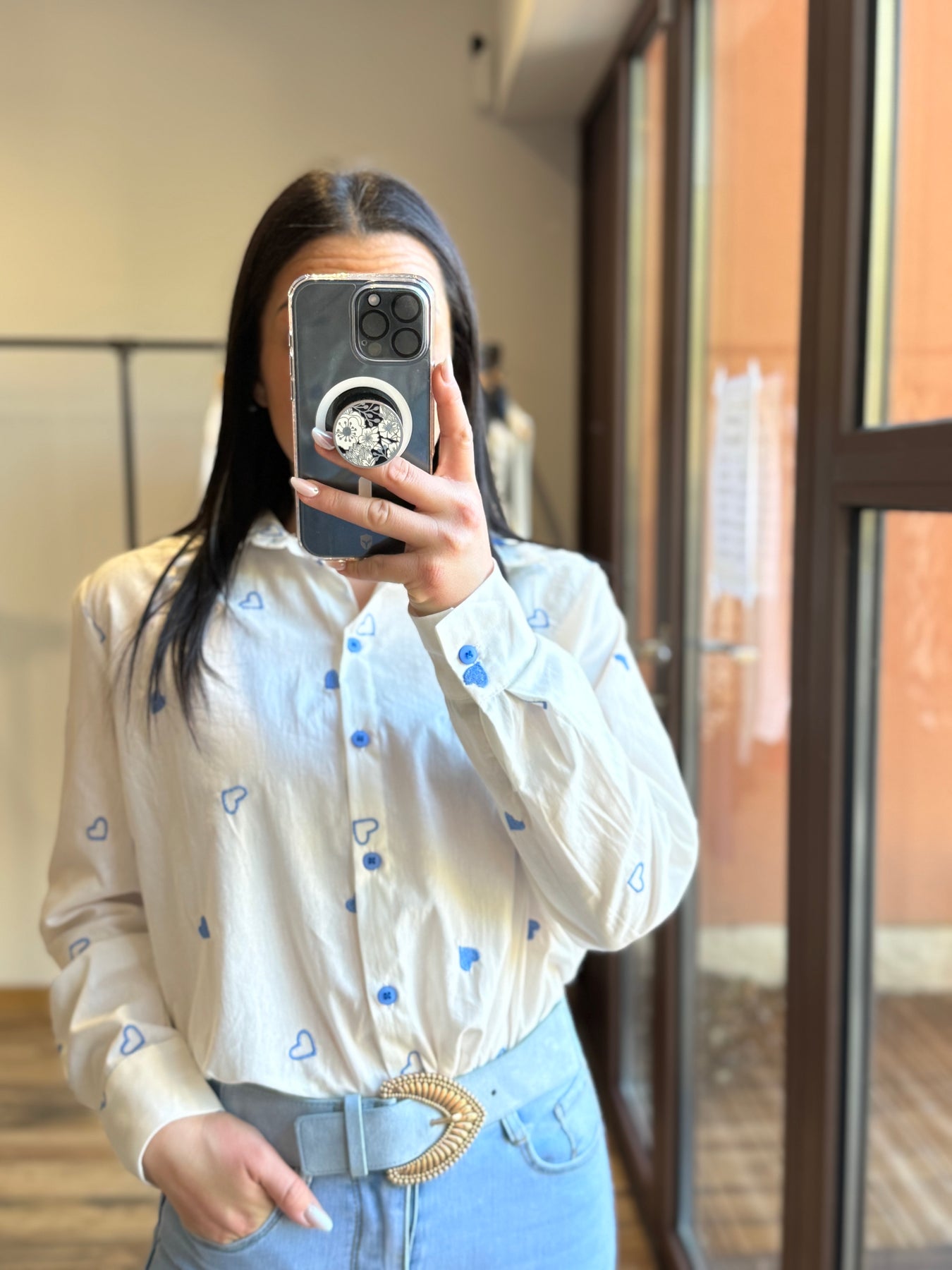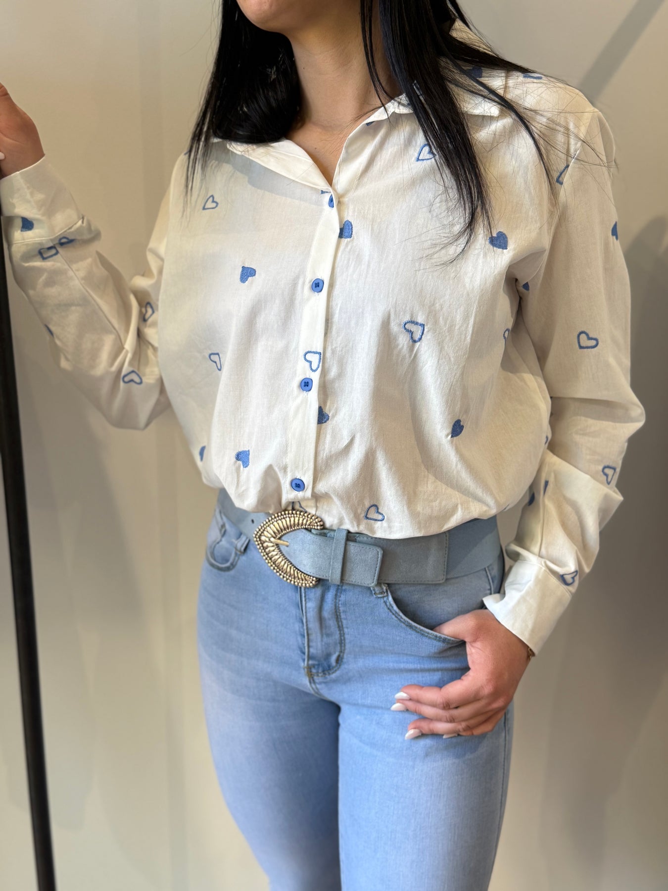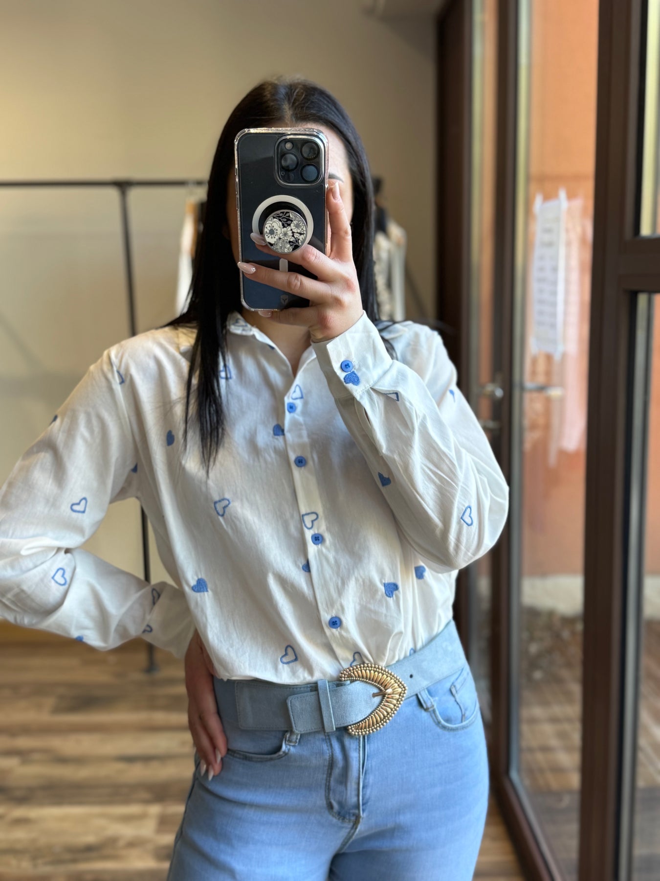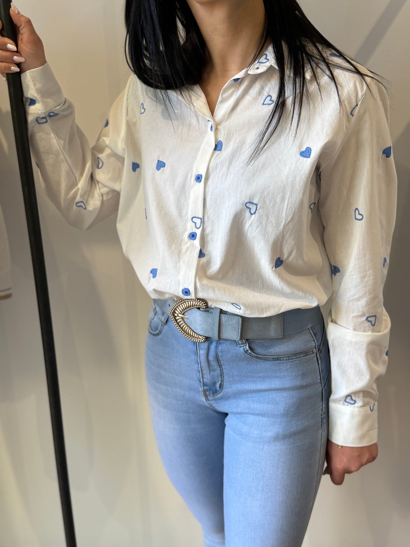 Alicia mesure 1m57 et met du 36 elle porte la chemise avec le jean Mandyse et la ceinture bleu