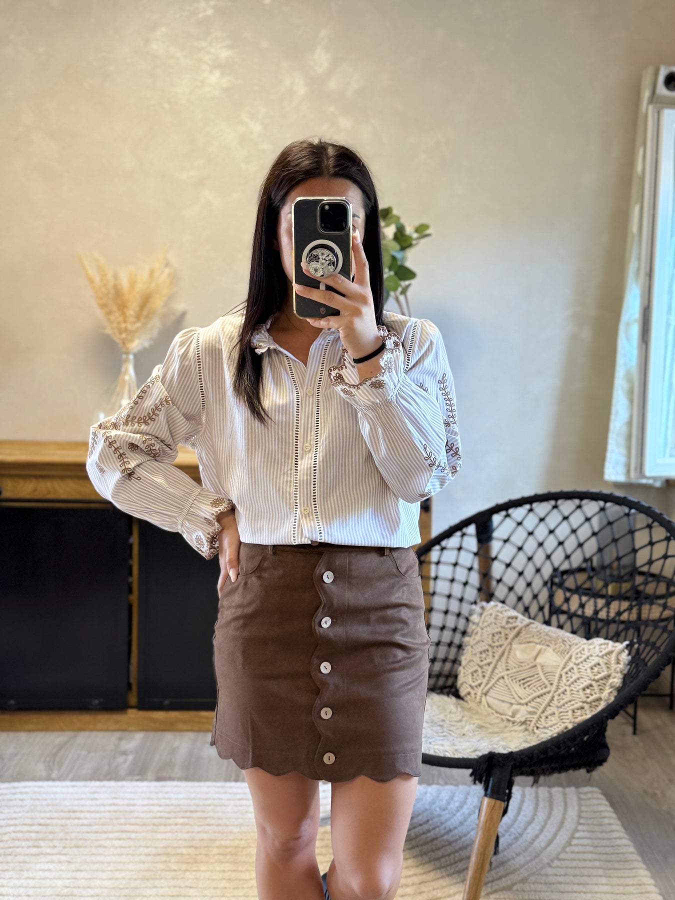 Alicia (1m57, porte du 36) présente ici la jupe Kung associée à la chemise Vilam pour un look élégant et tendance.