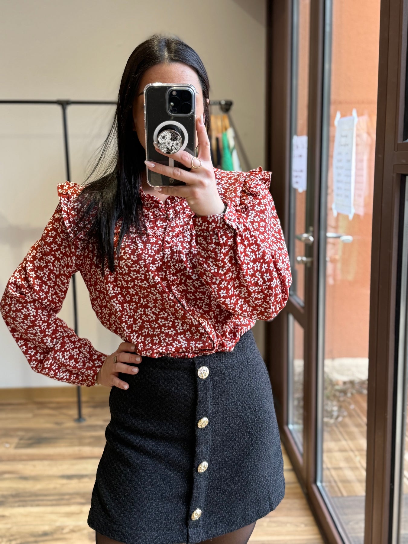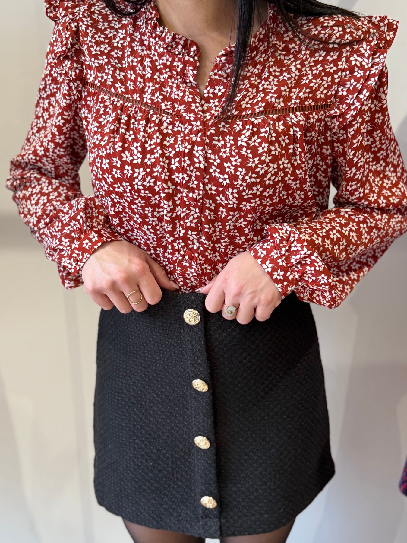 Alicia mesure 1m57 et porte la taille S la jupe short est associé a la chemise Nael