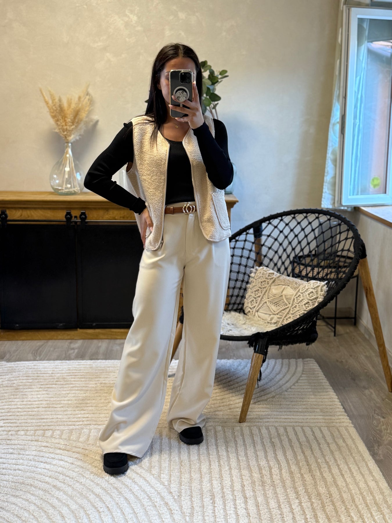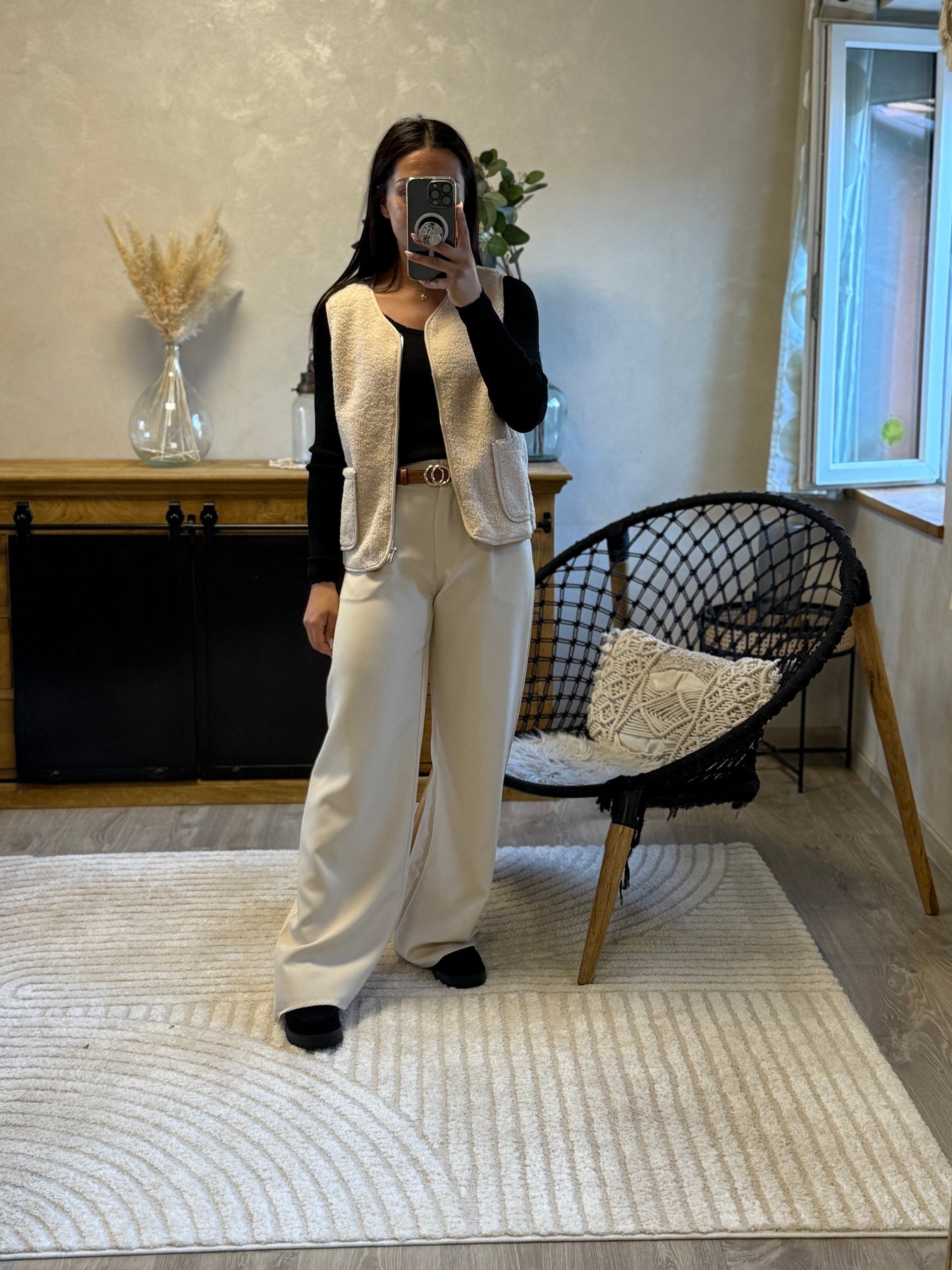 Alicia (1m57, porte du 36) présente ici le pantalon Berlioz beige associé au gilet Yuri et au pull fin Salomon pour un look chic et moderne.