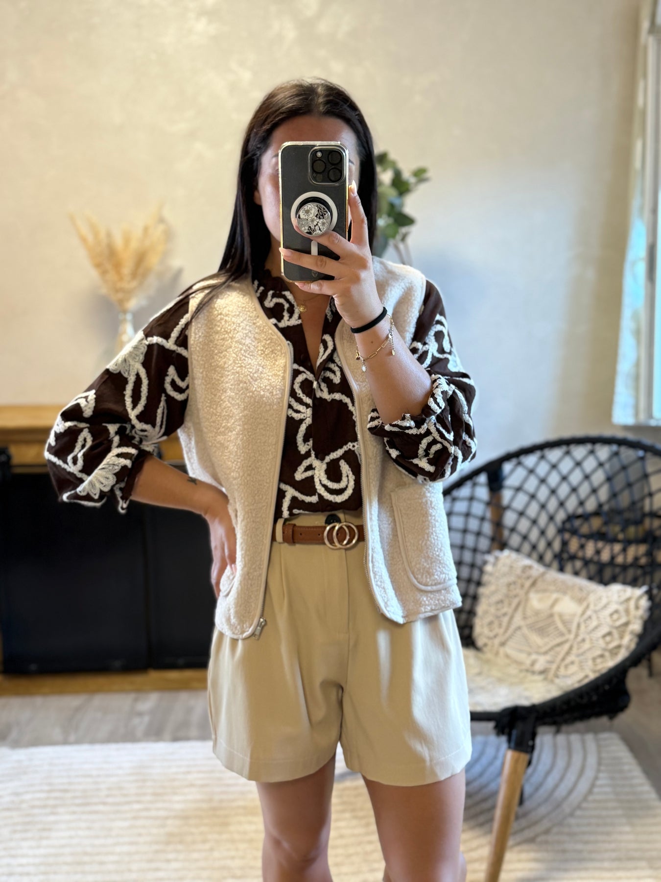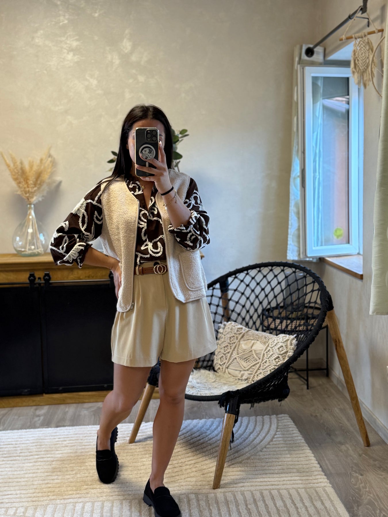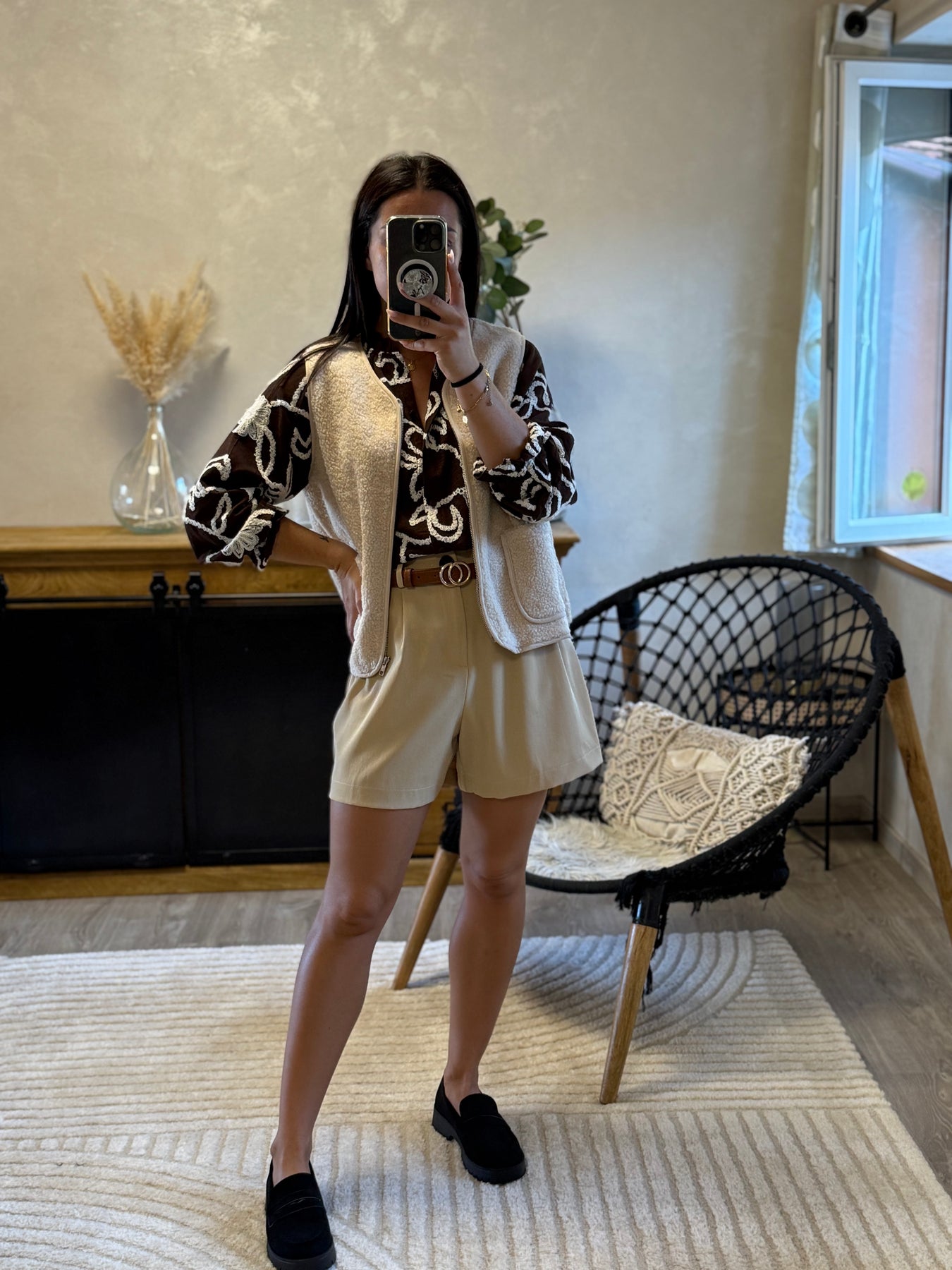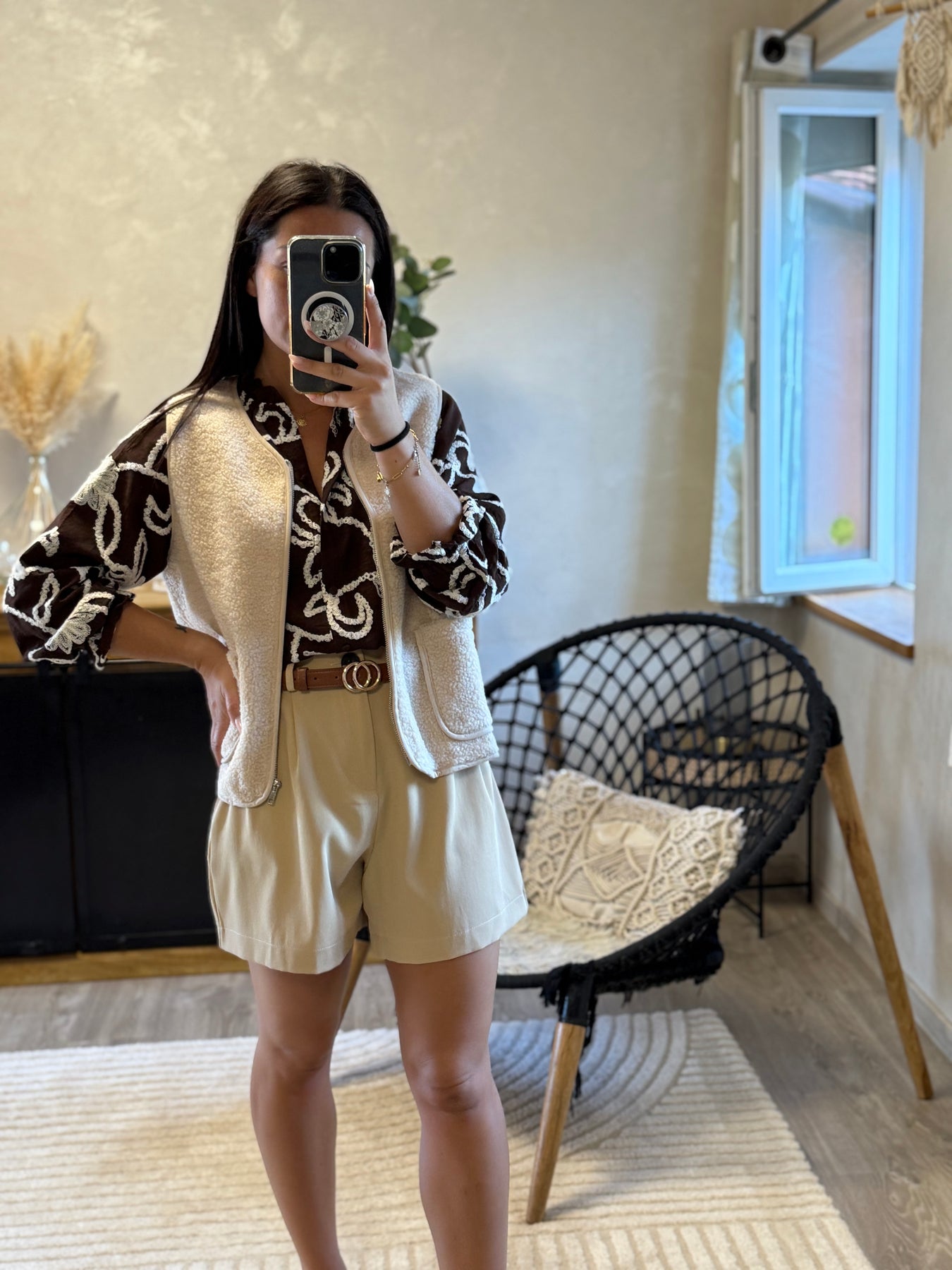 Alicia (1m57, porte du 36) présente ici le short Robin associé à la chemise Dina chocolat et au gilet Yuri pour un look casual chic.
