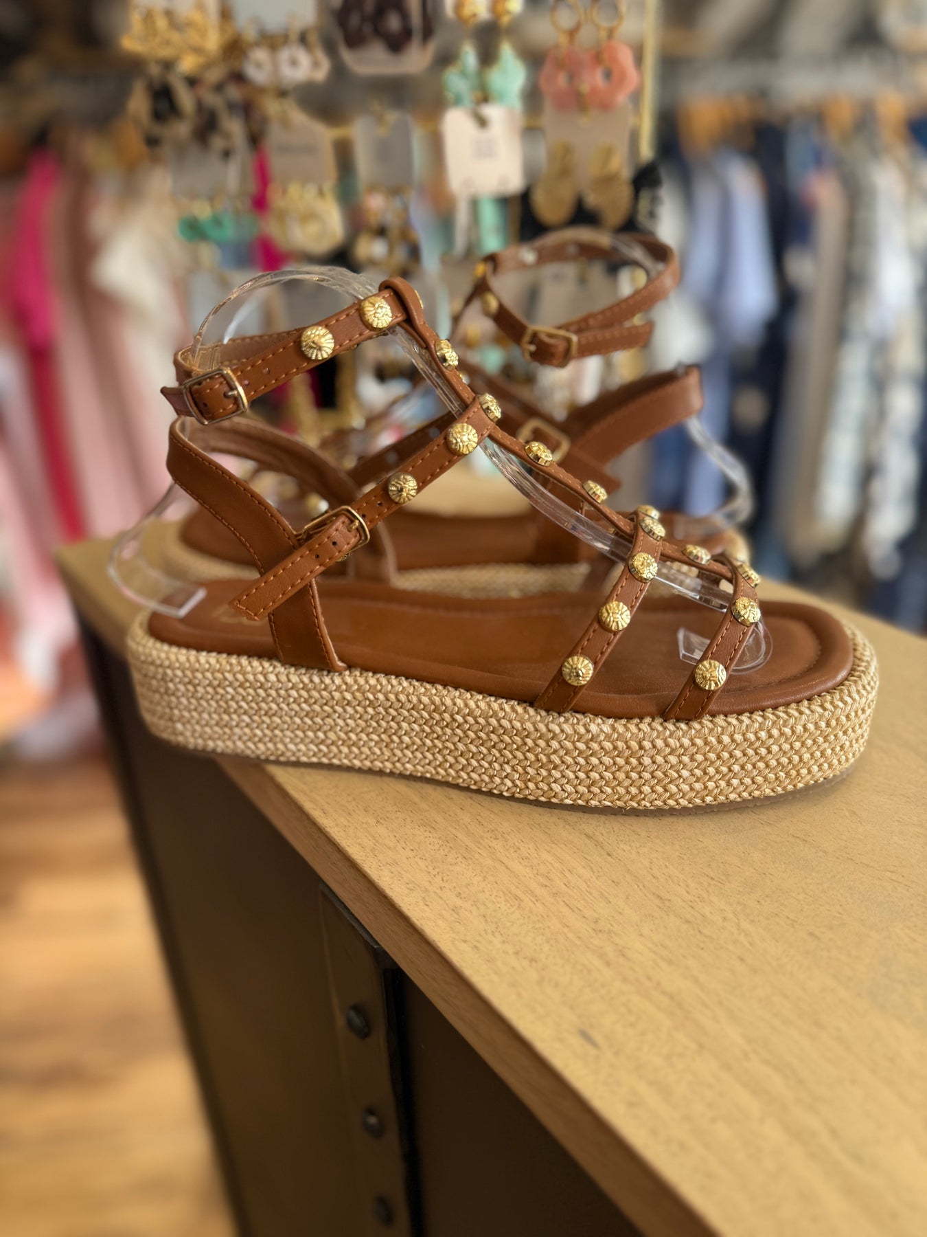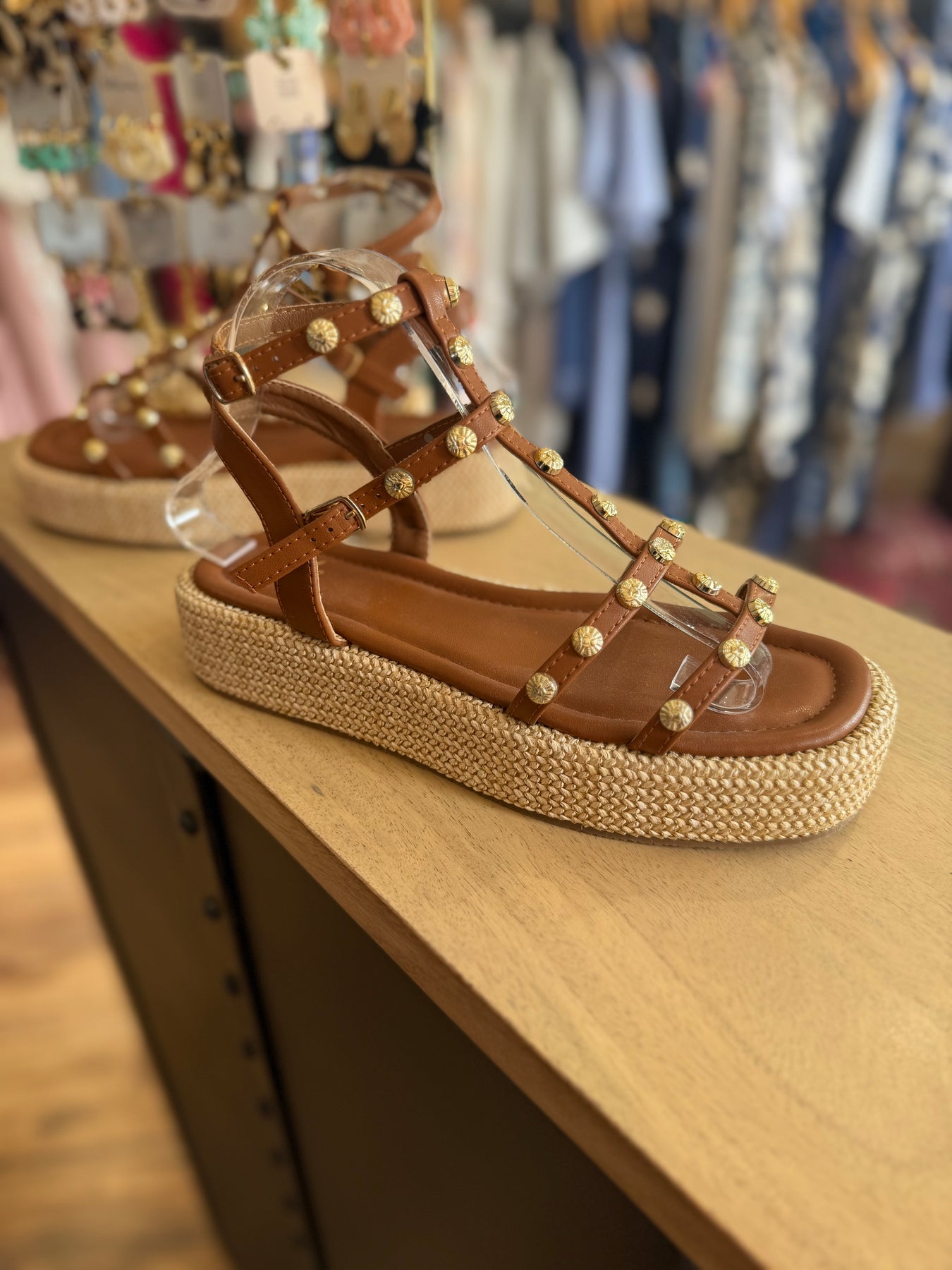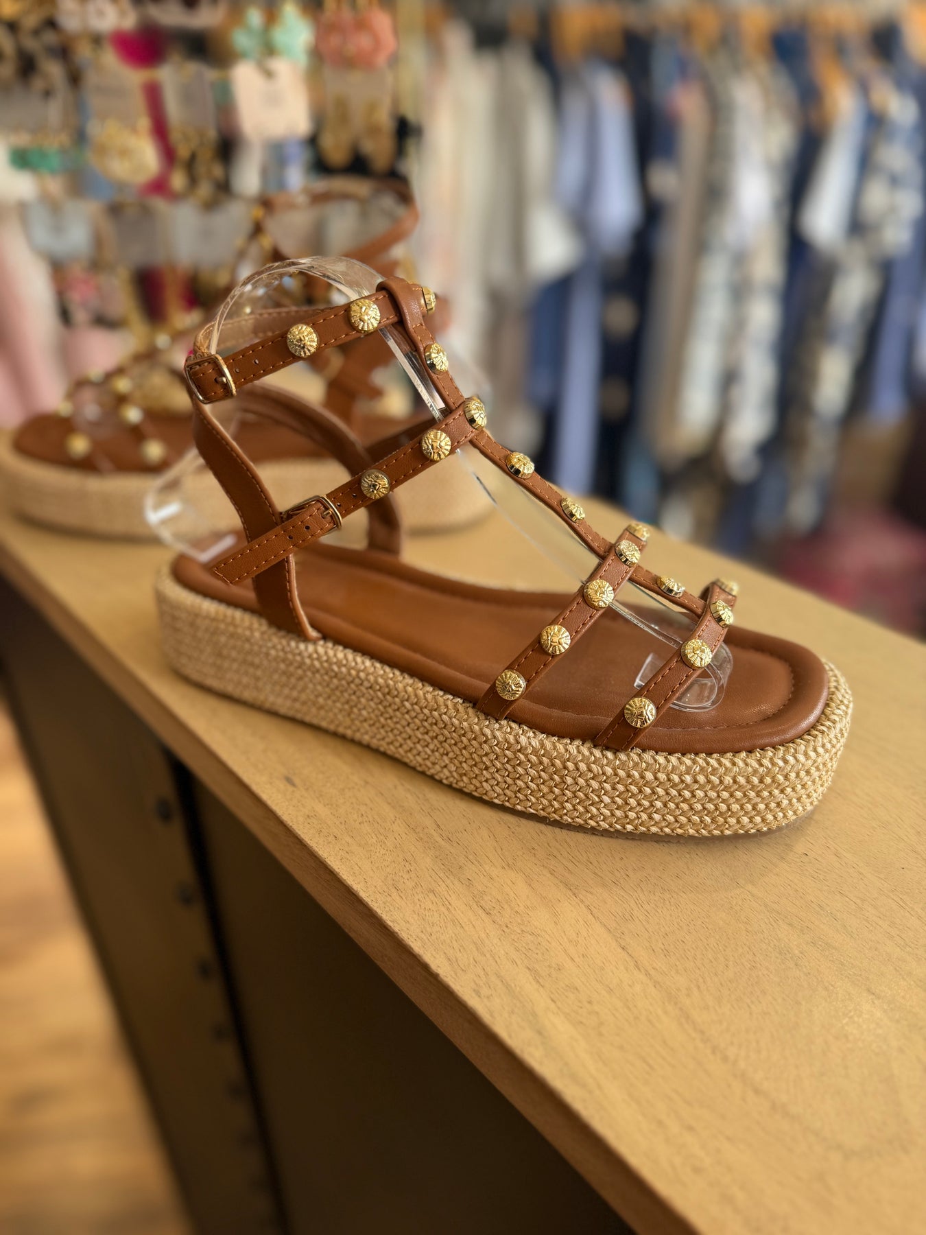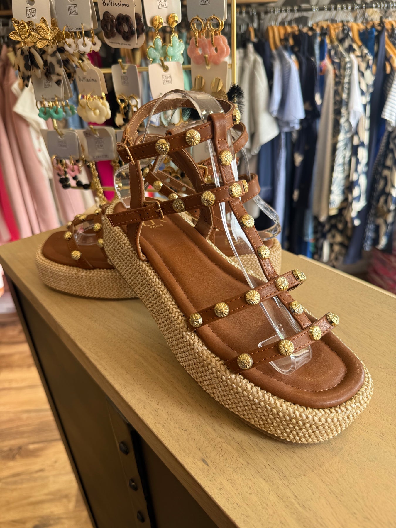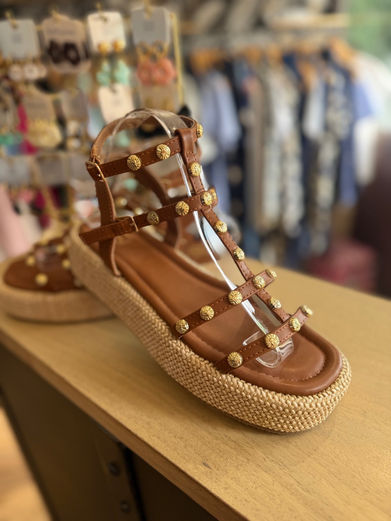 - Matière : semelle effet corde tressée, brides fines décorées de petits clous dorés