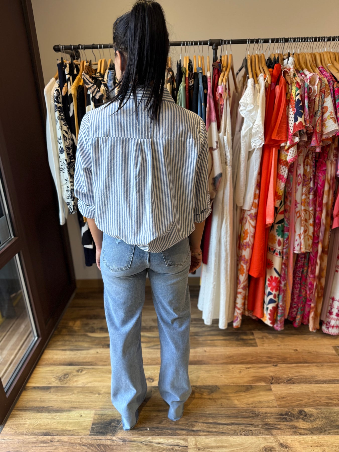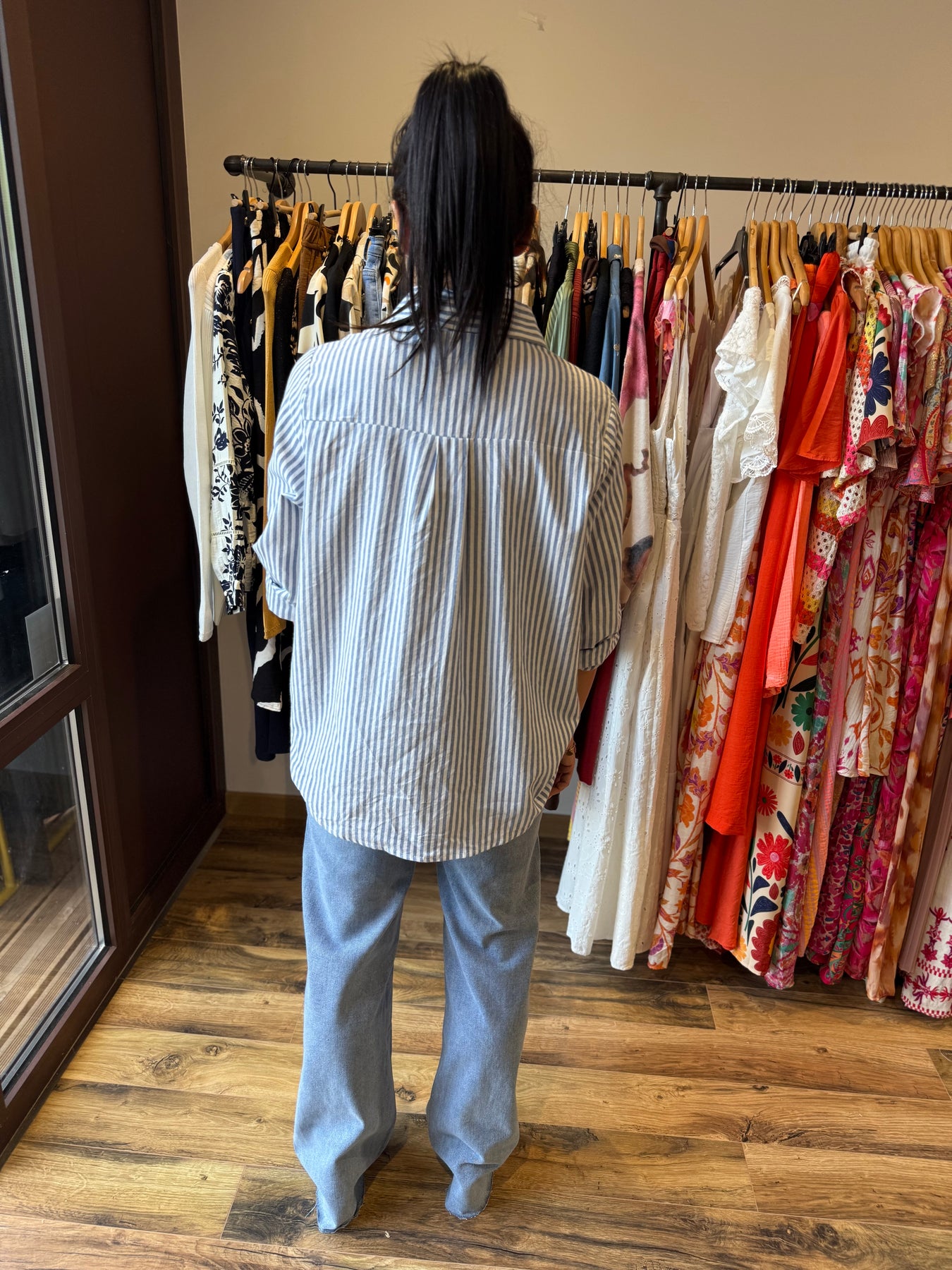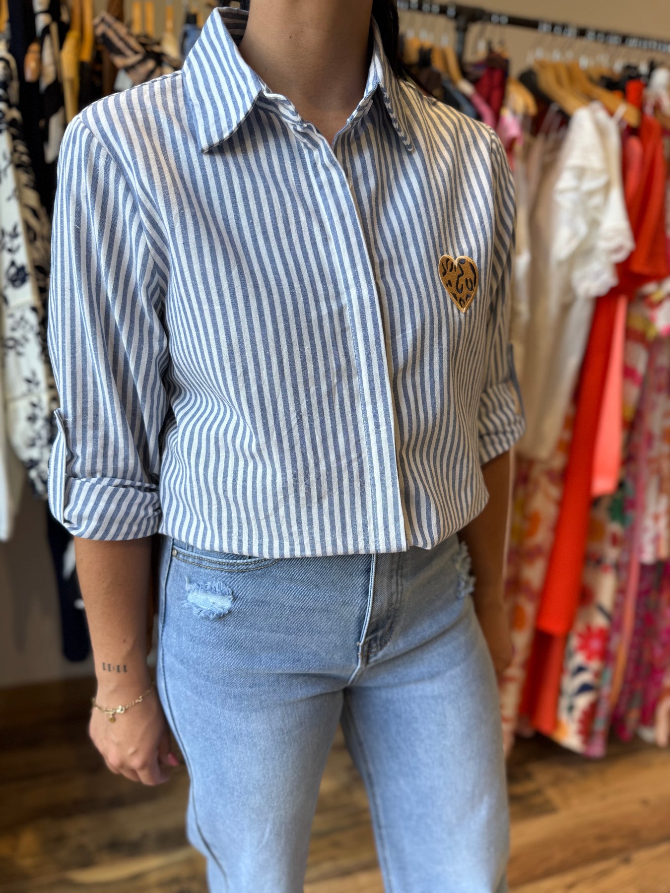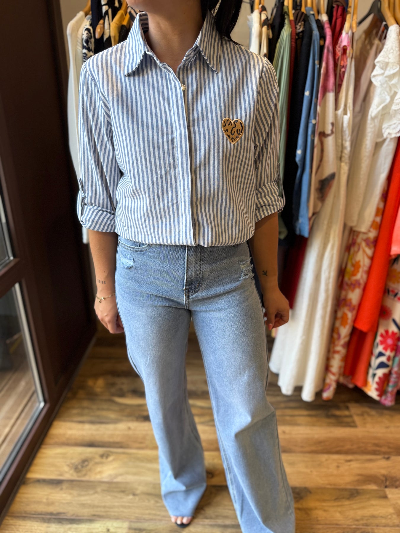 La chemise “Lana” revient en version Curvy, tout aussi tendance et confortable ✨. Ses rayures bleues et blanches apportent une touche classique, twistée par le détail cœur léopard brodé. Facile à porter, elle se marie parfaitement avec un jean comme l’Antho pour un look casual chic, ou un pantalon habillé pour plus d’élégance.