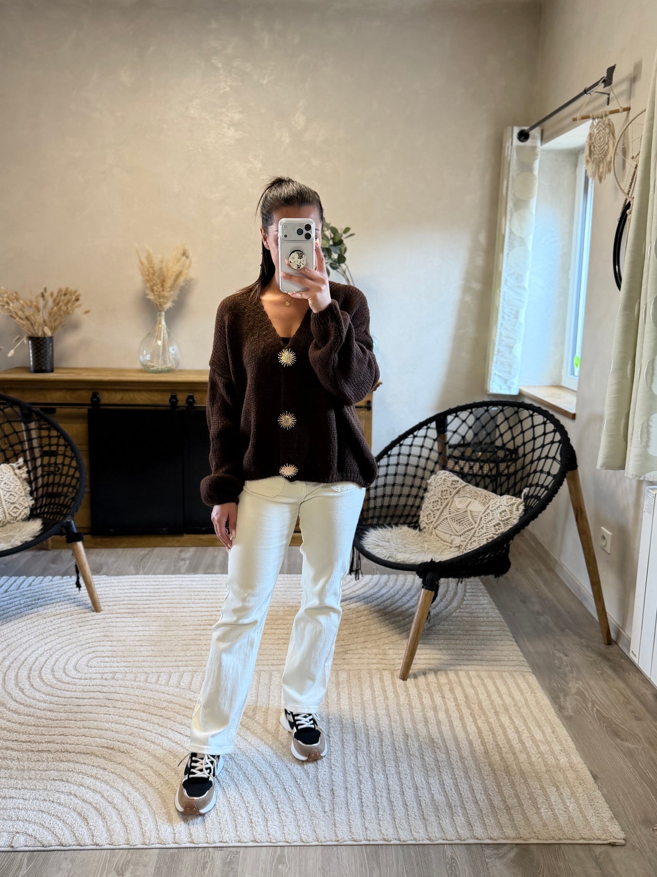 Le gilet Betty est une pièce originale et chaleureuse ✨. Ses broches “soleil” amovibles ajoutent une touche unique et stylée, tandis que la maille douce garantit confort et élégance. À porter ouvert sur une blouse ou fermé comme un pull, il s’adapte à toutes vos envies 🤎.