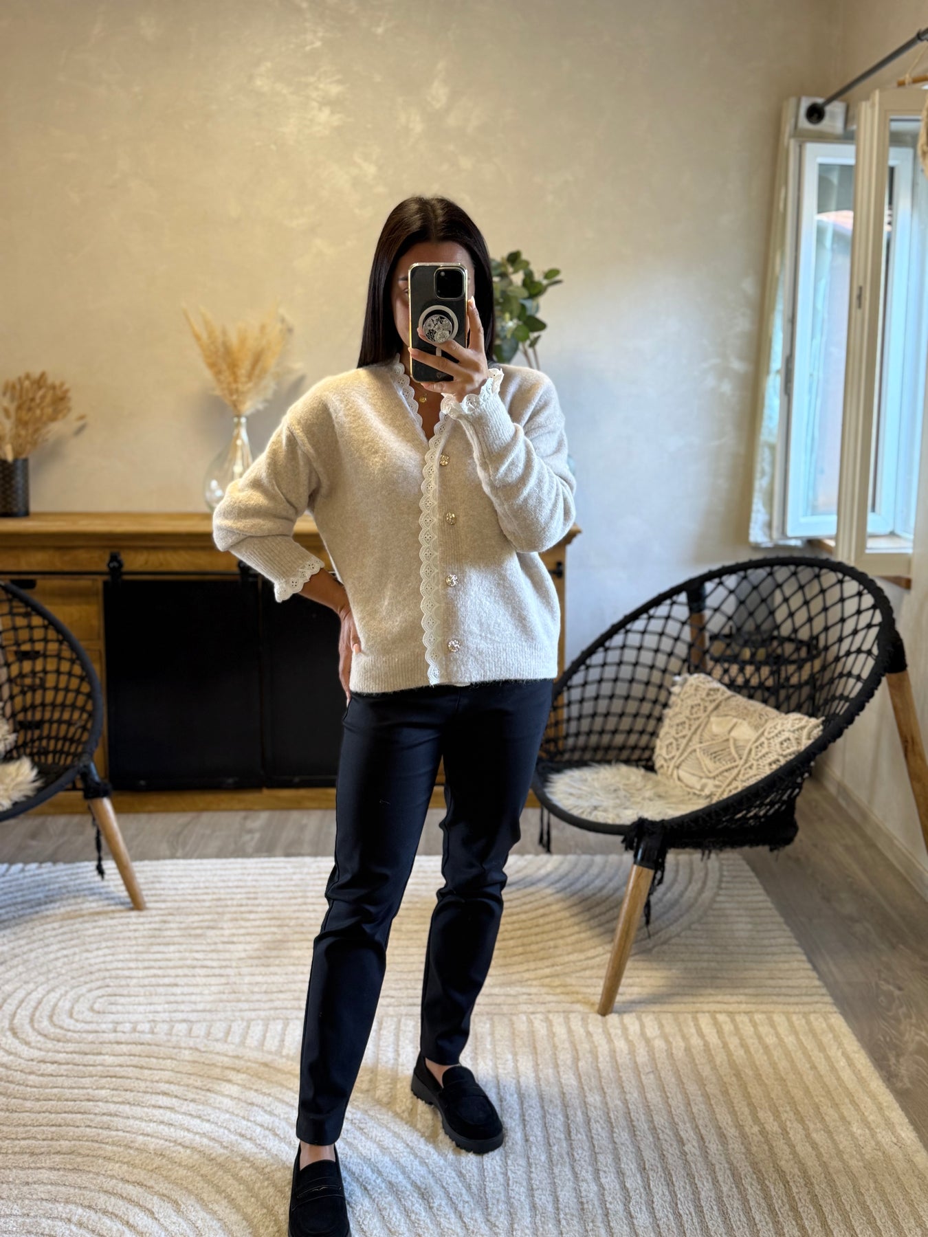 Le gilet Ursule Curvy reprend le charme du modèle classique, adapté aux courbes 🌸. Doux et élégant, il se distingue par ses finitions dentelle et ses boutons bijoux raffinés. Une pièce chic et cosy à associer avec un jean ou un pantalon habillé pour un look tendance et confortable.