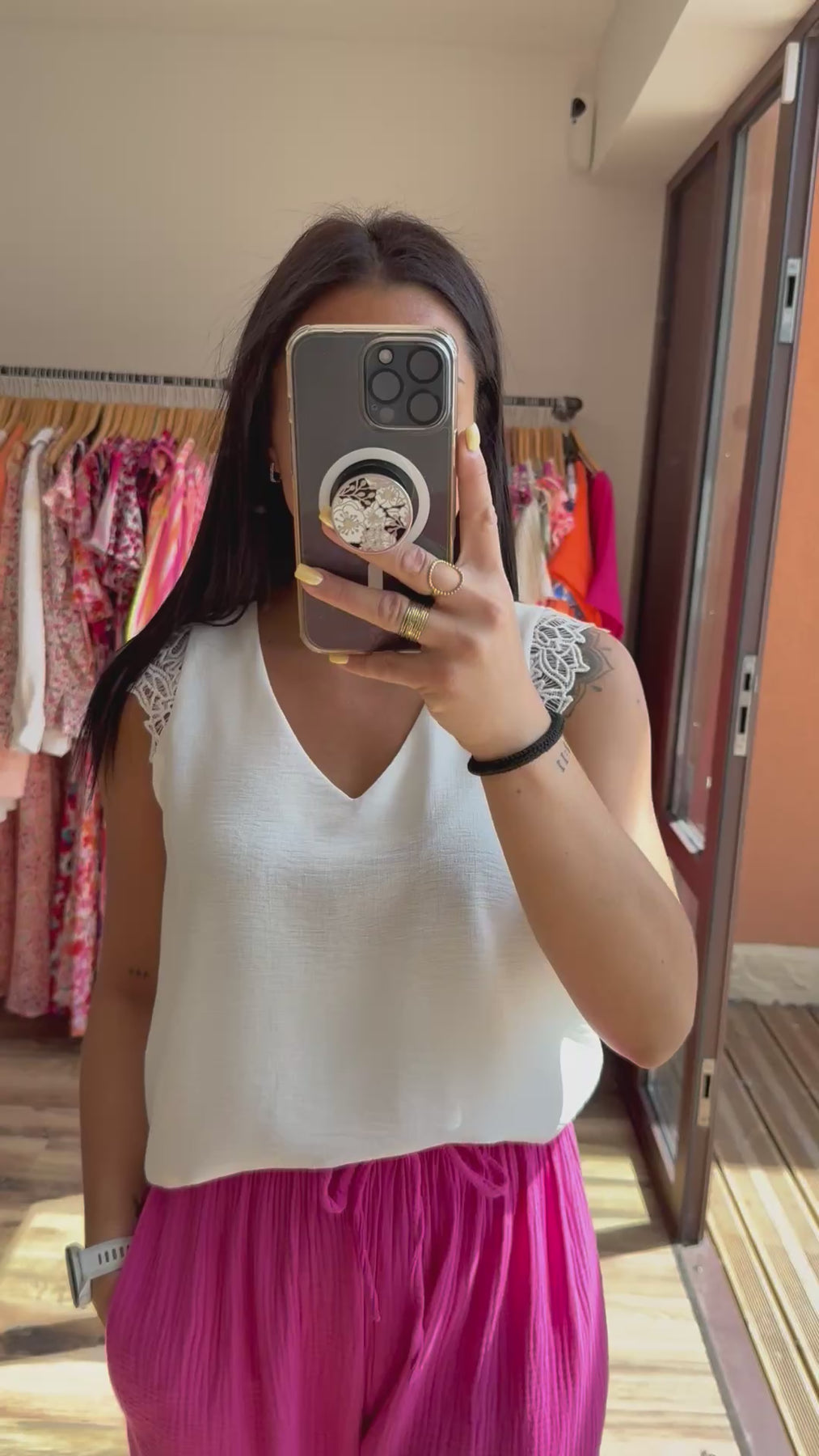 Sa matière en gaze de coton est douce, aérienne, et ne colle pas à la peau même par fortes chaleurs. Le coloris fuchsia illumine le look et flatte toutes les carnations.