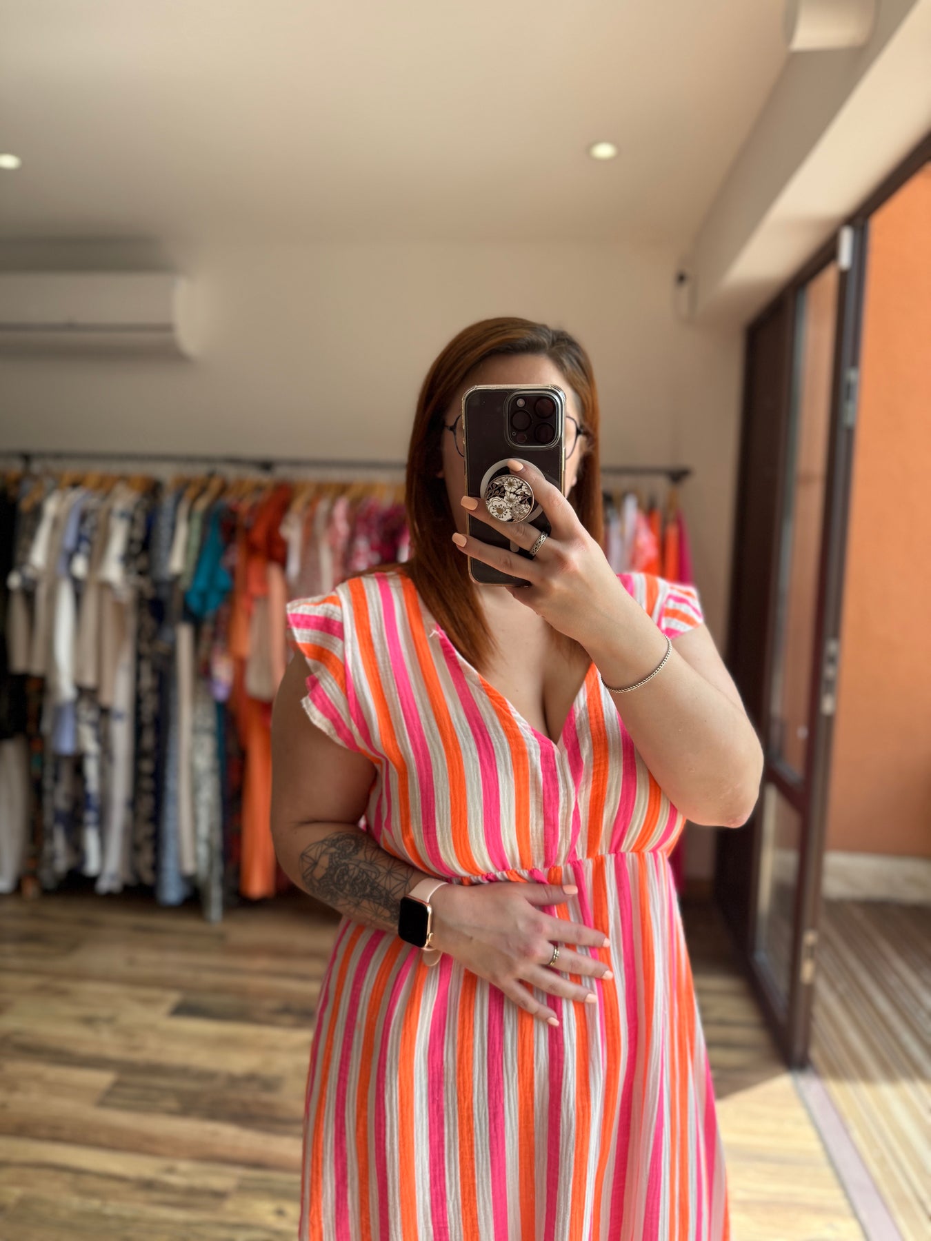 La robe Ivanna est la pièce idéale pour un été plein de peps : avec ses rayures colorées et sa coupe fluide, elle allonge la silhouette tout en assurant un confort absolu. Parfaite avec des sandales plates pour une sortie décontractée ou des accessoires dorés pour un look plus chic. 🌞