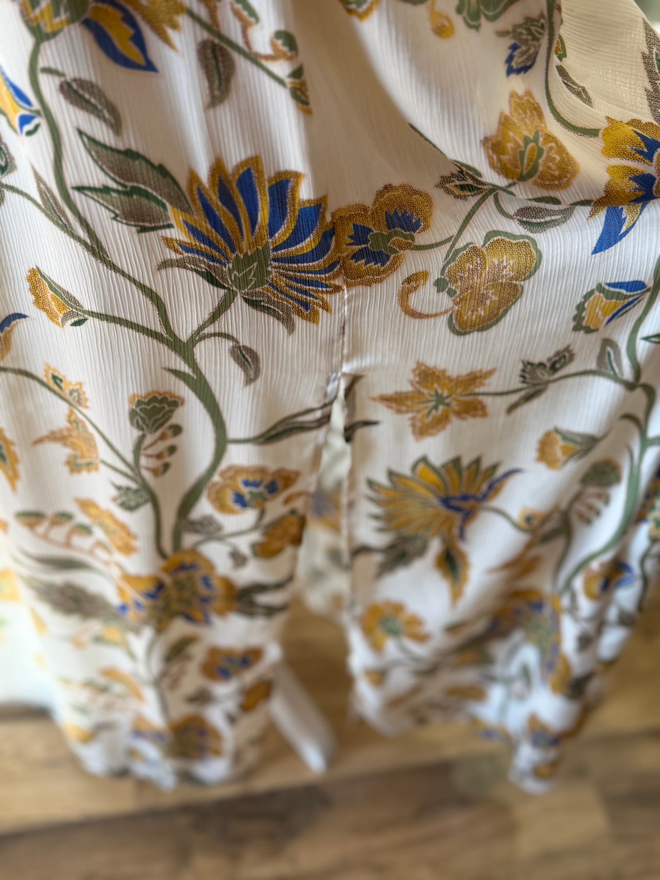 - Fond crème avec imprimé floral jaune, bleu et vert