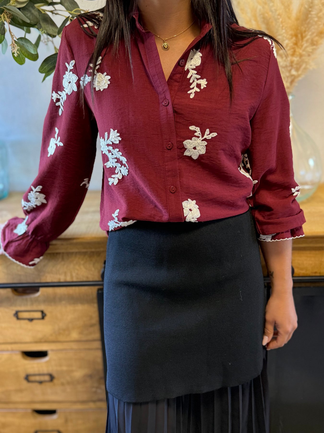 🍷 Chemise “Elisa Curvy” – Élégance bordeaux et broderies raffinées