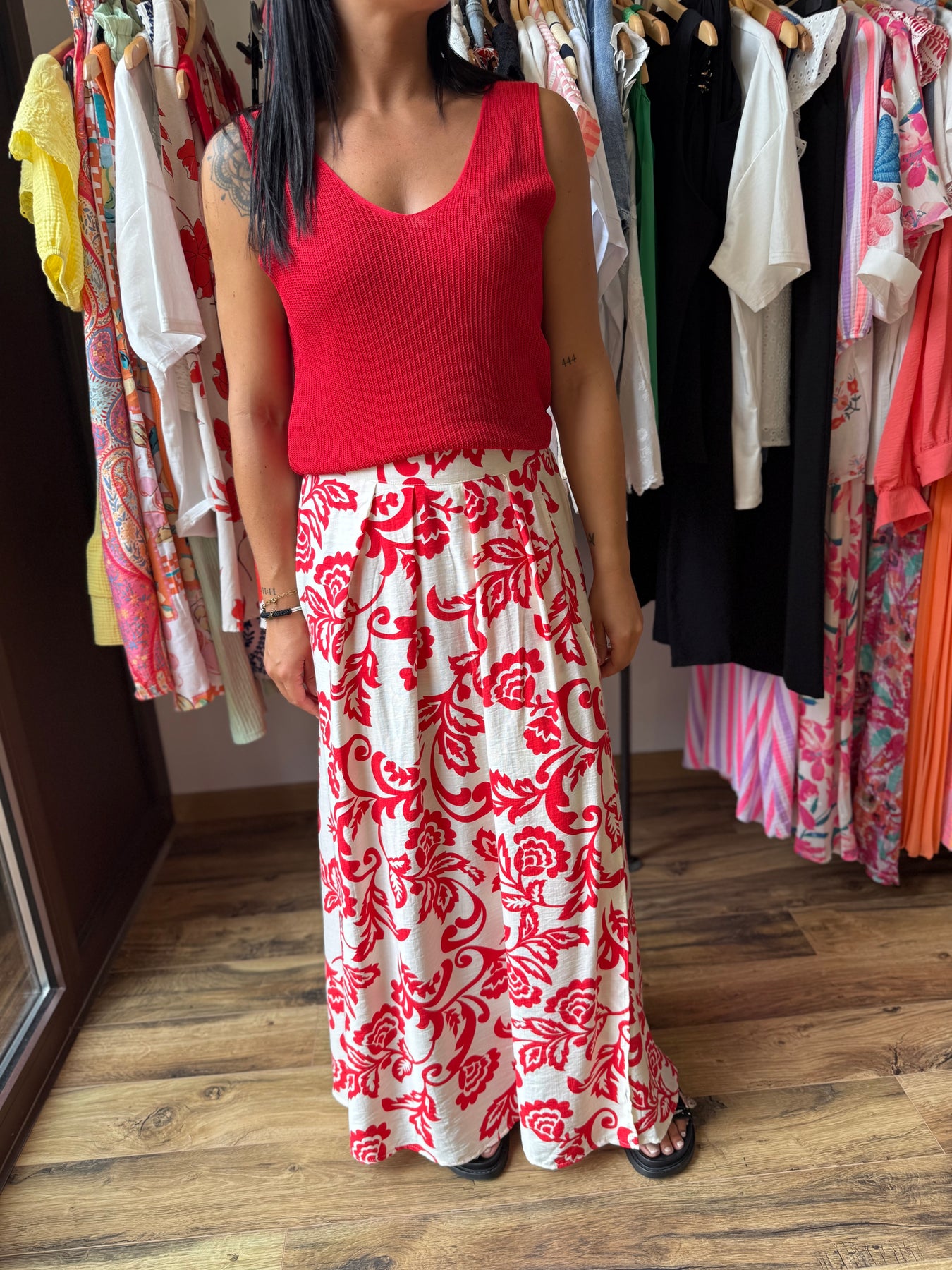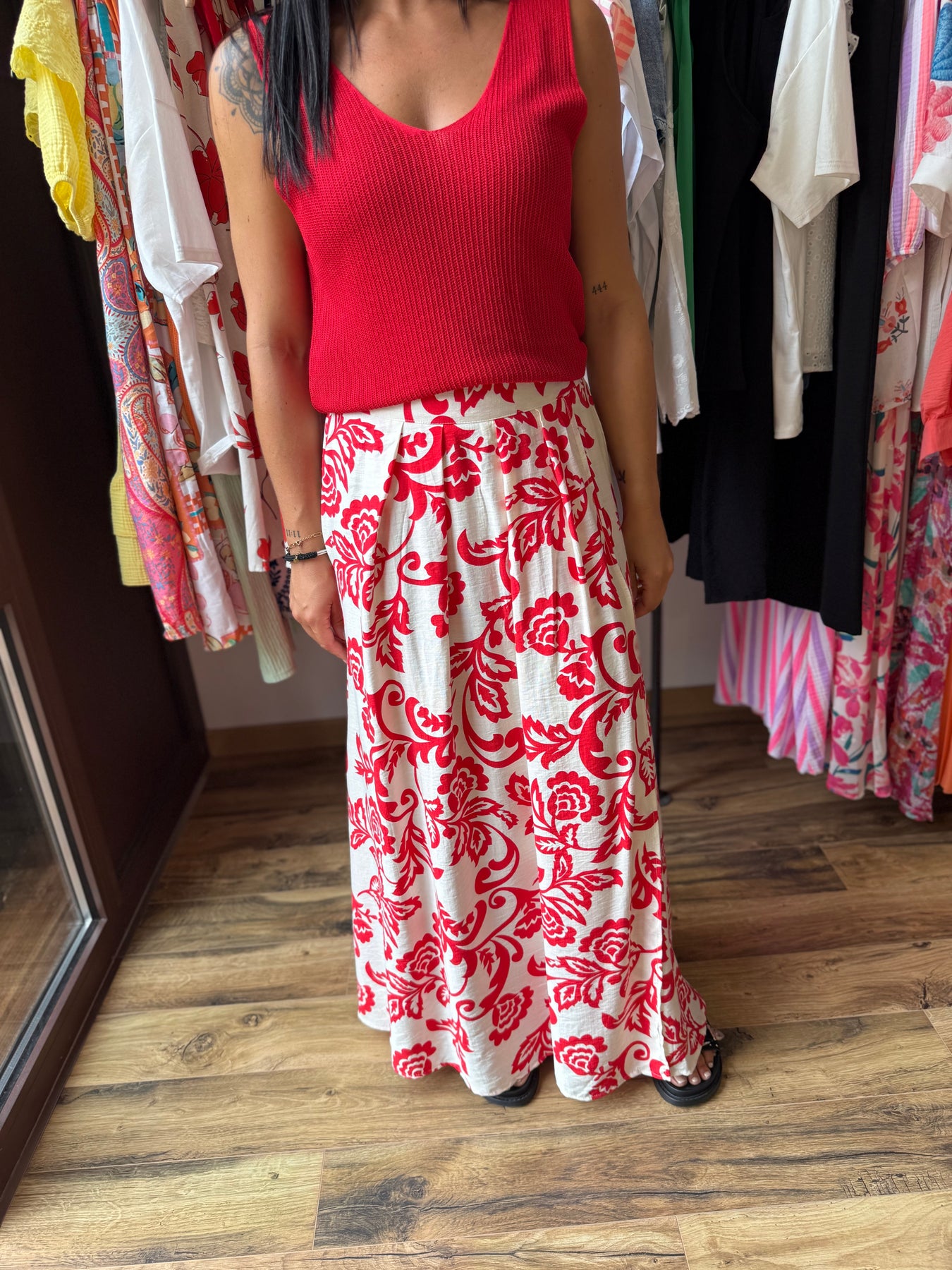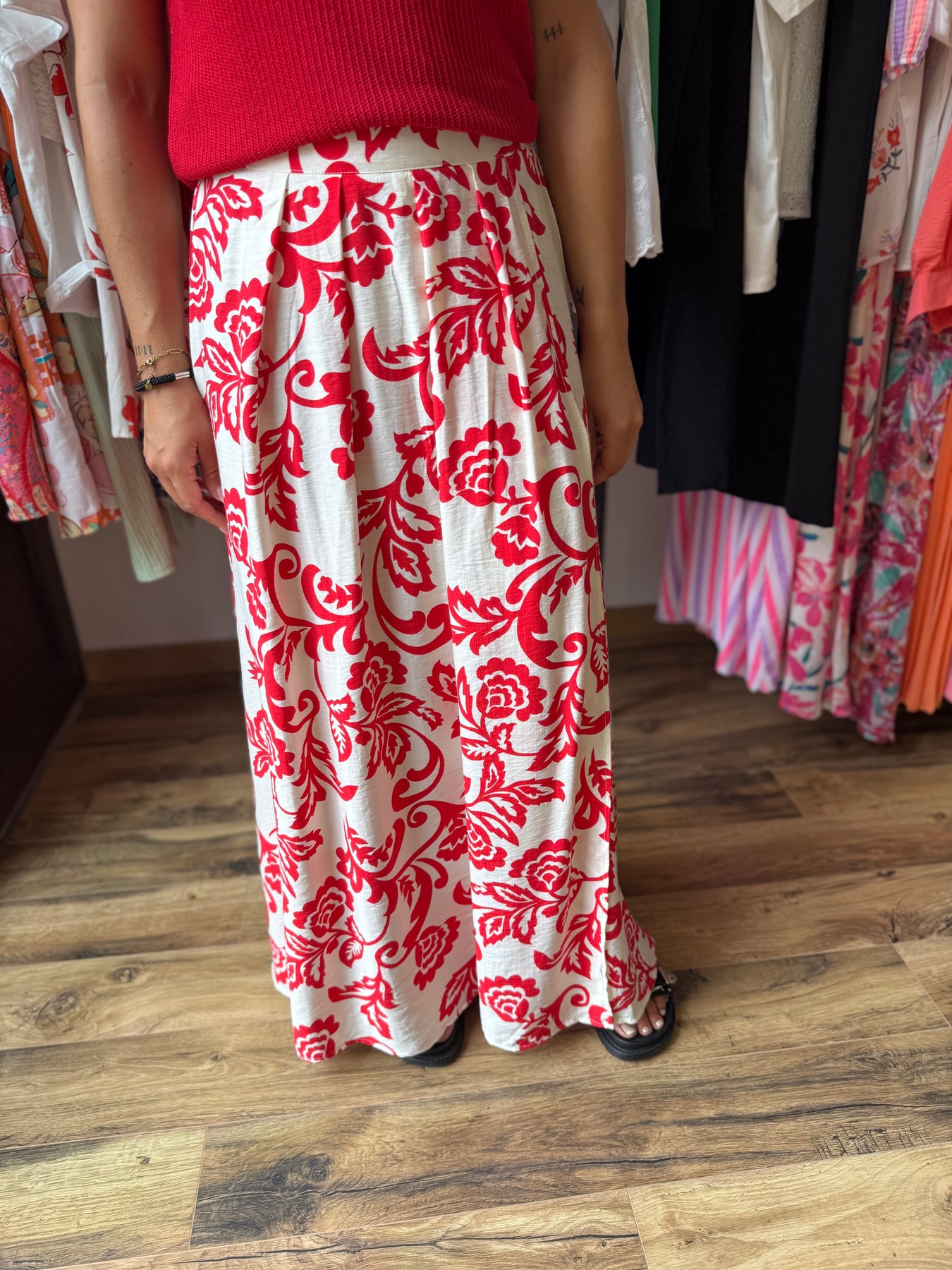 La jupe “Uxia” c’est l’élégance avec une touche de caractère 💃 Son imprimé rouge audacieux sur fond clair évoque un esprit bohème chic et solaire. On la porte ici avec le top “Odile” rouge pour un total look éclatant, mais elle fonctionne aussi très bien avec un top blanc, noir ou beige. Une pièce forte, facile à matcher, qui donne de l’allure à toutes les silhouettes.