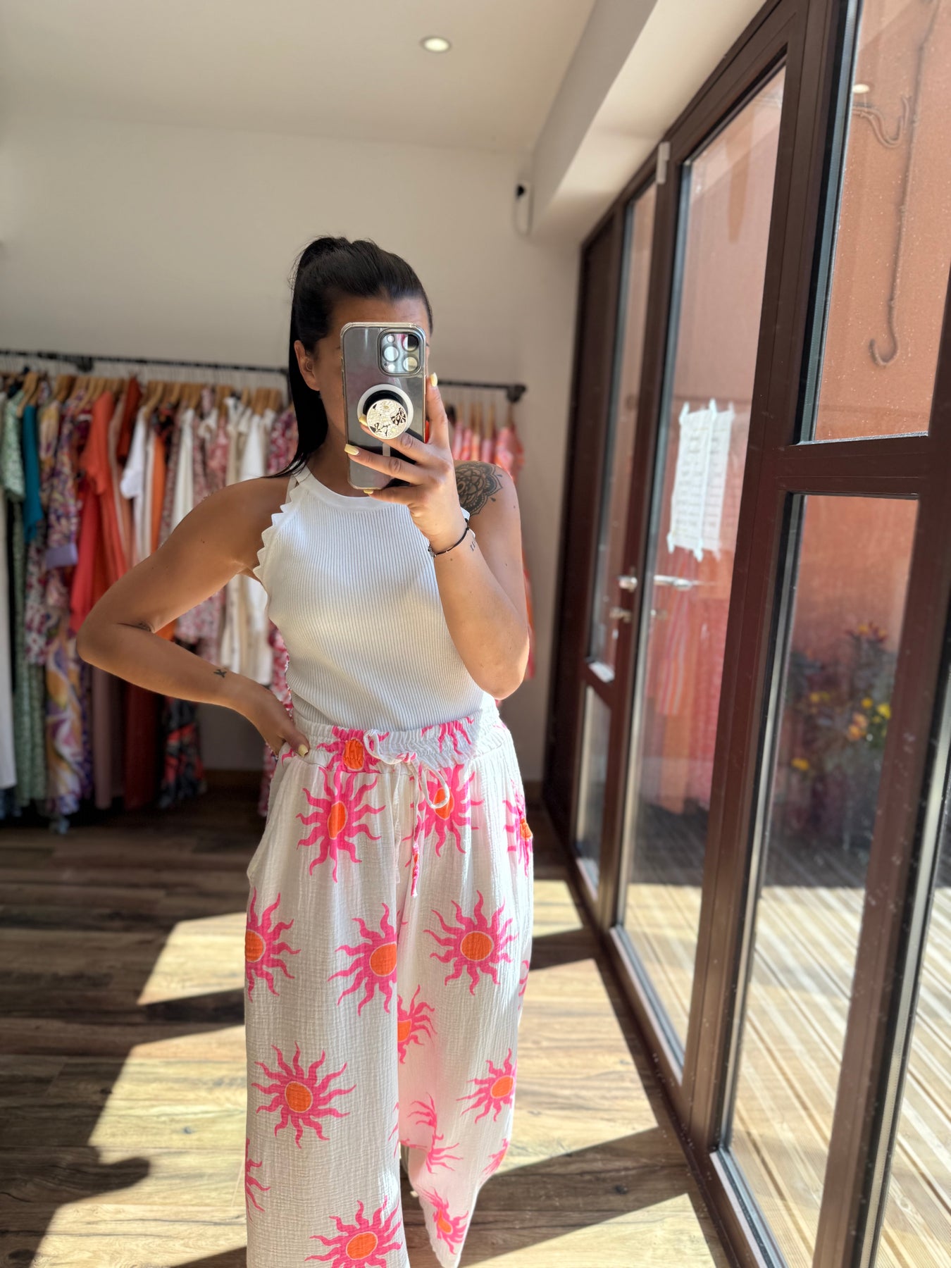 Un pantalon ultra vitaminé qui apporte une touche fun et estivale à vos tenues. À mixer avec un top uni pour laisser parler l’imprimé ou avec un débardeur côtelé pour un look casual et confortable. Idéal pour vos journées ensoleillées ou vos soirées d’été décontractées ! 🌞✨
