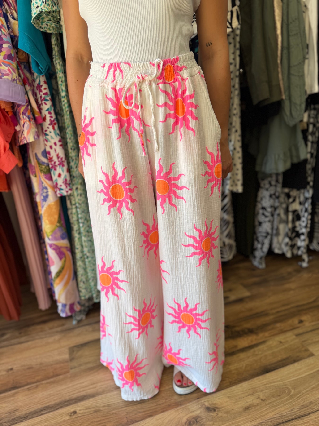 Pantalon Sienda – fluide en gaze de coton, imprimé soleil flashy