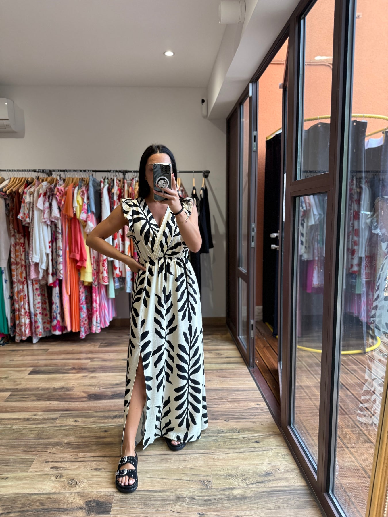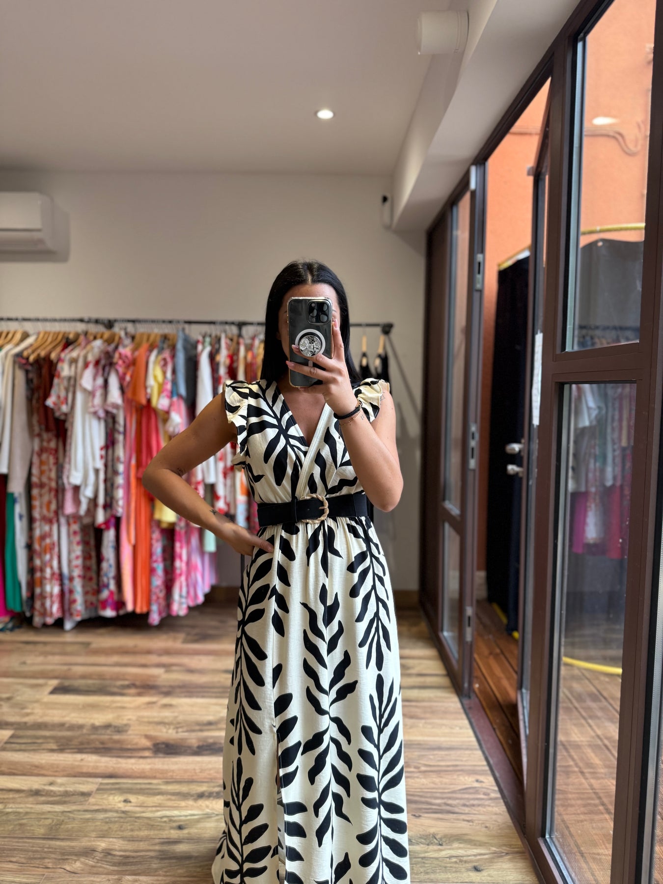 Son imprimé feuillage noir sur fond crème lui donne un style à la fois graphique et naturel 🌿 C’est la robe idéale pour celles qui veulent une pièce forte mais facile à porter. On la porte avec des sandales ou des espadrilles, un chignon flou et un grand panier pour un look effortless et classe ✨