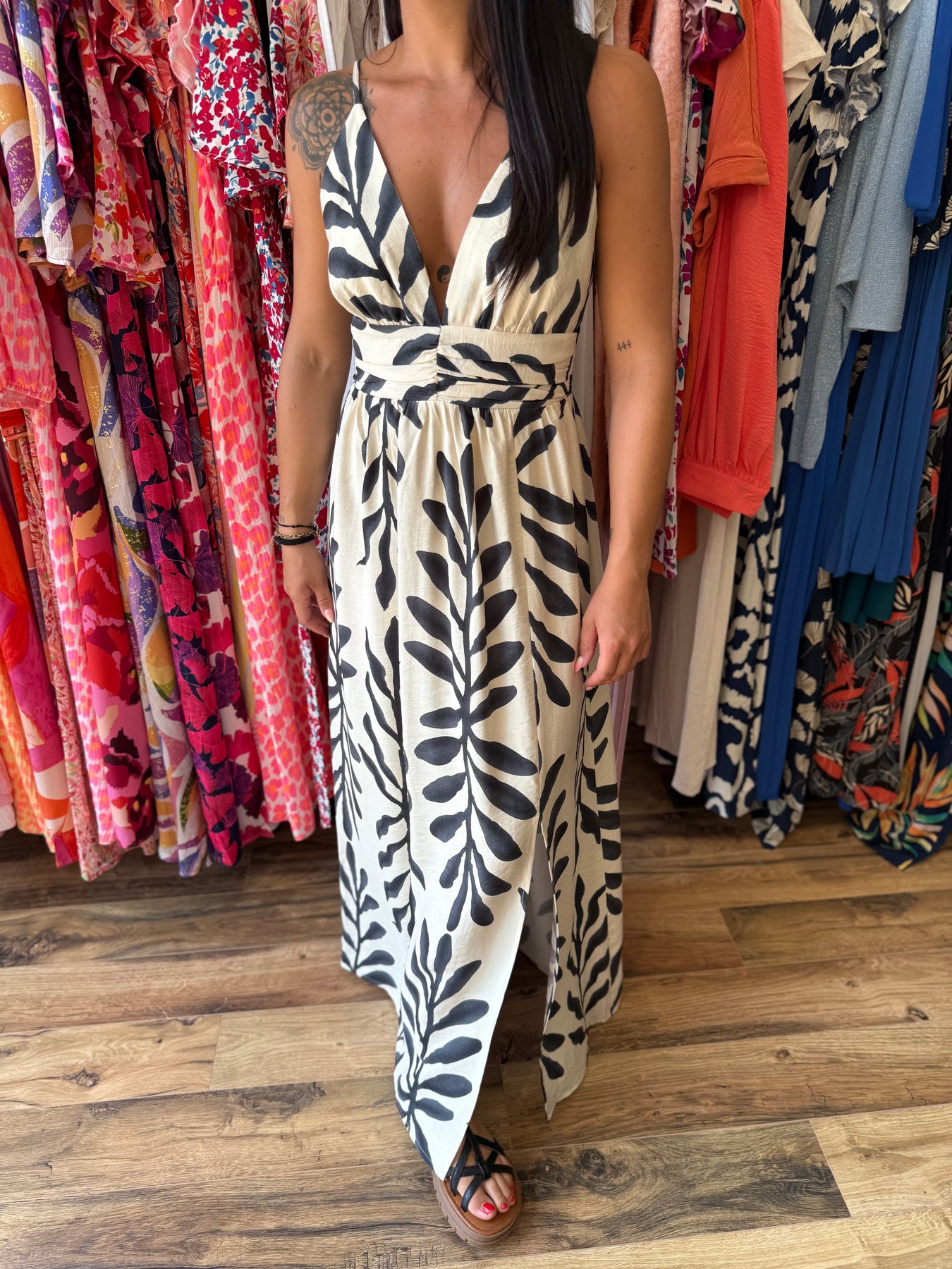 Son décolleté plongeant structuré, sa coupe fluide et son motif botanique ultra tendance font de la robe Priya un incontournable de l’été. À porter avec des sandales compensées ou plates pour un look bohème, en journée comme en soirée.