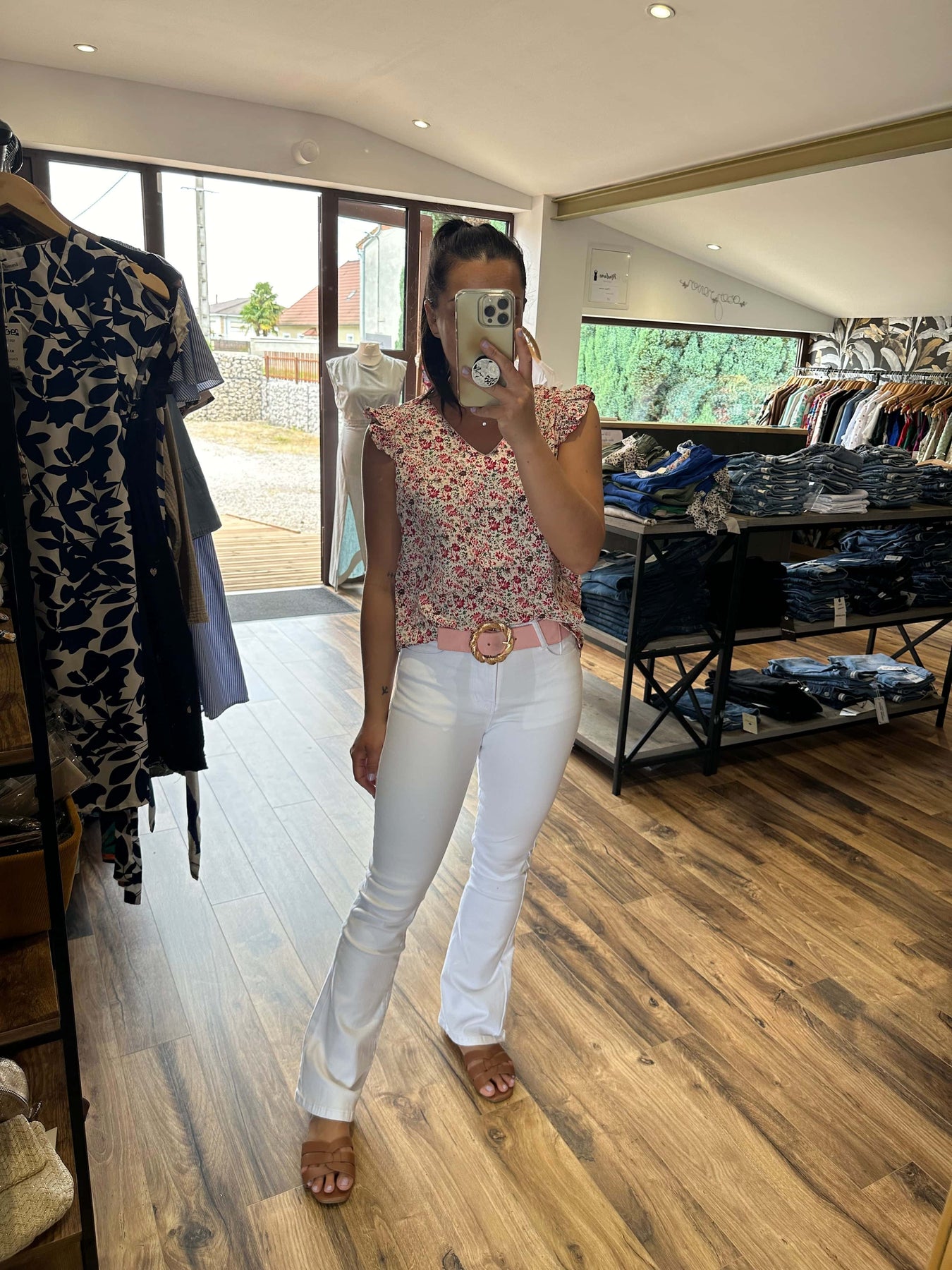 Alicia mesure 1m57 et met du 36 elle porte le top avec le jean flair blanc